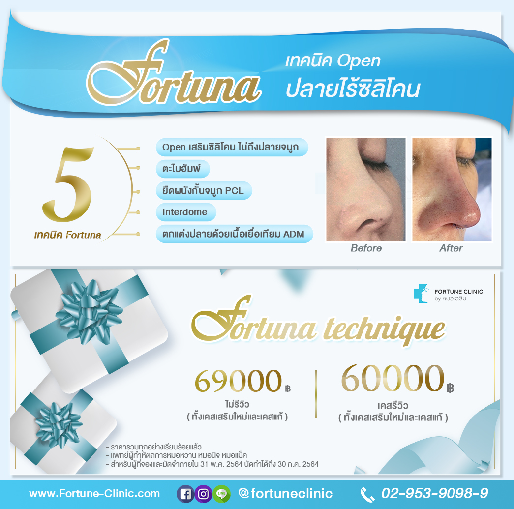 รูปคนไข้ก่อนและหลังการทำจมูกแบบปลายไม่มีซิลิโคน Fortuna Technique โดยการผ่าตัดแบบเปิด ( Open rhinoplasty ) คนไข้มีซิลิโคนอยู่แล้วเดิมแต่อยากแก้จมูกให้ปลายจมูกยาวขึ้น พุ่งขึ้นและปลอดภัย ปลายไม่มีซิลิโคน จึงทำการเปลี่ยนแท่งซิลิโคน เสริมที่สันจมูกเท่านั้น ส่วนปลายใช้กระดูกอ่อนผนังกั้นโพรงจมูกเทียม (Polycarpolactone-PCL plate) มายืดผนังกั้นจมูก ซึ่งส่งผลให้จมูกยาวขึ้น ทำการเย็บอินเตอร์โดม ( Interdomal suture )