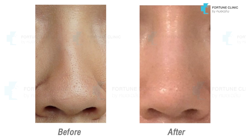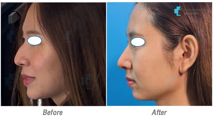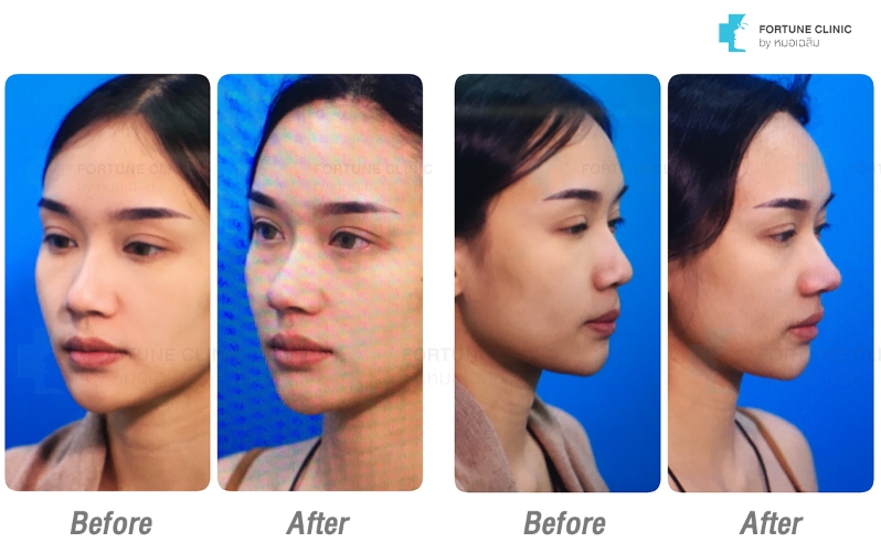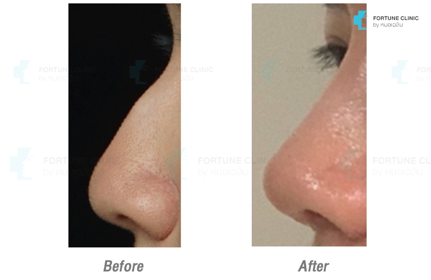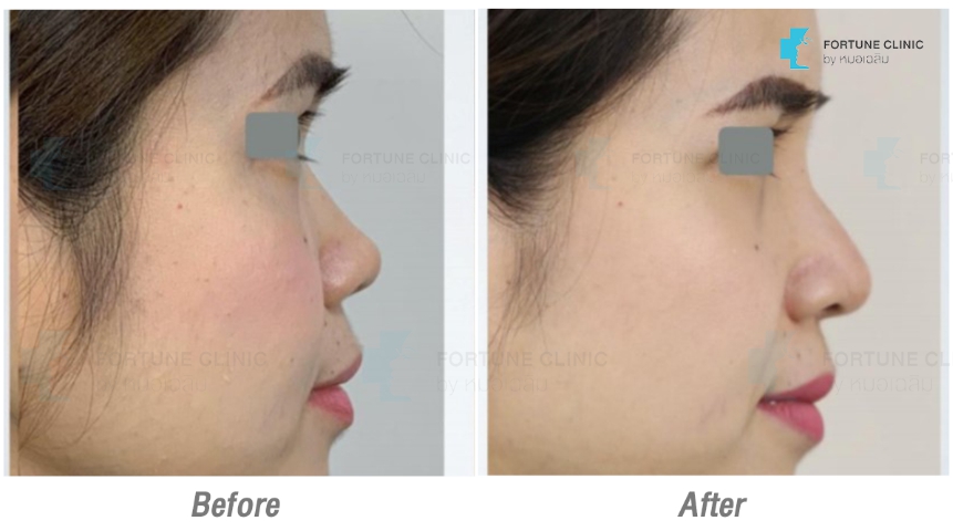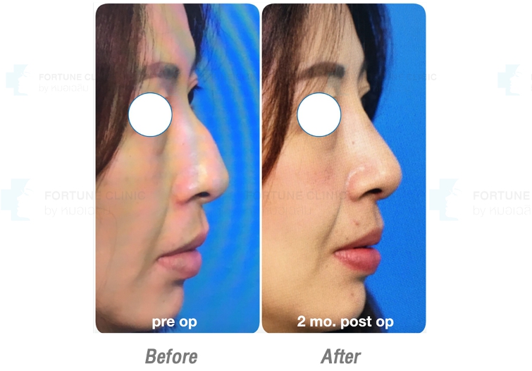 รูปคนไข้ก่อนและหลังการทำจมูกแบบปลายไม่มีซิลิโคน Fortuna Technique โดยการผ่าตัดแบบเปิด ( Open rhinoplasty ) คนไข้มีซิลิโคนอยู่แล้วเดิมแต่อยากแก้จมูกให้ปลายจมูกยาวขึ้น พุ่งขึ้นและปลอดภัย ปลายไม่มีซิลิโคน จึงทำการเปลี่ยนแท่งซิลิโคน เสริมที่สันจมูกเท่านั้น ส่วนปลายใช้กระดูกอ่อนผนังกั้นโพรงจมูกเทียม (Polycarpolactone-PCL plate) มายืดผนังกั้นจมูก ซึ่งส่งผลให้จมูกยาวขึ้น ทำการเย็บอินเตอร์โดม ( Interdomal suture )