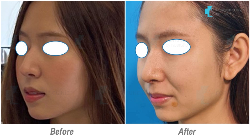 รูปคนไข้ก่อนและหลังการทำจมูกแบบไม่มีซิลิโคนโดยการผ่าตัดแบบปิด ( Closed rhinoplasty ) ใช้การเสริมสันจมูกและรองปลายให้พุ่งด้วย เนื้อเยื่อเทียม (Acellular Dermal Matrix-ADM) ทั้งหมด (อ่านเพิ่มเติมได้ที่: การใช้เนื้อเยื่อเทียม ADM ในการเสริมจมูกและรองปลายจมูก)