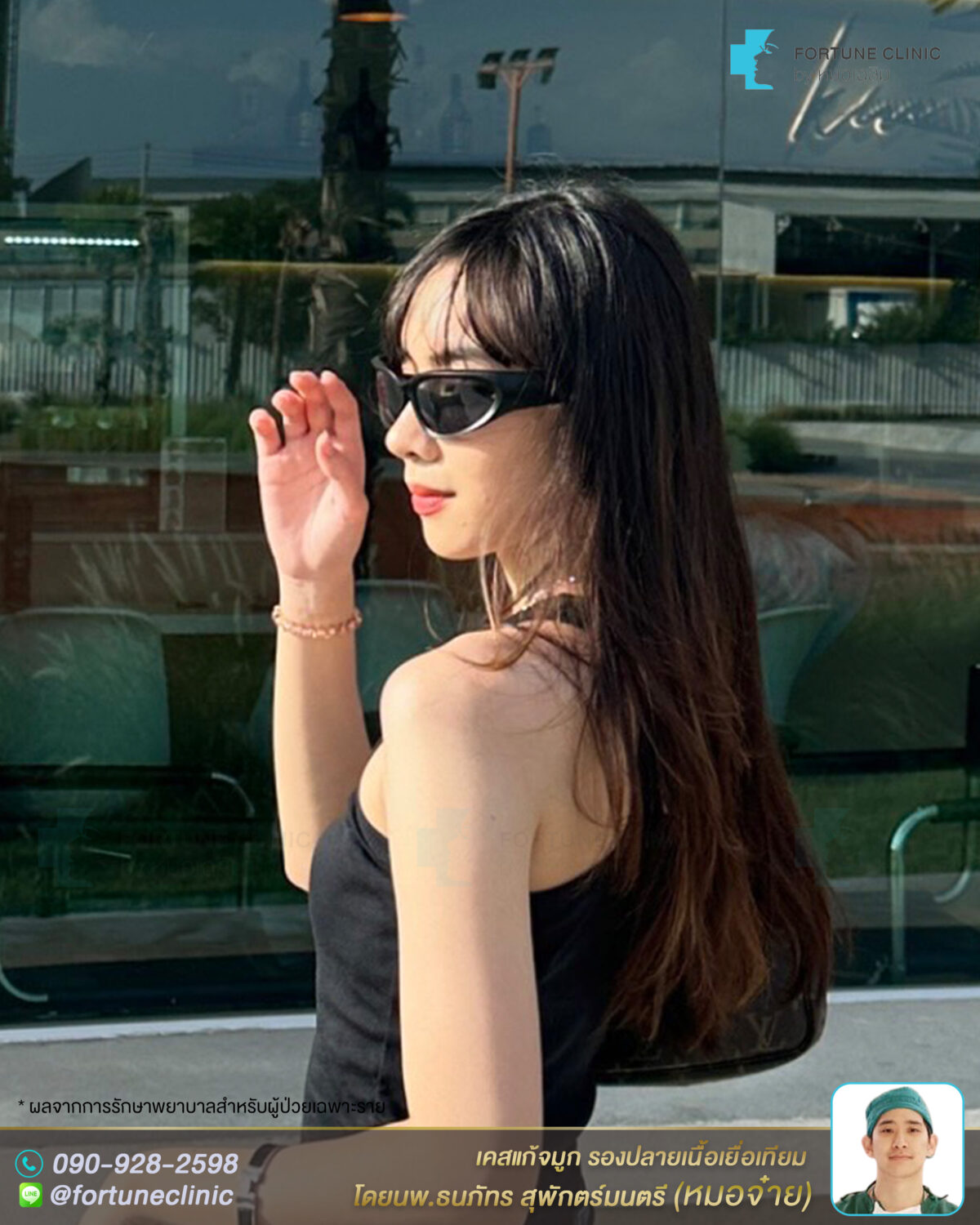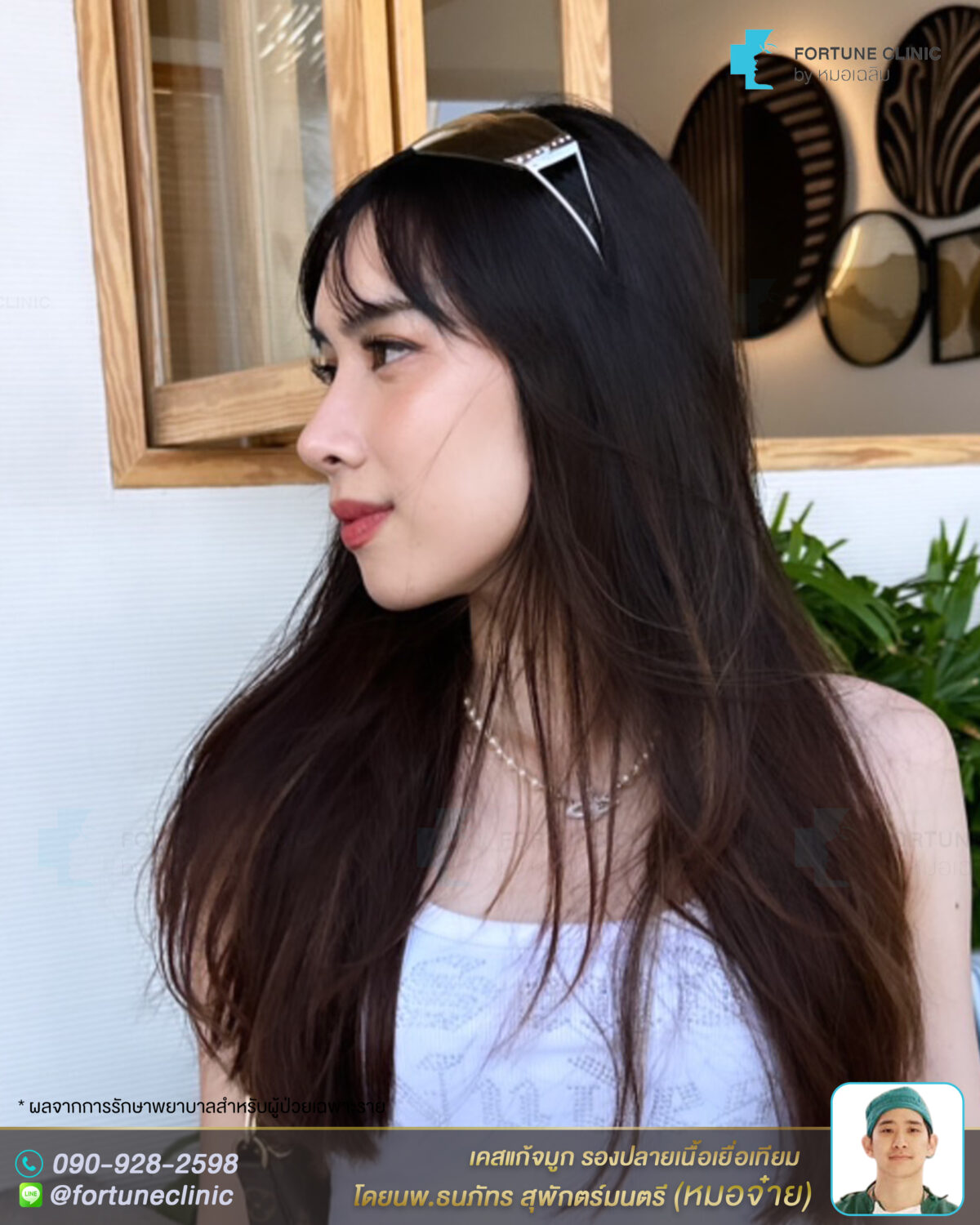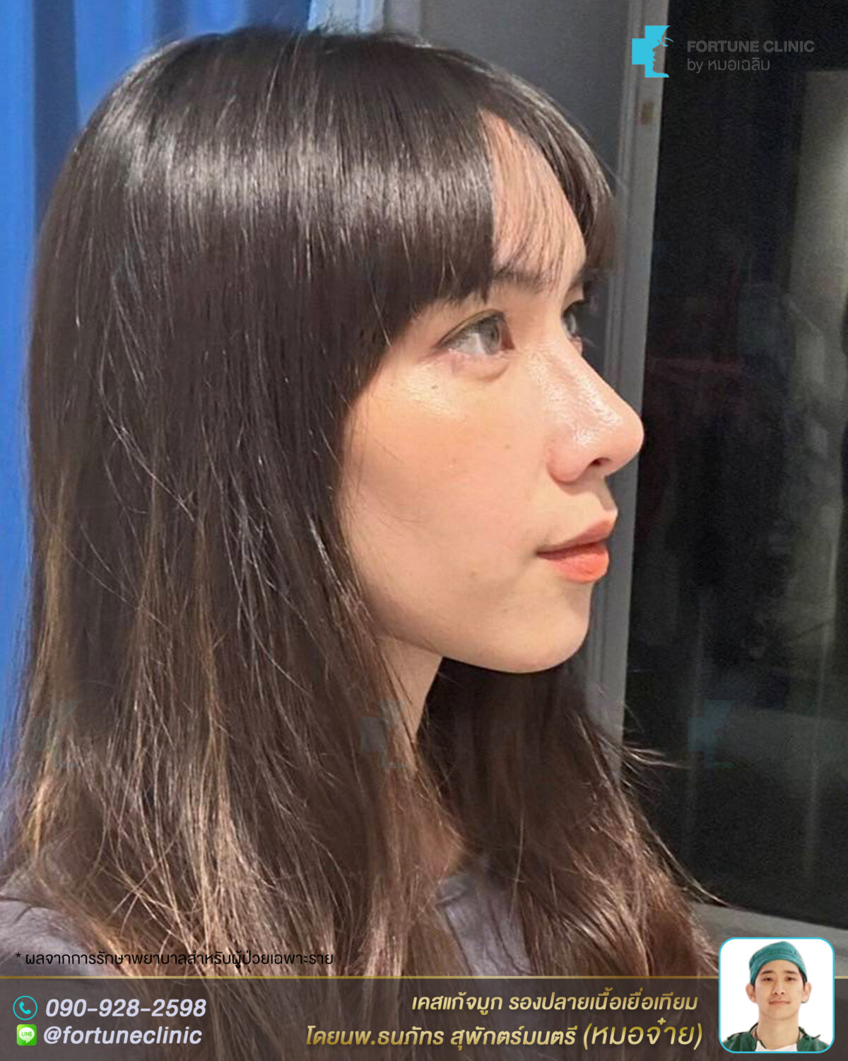เดิมเคยเสริมซิลิโคนมาก่อน แต่ทรงแข็งทื่อ ปลายเอียงเล็กน้อย และผิวหนังปลายจมูกเริ่มบาง เห็นหัวซิลิโคน สันหัวตาเว้าลึกเป็นร่องซิลิโคน