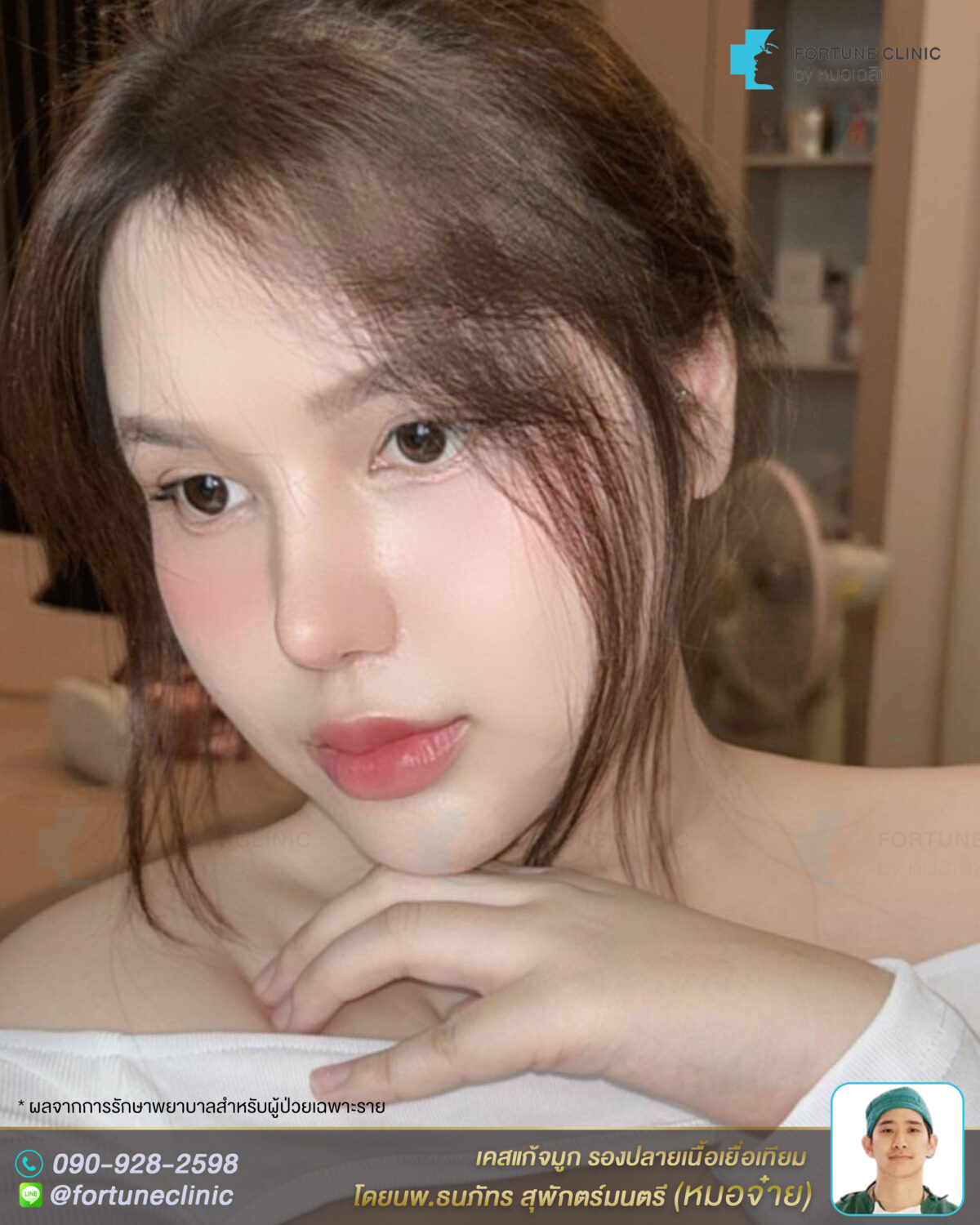 หลังเสริมรูปหน้ามีมิติขึ้นมาก จมูกดูเรียวยาวขึ้น สันหัวตาโด่งคมขึ้นอย่างเป็นธรรมชาติ หน้าดูหวานละมุนขึ้น ปลายจมูกเรียวสวยมากขึ้นและเรียวเล็กลง ปีกจมูกเรียวกระชับสวยขึ้น โดยไม่ต้องตัดปีก รูปหน้าดูเรียวสวยขึ้น สมดุลขึ้น ดูหวาน สดใสละมุนขึ้นมากค่า