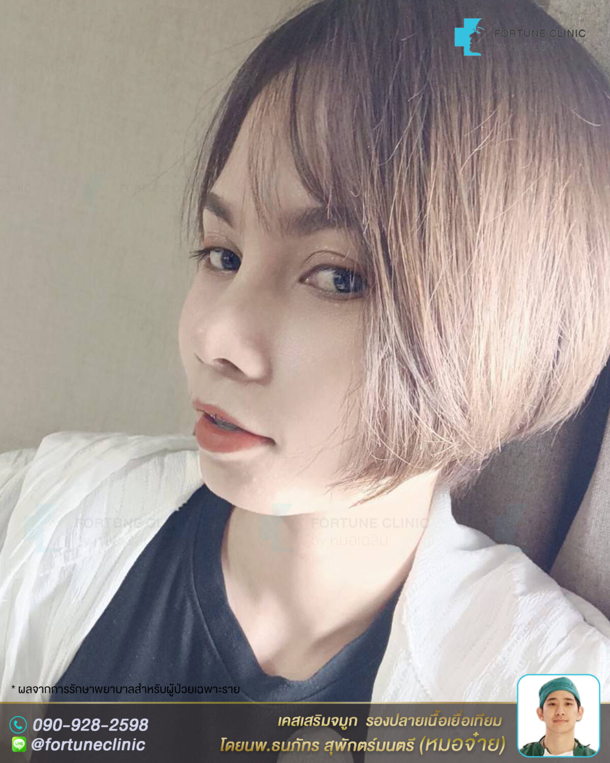– หมอจ๋ายเสริมจมูกด้วยซิลิโคนเหลาใหม่เคสต่อเคส ปรับหัวตาเป็นสโลปหวานๆ เพิ่มความโด่งหัวตาแบบเนียนสวยเป็นธรรมชาติ ไล่ความโด่งไปหาปลายจมูก และยกปลายพุ่ง เป็นทรงโด่งเรียวเล็ก แล้ววางซิลิโคนชั้นใต้เยื่อหุ้มกระดูกเพื่อความสวยเนียน