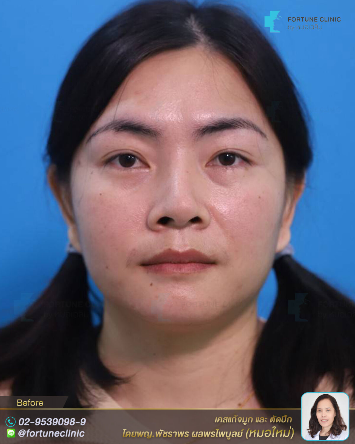 ก่อนหน้านี้เคยเสริมจมูกมาแล้ว แต่ซิลิโคนเดิมเอียงมาก จนทำให้รูจมูกเบี้ยว ปลายจมูกเอียง สันเป็นแท่งชัด ปีกจมูกบาน เห็นรูจมูกชัด ทำให้รู้สึกไม่มั่นใจ คนไข้อยากได้แบบธรรมชาติ ตรงสวยและเรียวละมุน