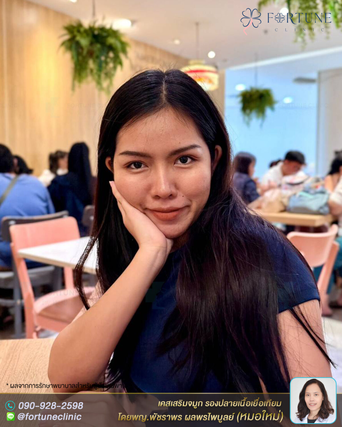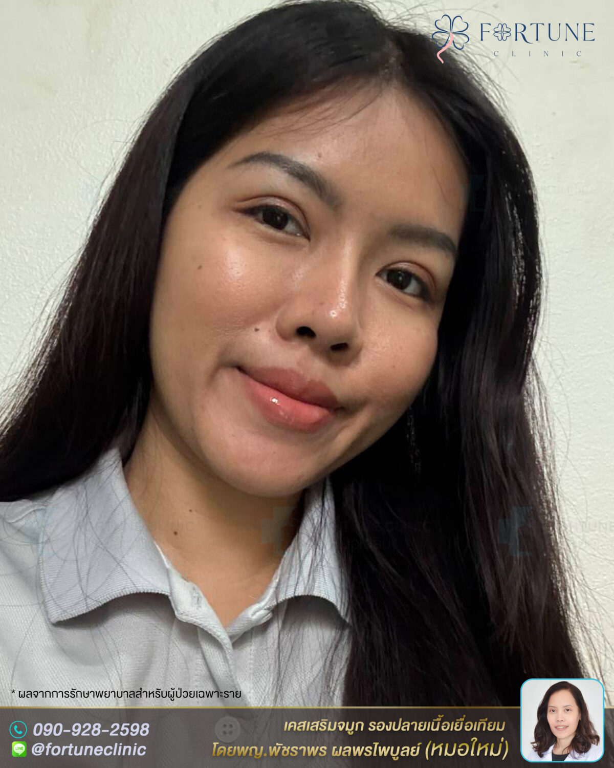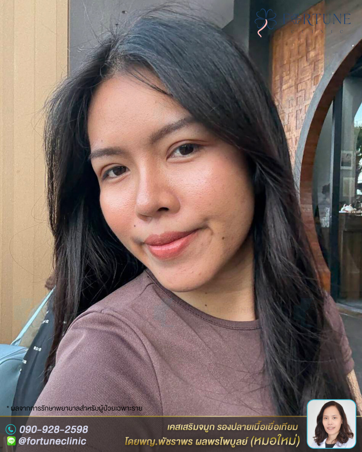 เดิมเป็นเคสเนื้อน้อย ผิวหนังบาง สันจมูกน้อยมาก สันหัวตาหักเว้าลึก ทำให้ใบหน้าดูแบนไม่มีมิติ