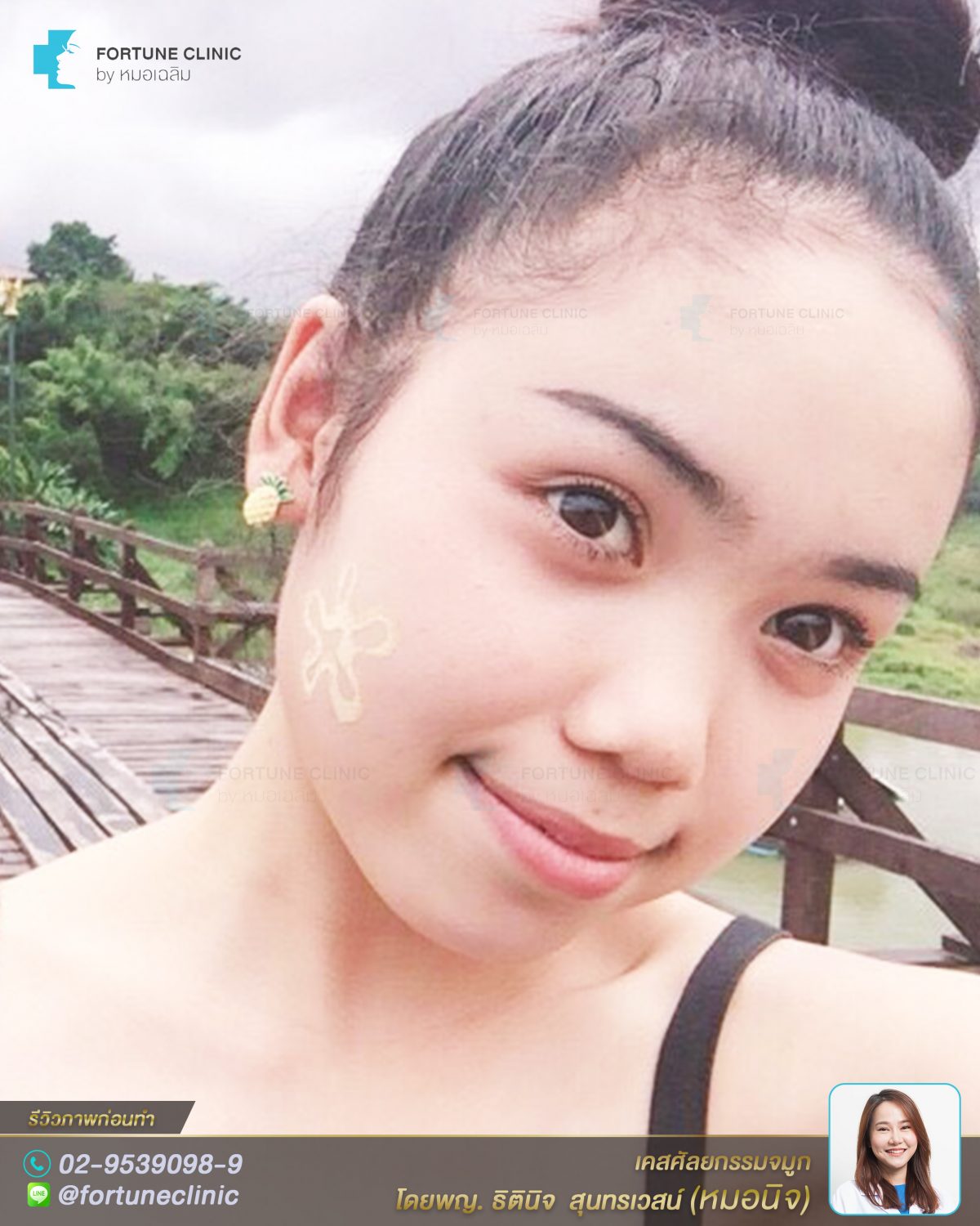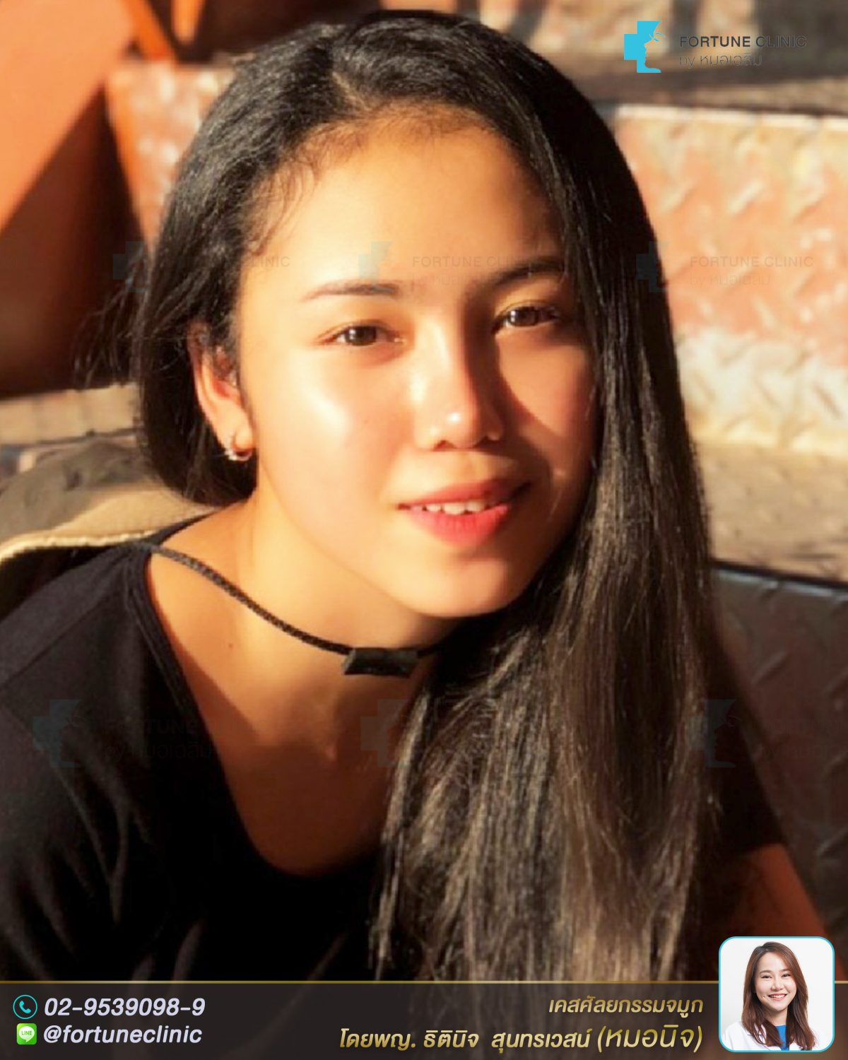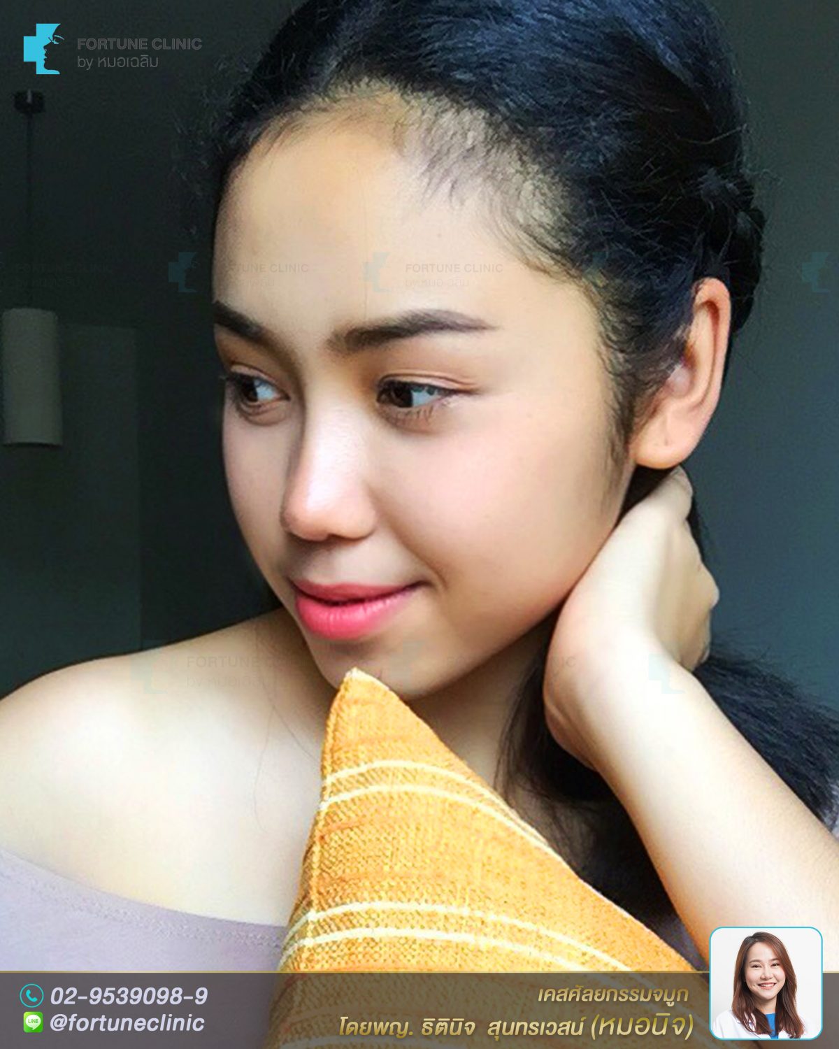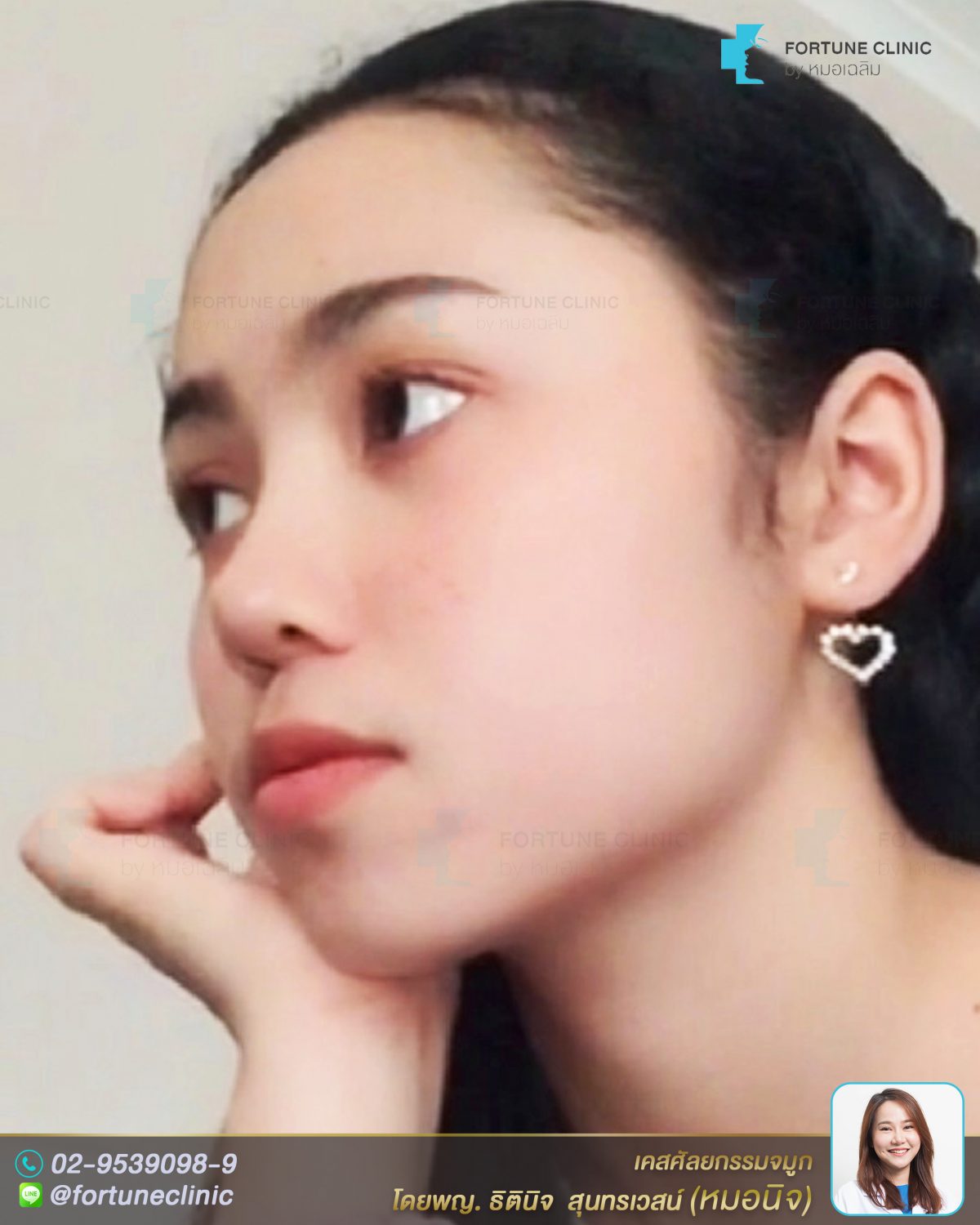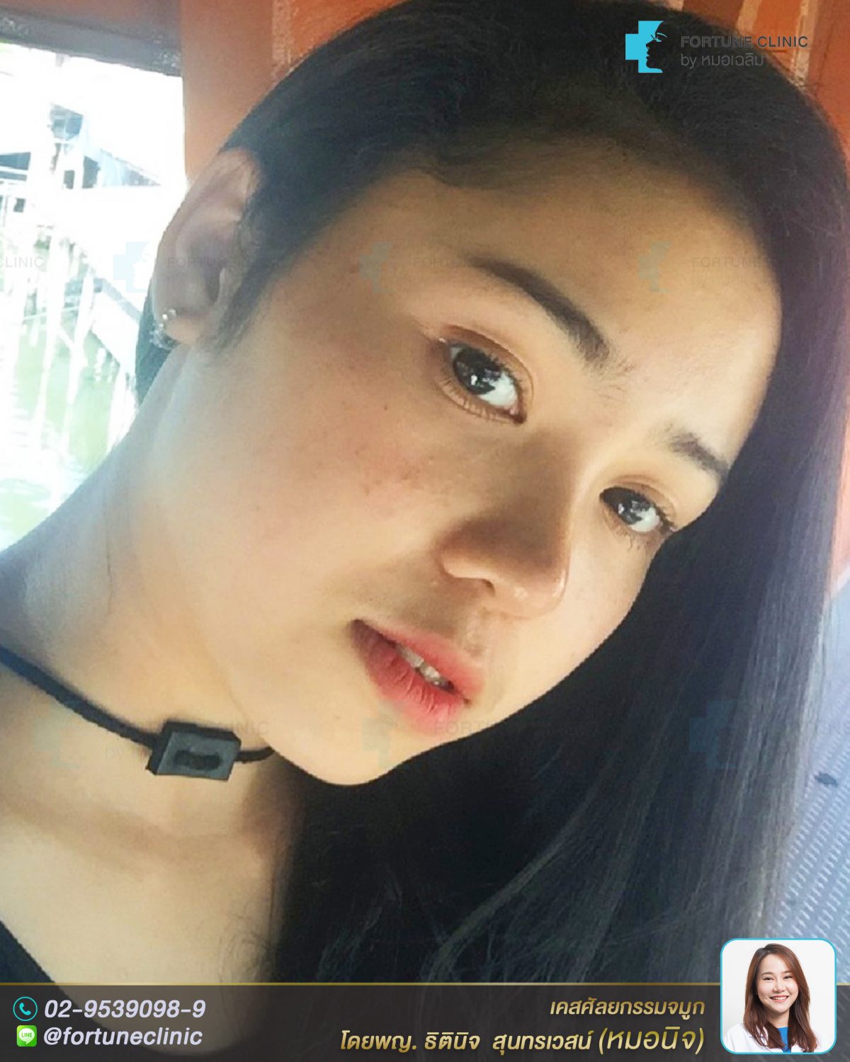 คุณหมูแดงเป็นเคสเนื้อน้อยมากกกค่ะ ผิวหนังบาง เนื้อจมูกไม่ค่อยยืด สันจมูกน้อยมาก และ จมูกเล็กมาก ปลายเชิดทำให้ดูจมูกสั้นค่า