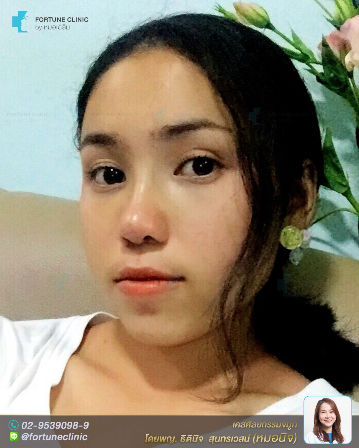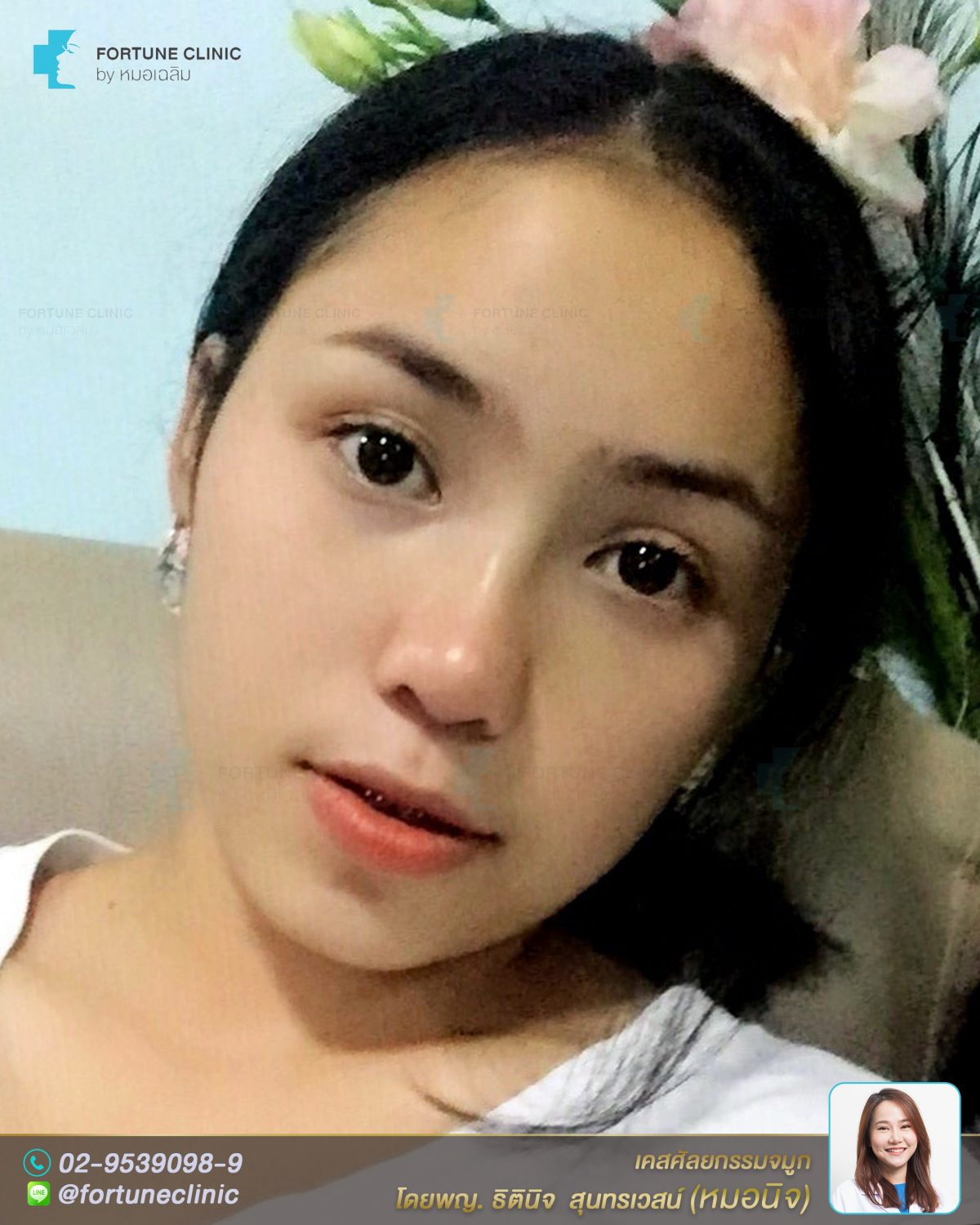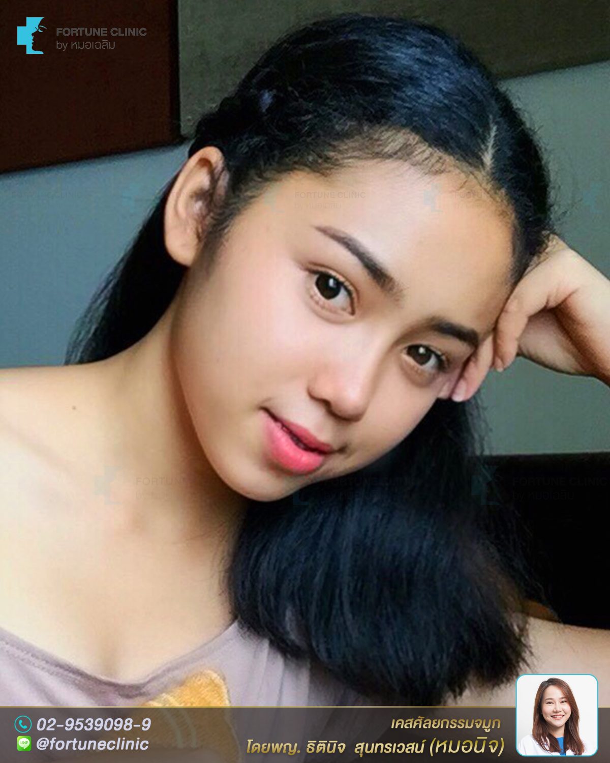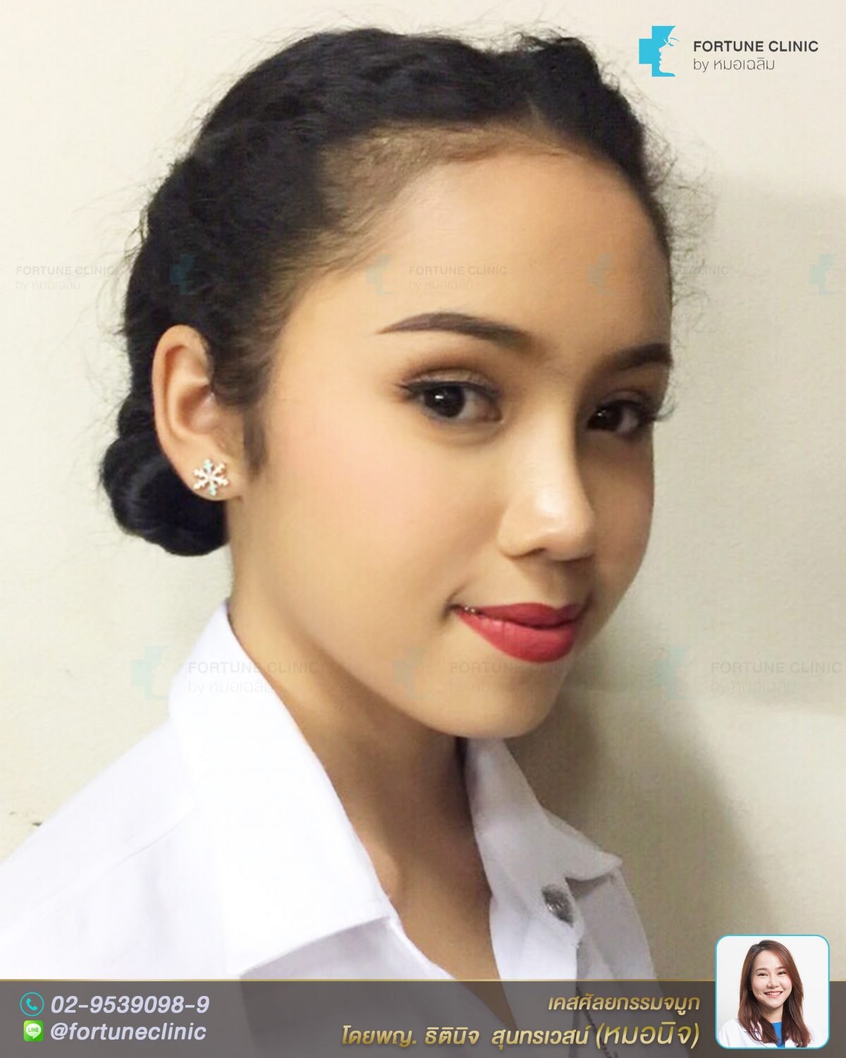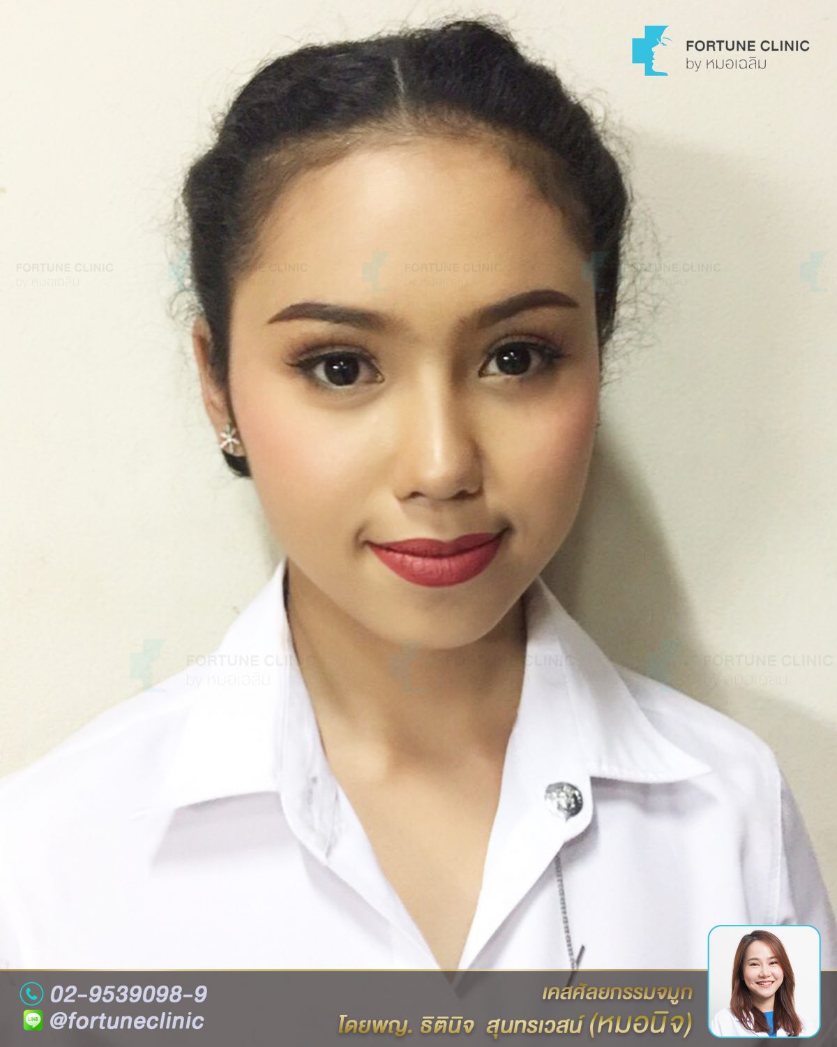 คุณหมูแดงเป็นเคสเนื้อน้อยมากกกค่ะ ผิวหนังบาง เนื้อจมูกไม่ค่อยยืด สันจมูกน้อยมาก และ จมูกเล็กมาก ปลายเชิดทำให้ดูจมูกสั้นค่า