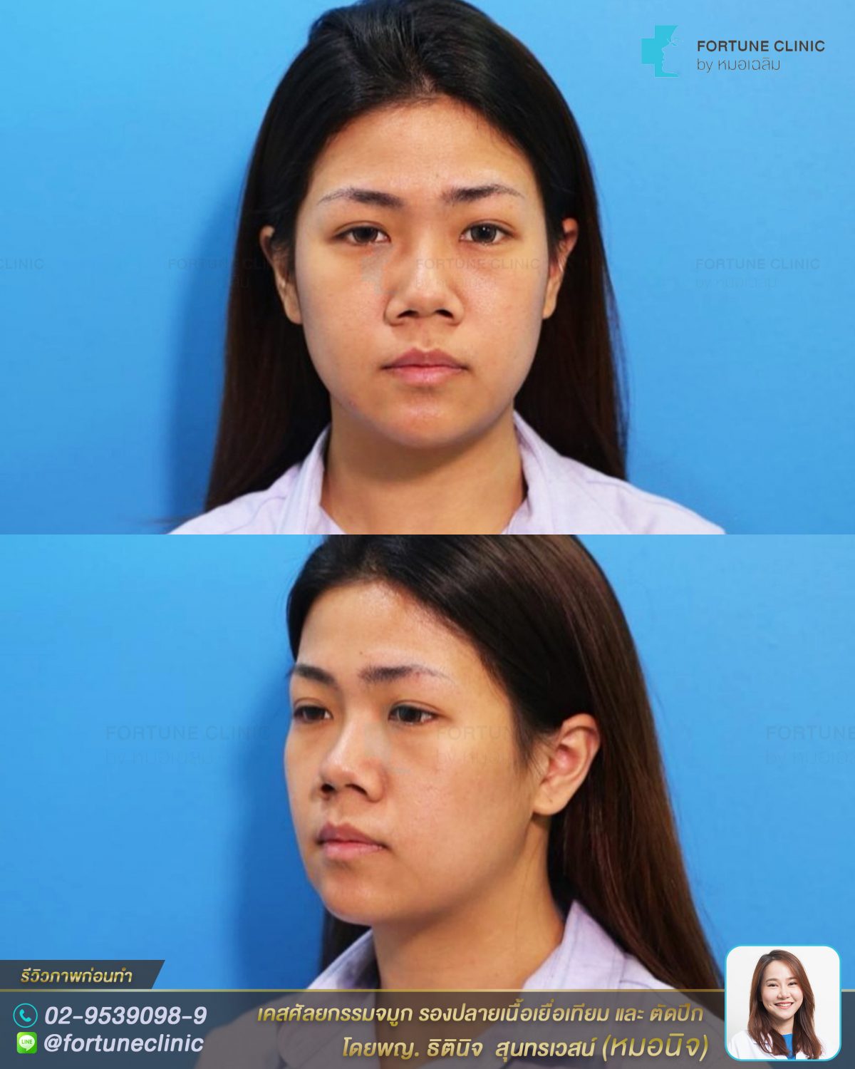 หมอนิจแนะนำเสริมด้วยซิลิโคนเหลาใหม่เคสต่อเคส ให้เข้ากับหน้าและให้ได้มุมและทรงสโลปสวย รับกับหน้าผากและรองปลายจมูกด้วยเนื้อเยื่อเทียมเพื่อให้ได้ปลายจมูกที่เรียวยาวขึ้น และตัดปีกจมูกให้เล็กลง ลดความกว้างบานของปีกจมูก