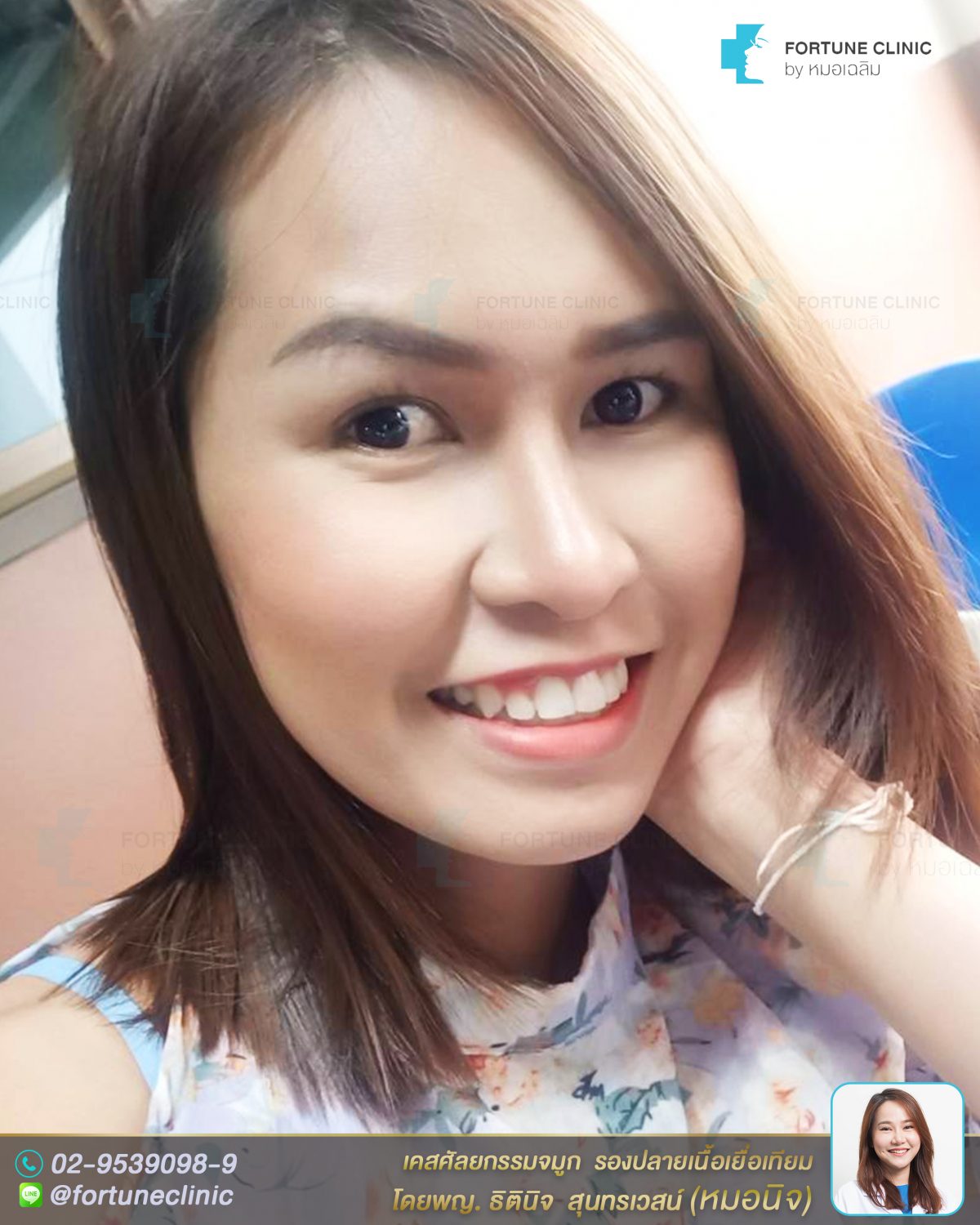 เดิมคนไข้เป็นเคสเนื้อจมูกน้อย และเนื้อจมูกไม่ยืดหยุ่น สันจมูกช่วงหว่างตาหักเป็นมุมฉากกับหน้าผาก ทำให้สันจมูกเว้าลึกเข้าไป ปลายจมูกงุ้ม