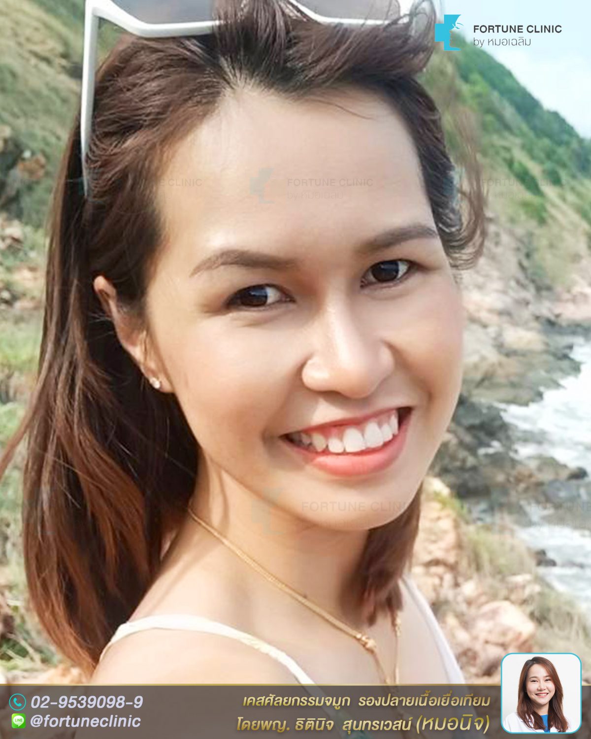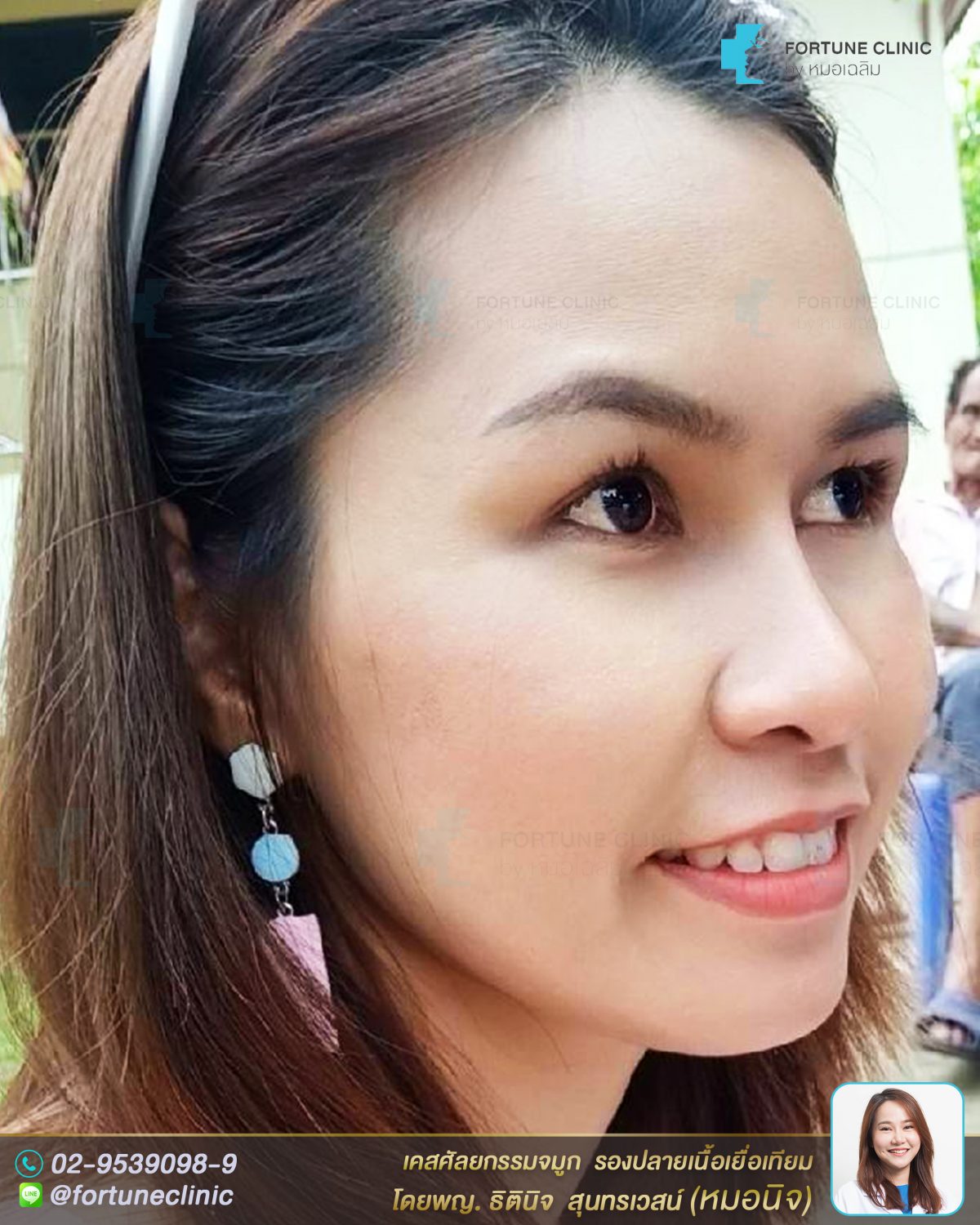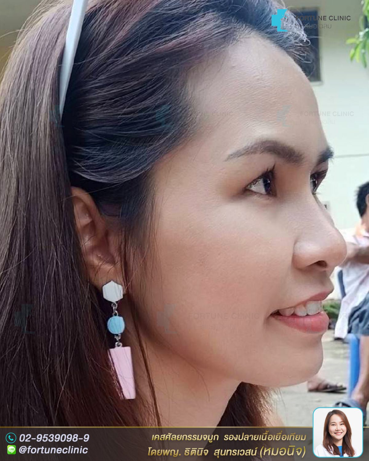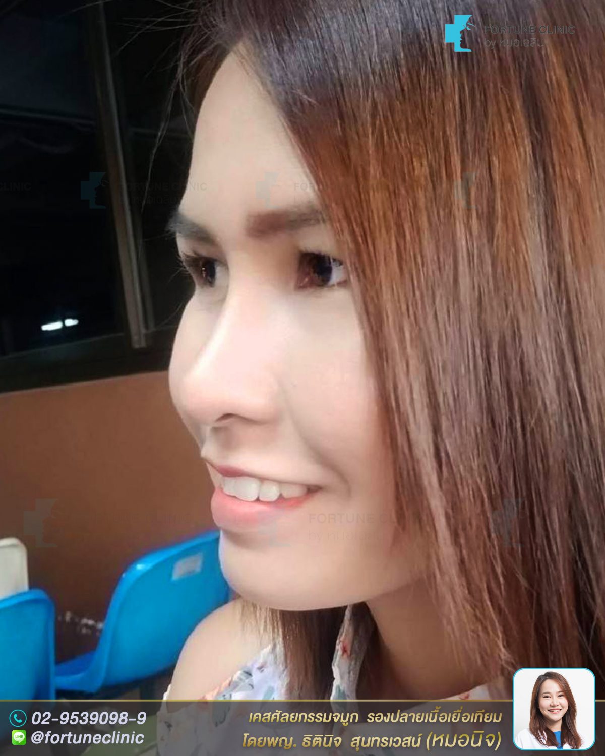 หมอนิจเสริมด้วยซิลิโคนเหลาละเอียดและรองปลายจมูกด้วยเนื้อเยื่อเทียม เป็นสไตล์ทรงสโลปปลายพุ่งแบบธรรมชาติ ไม่พุ่งมาก เน้นเสริมตรงหัวตาที่เว้าลึก ให้สูงขึ้น ให้เนียนรับกับหน้าผาก และ รองปลายจมูกด้วยเนื้อเยื่อเทียม เพื่อปรับให้ปลายจมูกดูพุ่งและยาวขึ้นค่า ทำให้ปลายดูงุ้มน้อยลงค่า