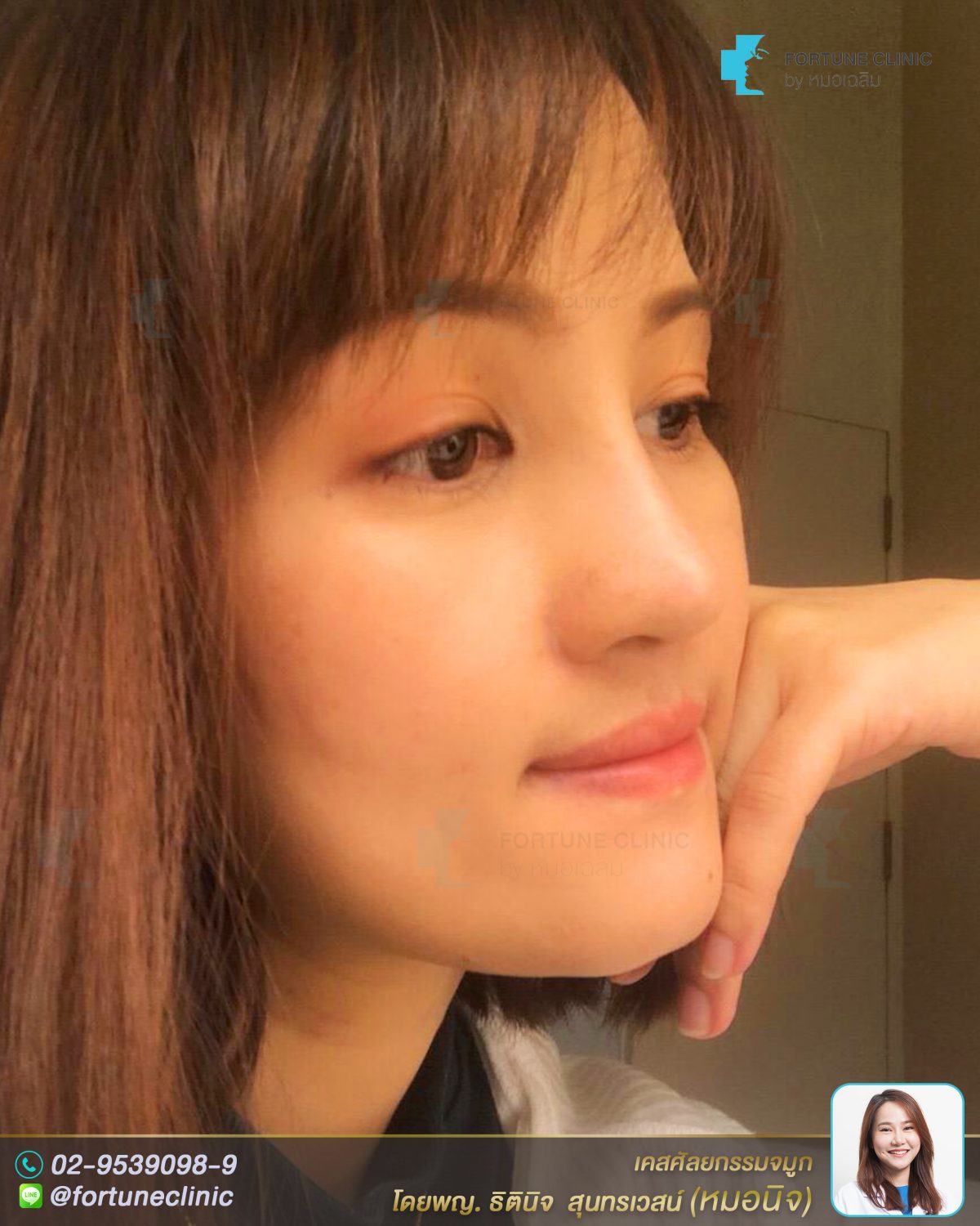 เดิมคนไข้มีฐานจมูกกว้าง ผิวบาง ความโด่งของสันจมูกเดิมพอมี แต่เนื่องจากฐานเดิมกว้าง และ สันจมูกช่วงตาเว้าลึก ทำให้ดูไม่มีมิติ คนไข้ต้องการเสริมให้โด่งขึ้นและให้ปลายจมูกพุ่งขึ้น