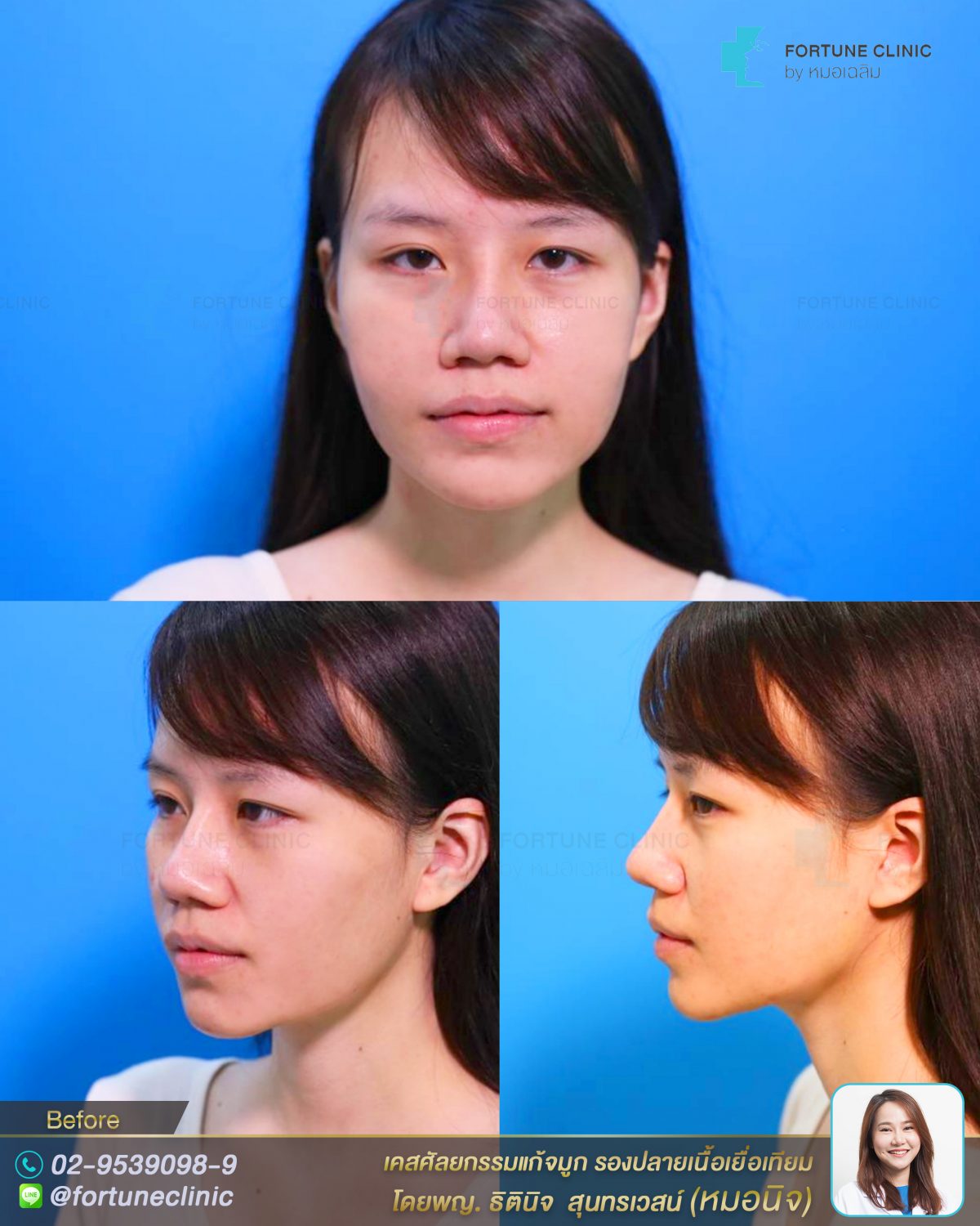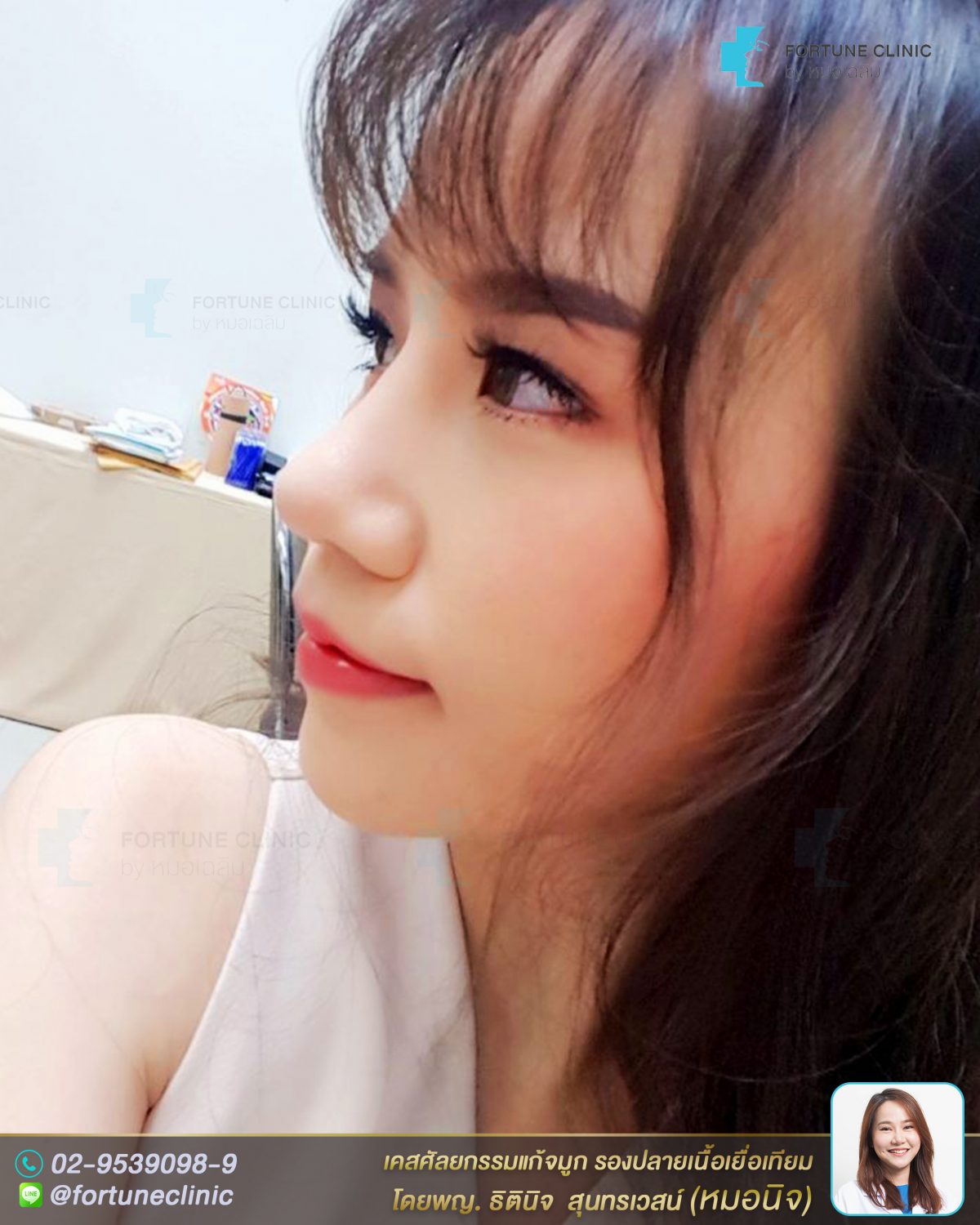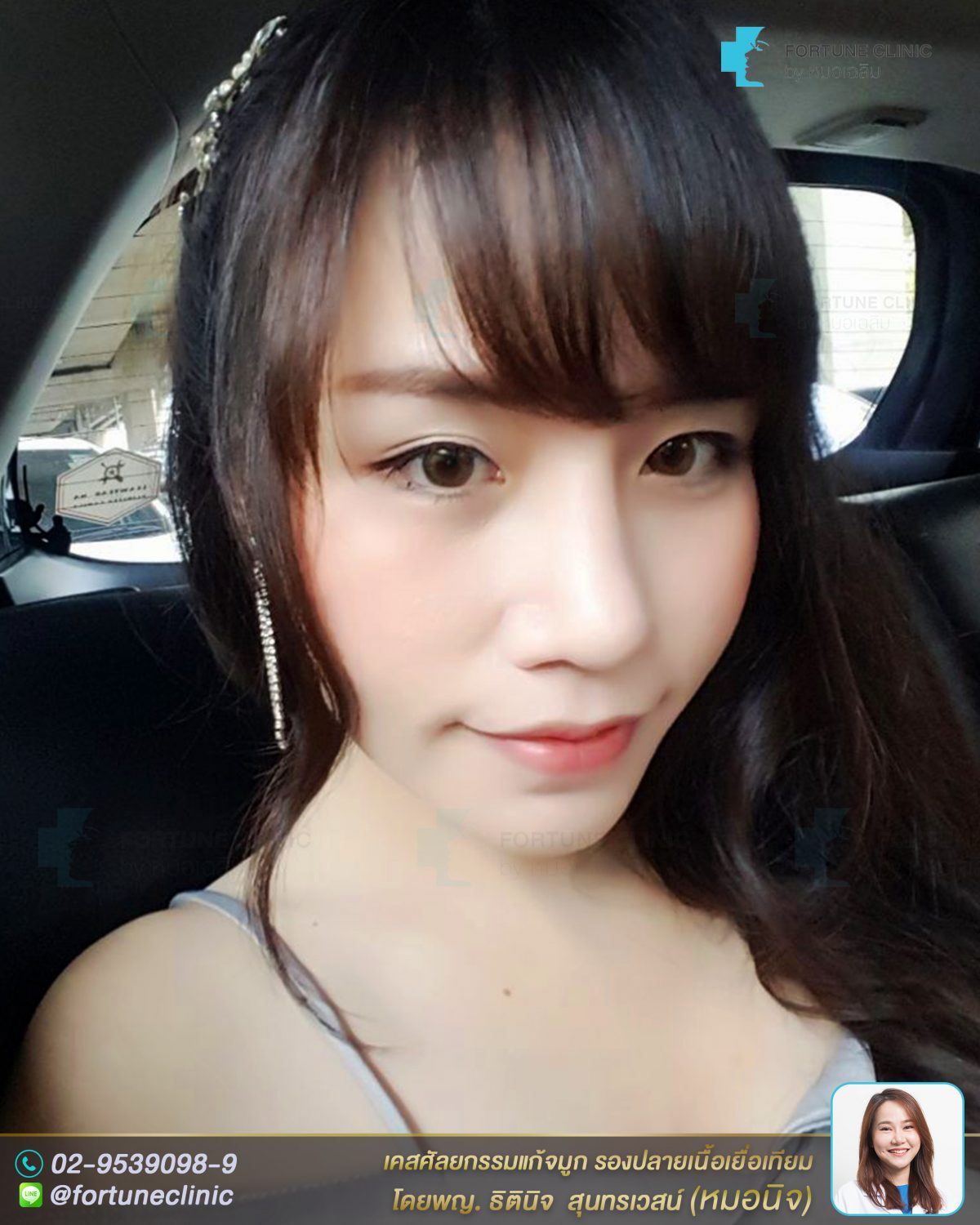 เดิมคนไข้เคยเสริมจมูกมาจากที่อื่น แต่ทรงจมูกเห็นเป็นแกนชัด ทรงแข็งทื่อ ไม่หวานละมุน ปลายจมูกใหญ่ไม่พุ่ง ปีกจมูกบานออก สองข้างไม่เท่ากัน ฐานจมูกหลังถอดซิลิโคนออกค่อนข้างเอียง คนไข้ต้องการให้ปลายจมูกพุ่งขึ้นและให้ทรงจมูกหวานขึ้น และต้องการให้ดูเนียนสมูทกว่าเดิม ไม่เห็นเป็นแกนชัด