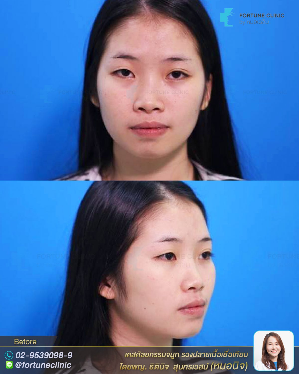 เดิมคนไข้เนื้อจมูกน้อย ผิวหนังบางใส ไม่ยืดหยุ่น ปลายจมูกสั้น ไม่มีหยดน้ำ สันกระดูกคด และ ปีกจมูกบานออกข้างค่า