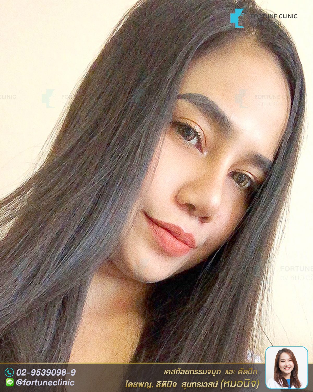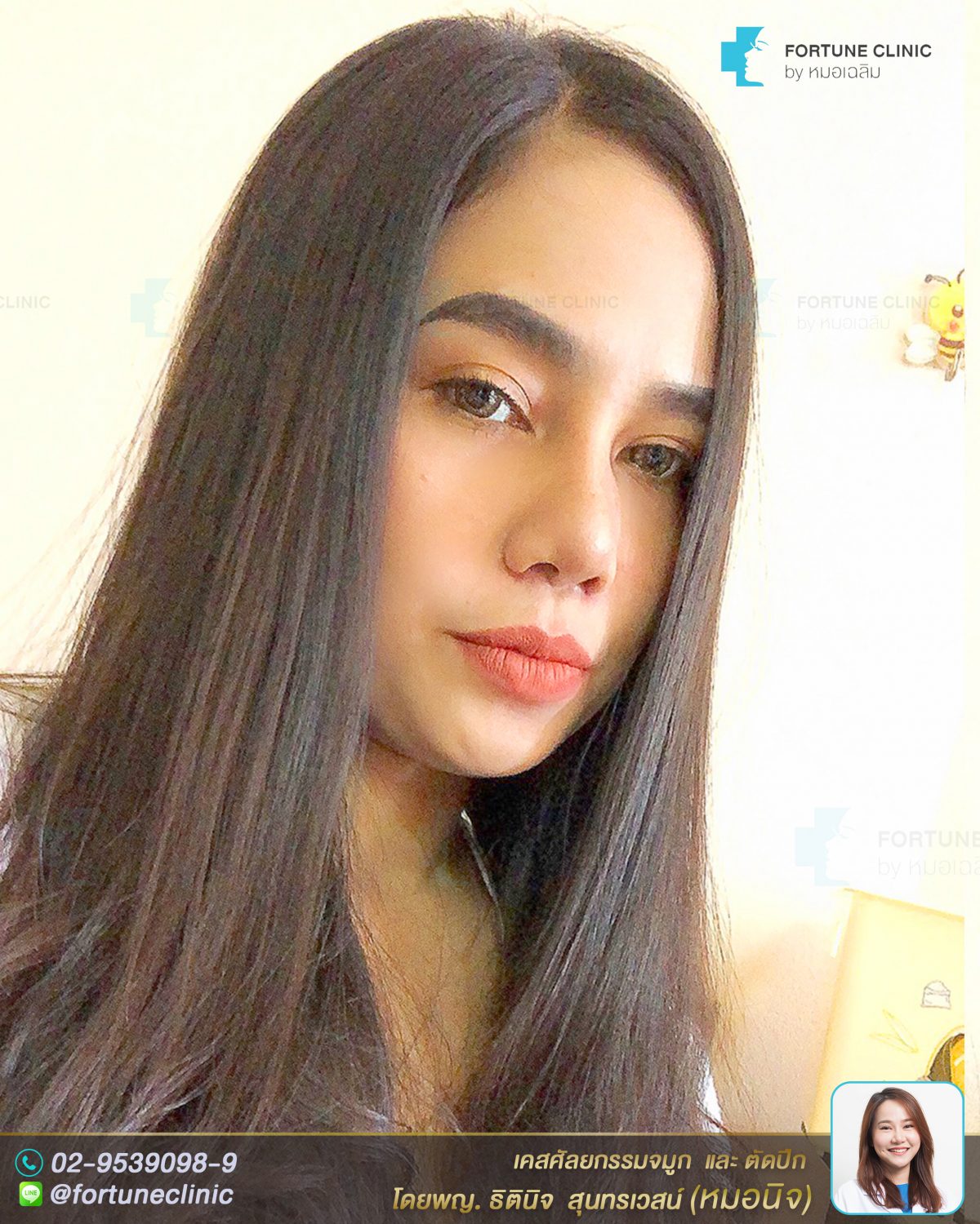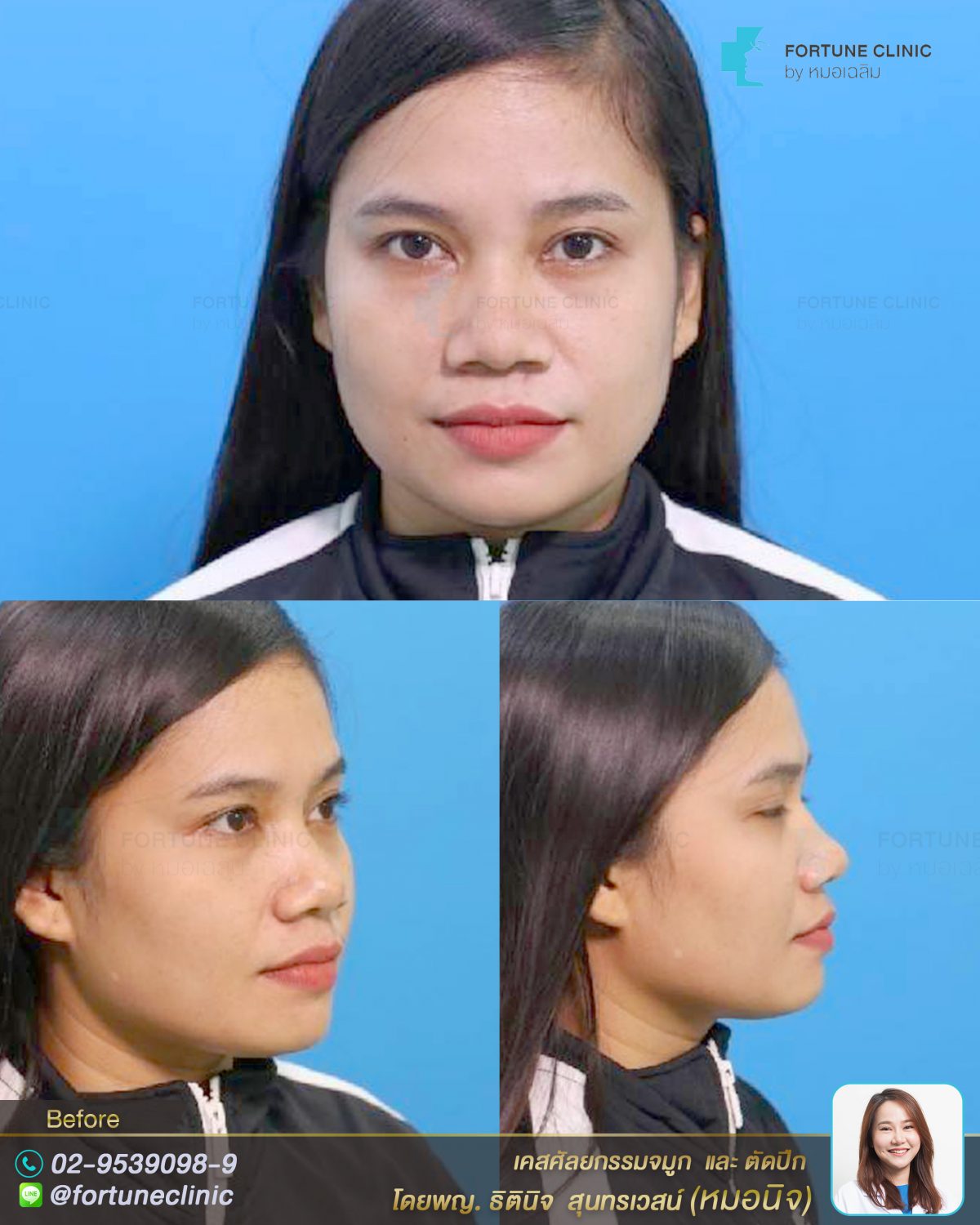 เดิมคนไข้สันจมูกไม่โด่ง เนื้อจมูกหนา ปลายจมูกหนาใหญ่ ปีกจมูกบานกว้าง ปลายจมูกไม่มีหยดน้ำทำให้จมูกดูสั้น ไม่มีมิติค่า