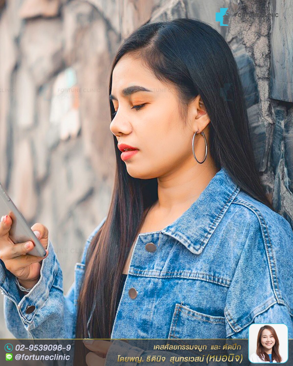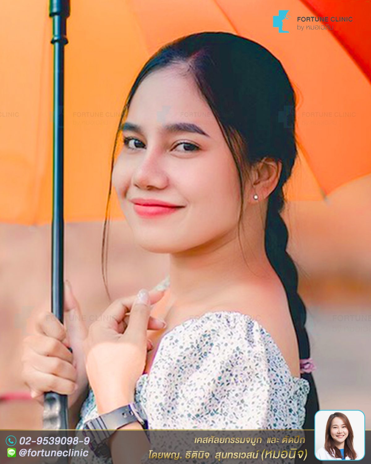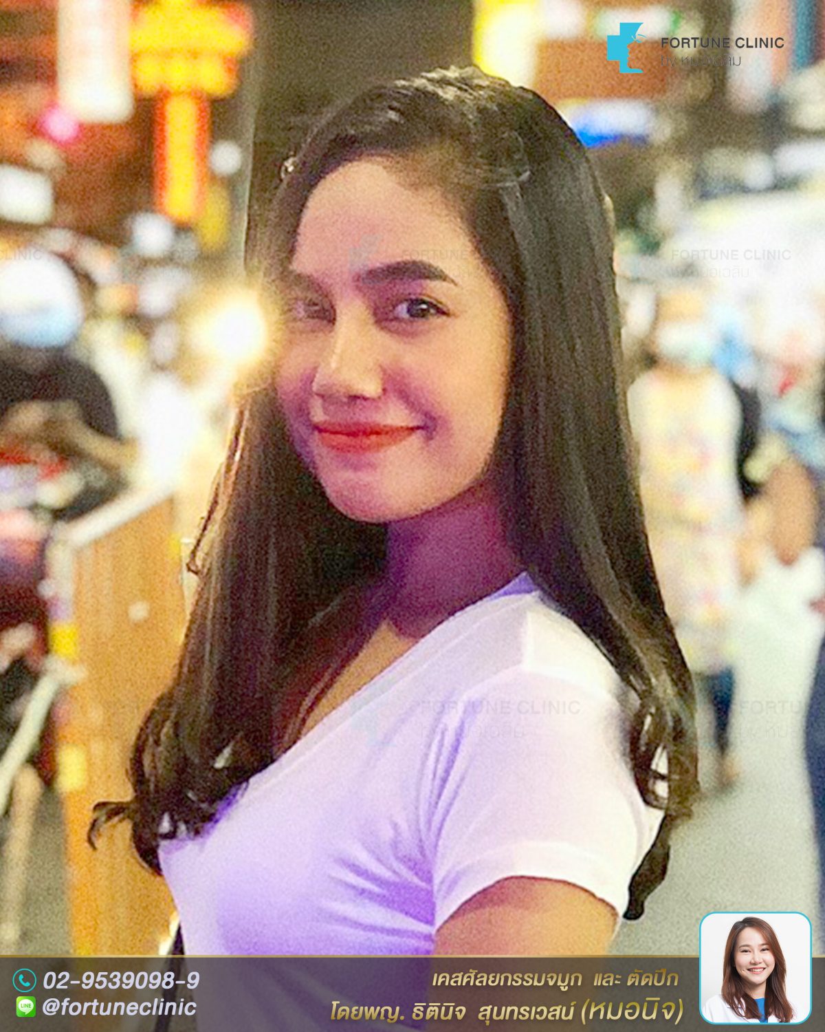 เดิมคนไข้สันจมูกไม่โด่ง เนื้อจมูกหนา ปลายจมูกหนาใหญ่ ปีกจมูกบานกว้าง ปลายจมูกไม่มีหยดน้ำทำให้จมูกดูสั้น ไม่มีมิติค่า