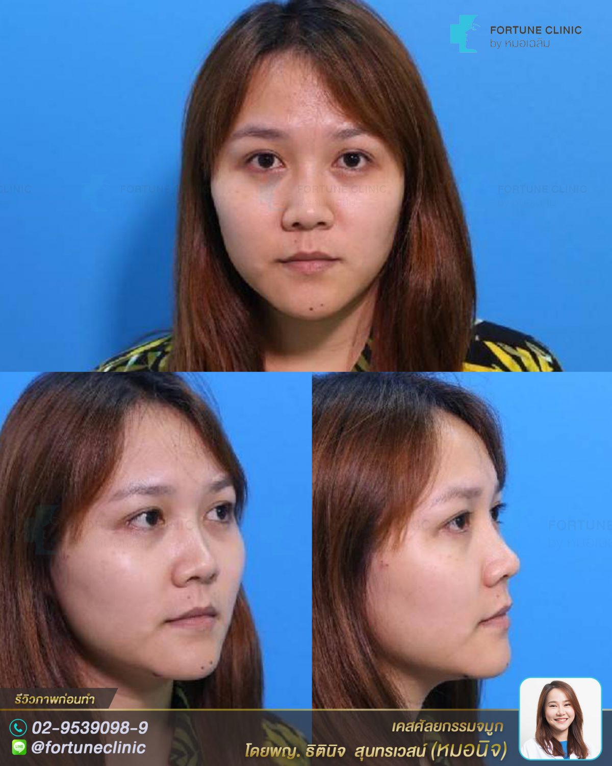 เดิมคุณดรีมจมูกมีเนื้อน้อย สันจมูกไม่โด่ง ปลายคางยาวยื่นกว่า ทำให้หน้าไม่มีมิติ ไม่ได้สมดุลสวยงาม และปีกจมูกบานเล็กน้อย