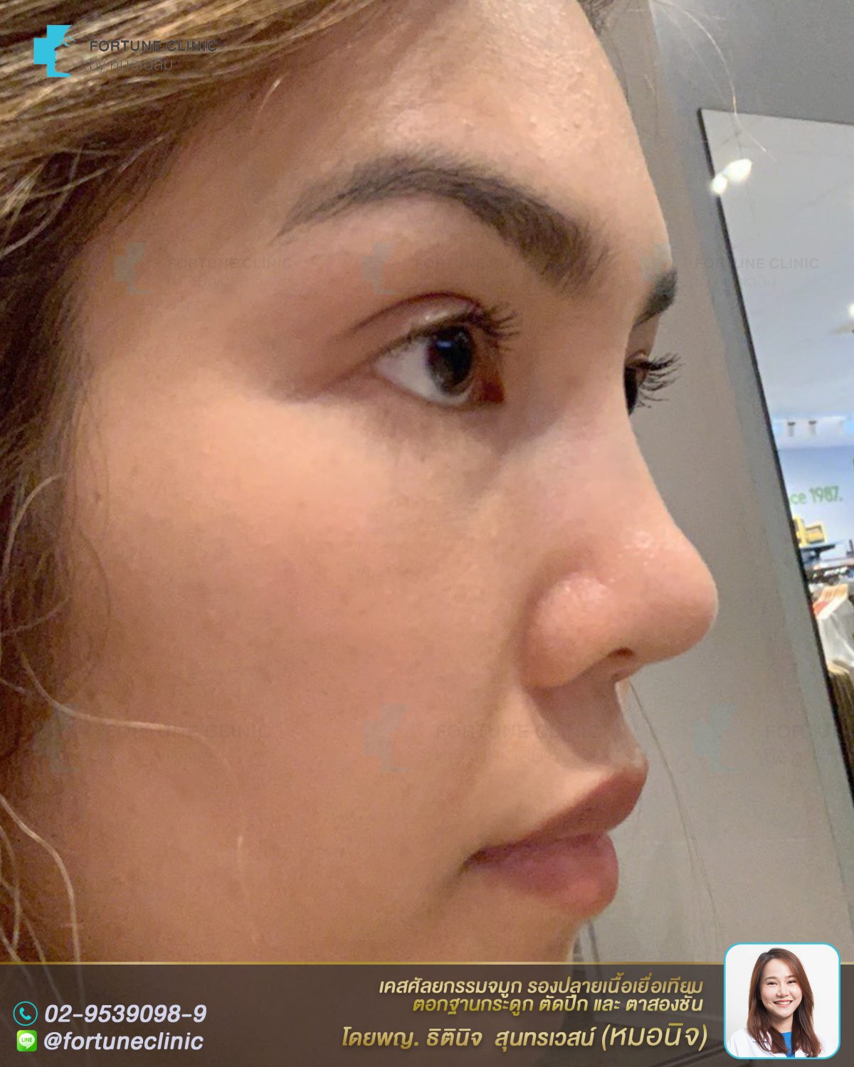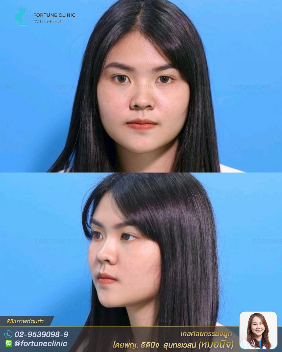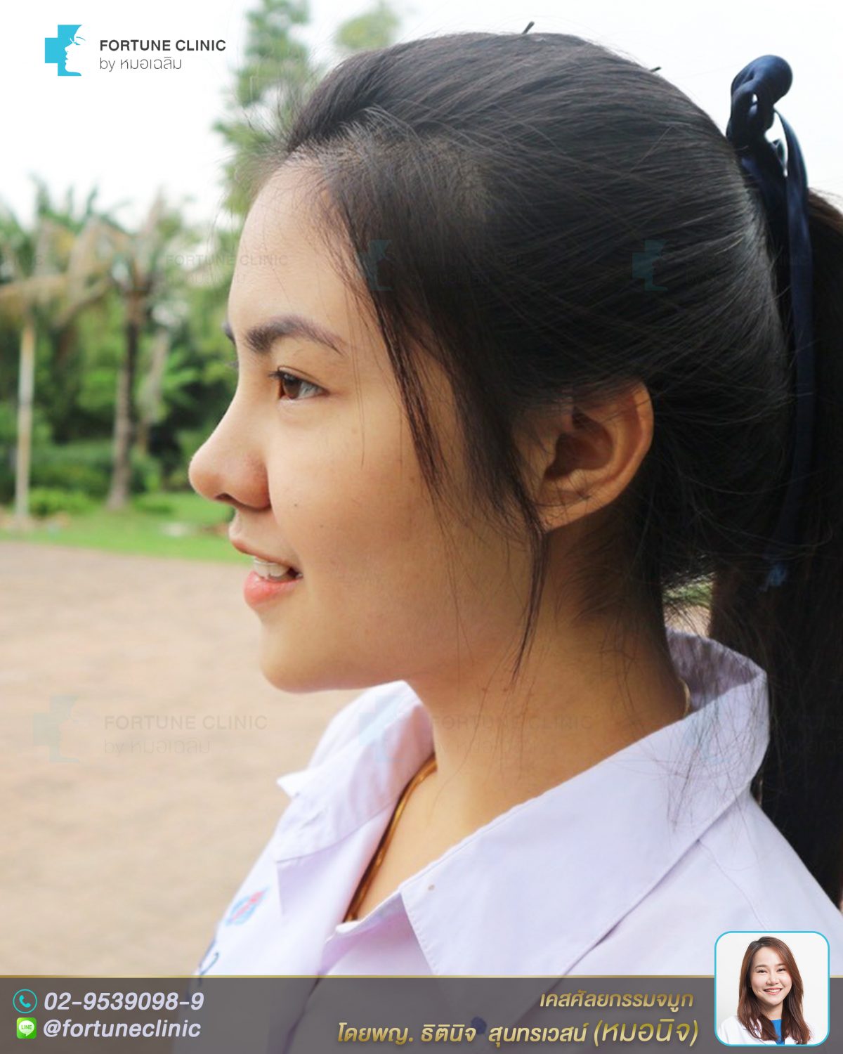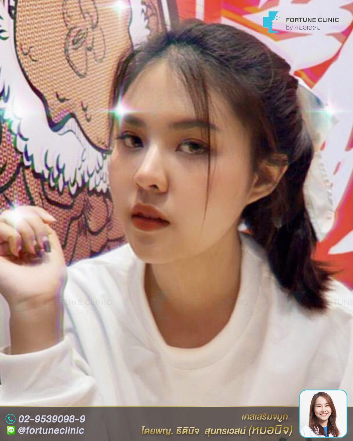 เดิมทรงจมูกคนไข้ไม่ได้มีปัญหามาก เพียงแต่สันจมูกไม่โด่งมาก จมูกทรงสั้น หน้าตรงเห็นรอยต่อระหว่างหน้าผากกับสันจมูก และปลายจมูกเนื้อน้อย