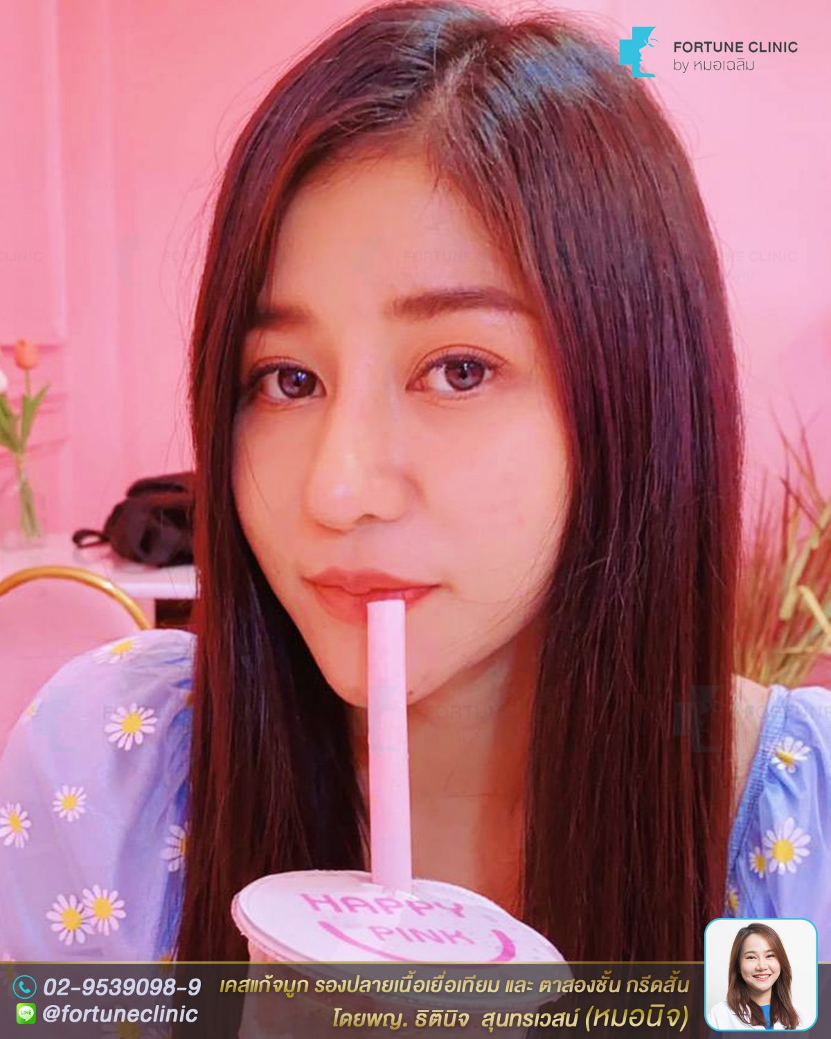 หลังแก้จมูกเรียวสวย หน้าพุ่งมีมิติ สันเป็นสโลป ปลายยกพุ่งสวย ทรงจมูกดูยาวและโด่งสวยขึ้นอย่างที่คนไข้ต้องการ ปลายจมูกเรียวเล็กลง ปีกจมูกเรียวสวยขึ้นโดยไม่ต้องตัดปีก รูปหน้าสวยขึ้นดูเด็กลง ดูฝรั่งเลยค่า
