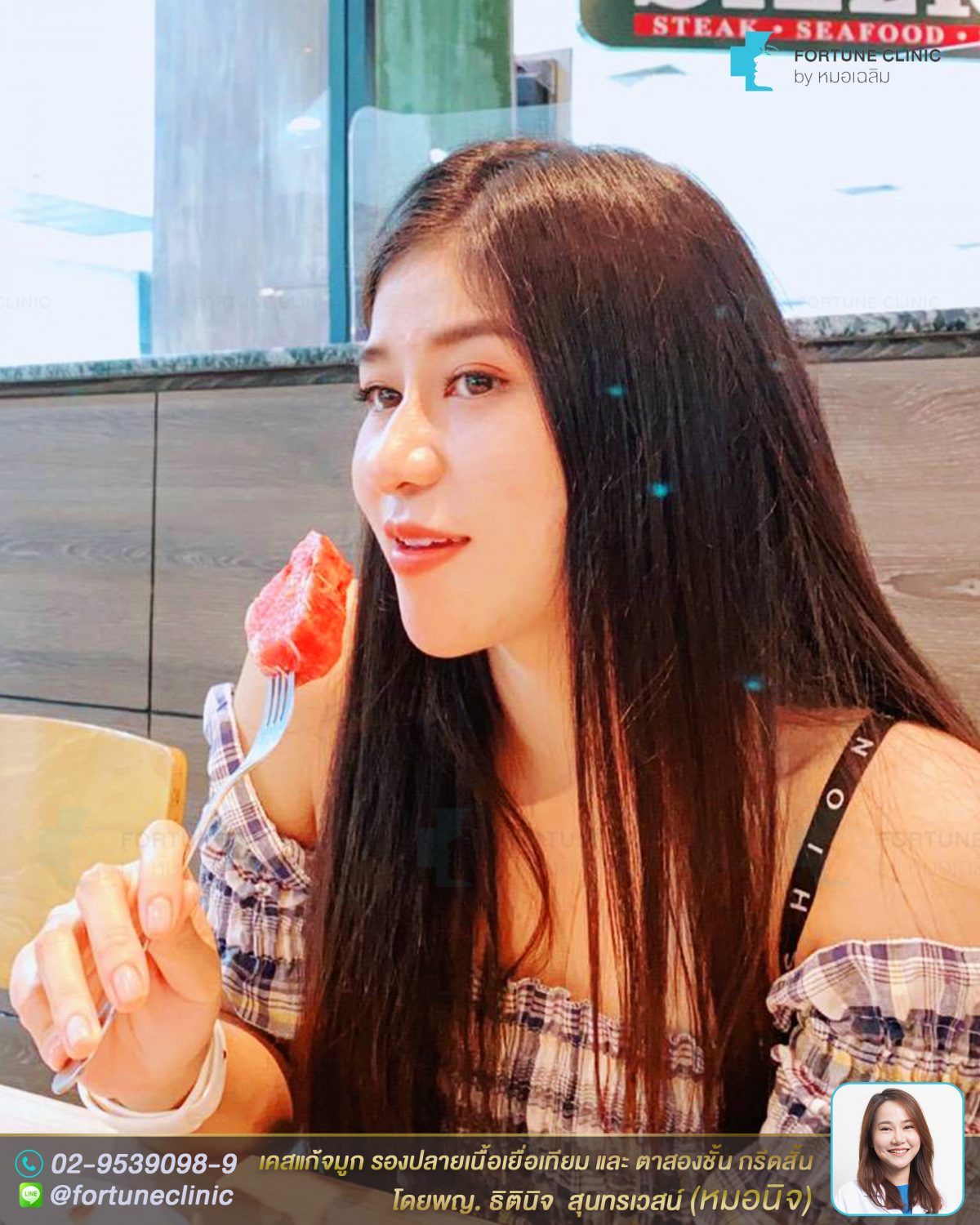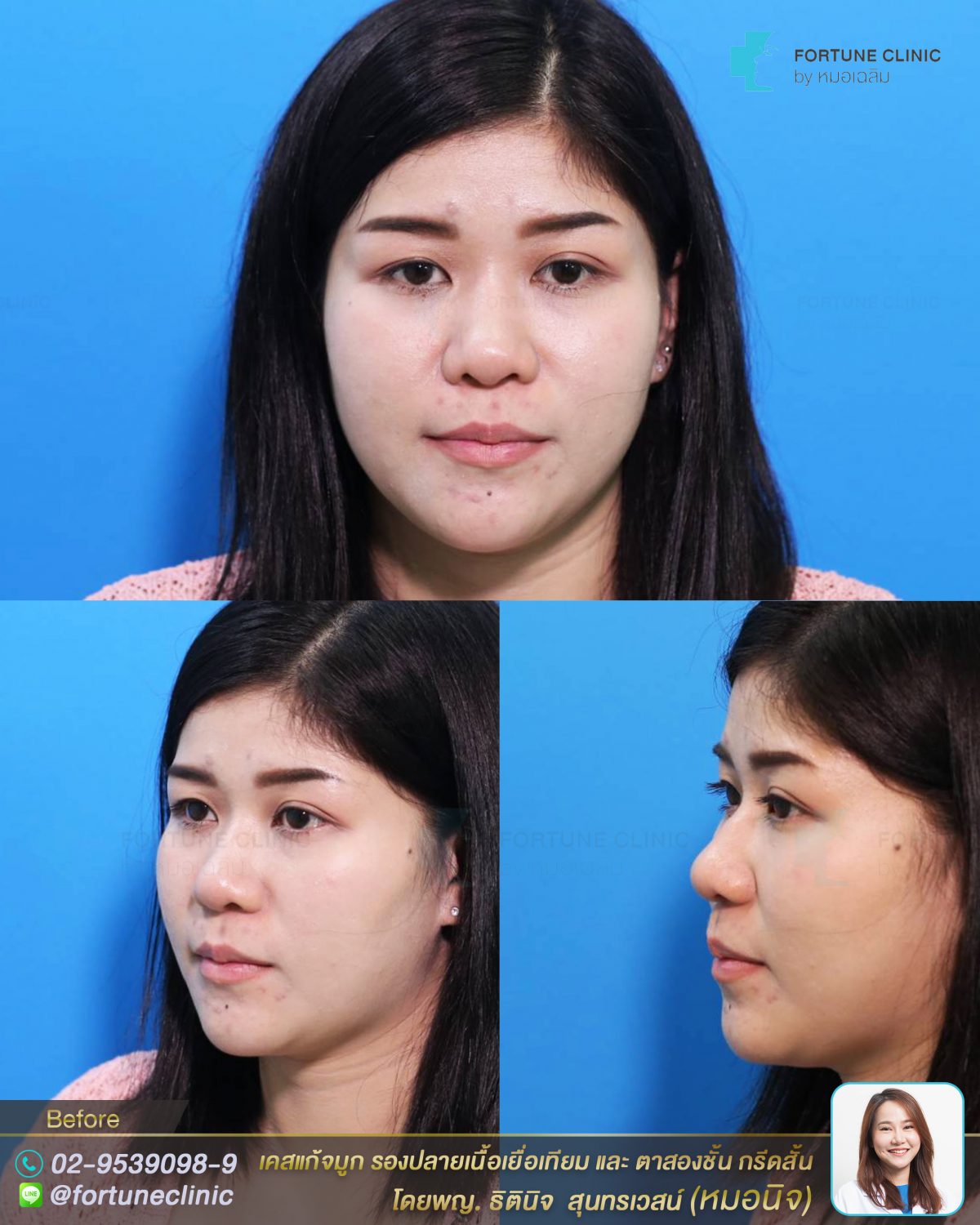 เดิมคนไข้เคยเสริมจมูกมาแล้ว แต่สันเอียงและต้องการเพิ่งความโด่ง จึงได้ถอดพักจมูกแล้วแก้ใหม่ค่า