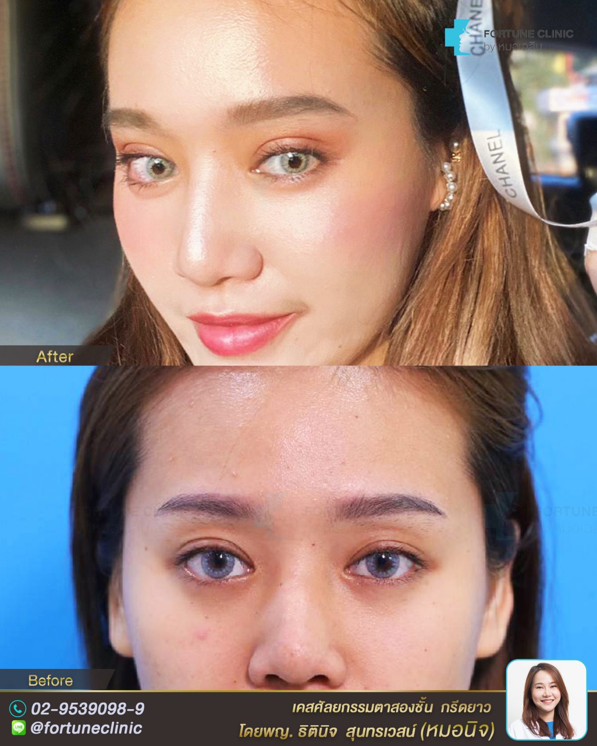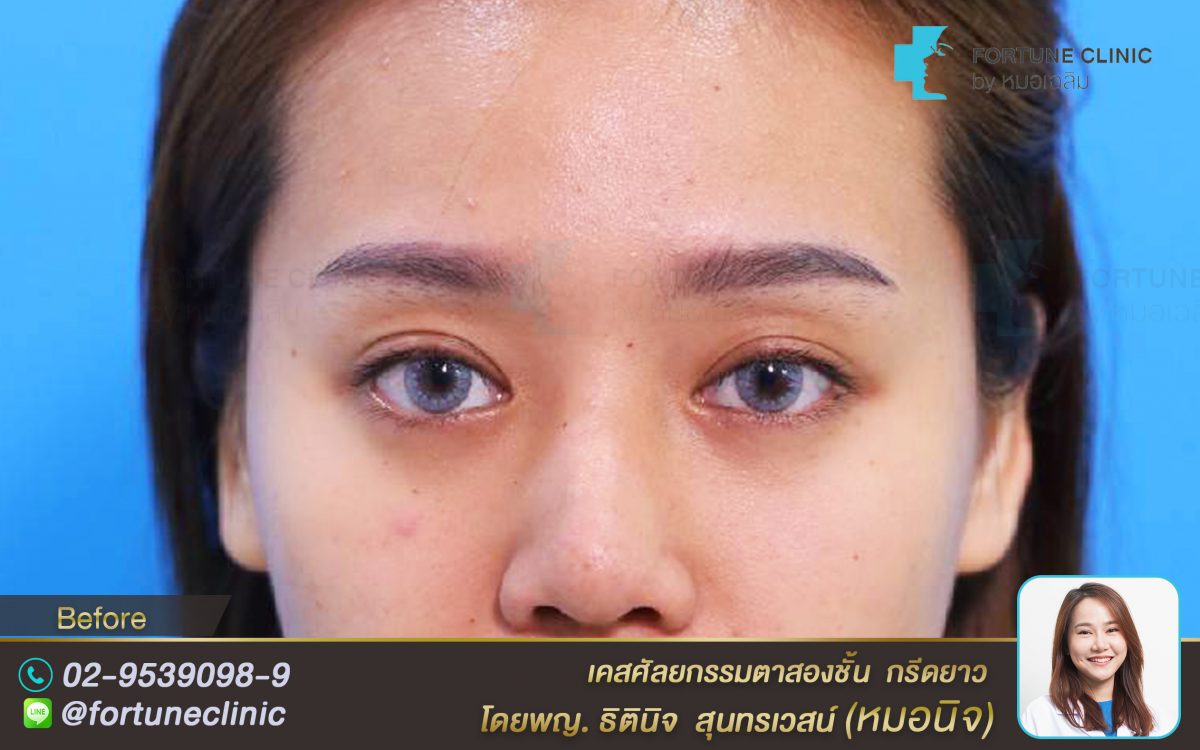 เดิมคนไข้มีชั้นตาอยู่แล้ว แต่มีหนังตาตกหย่อนเล็กน้อย และชั้นตาสองข้างไม่เท่ากัน คนไข้ต้องการให้ชั้นตาใหญ่ขึ้น เท่ากันทั้งสองข้าง เพื่อให้ตาโตขึ้น คมสวยขึ้น