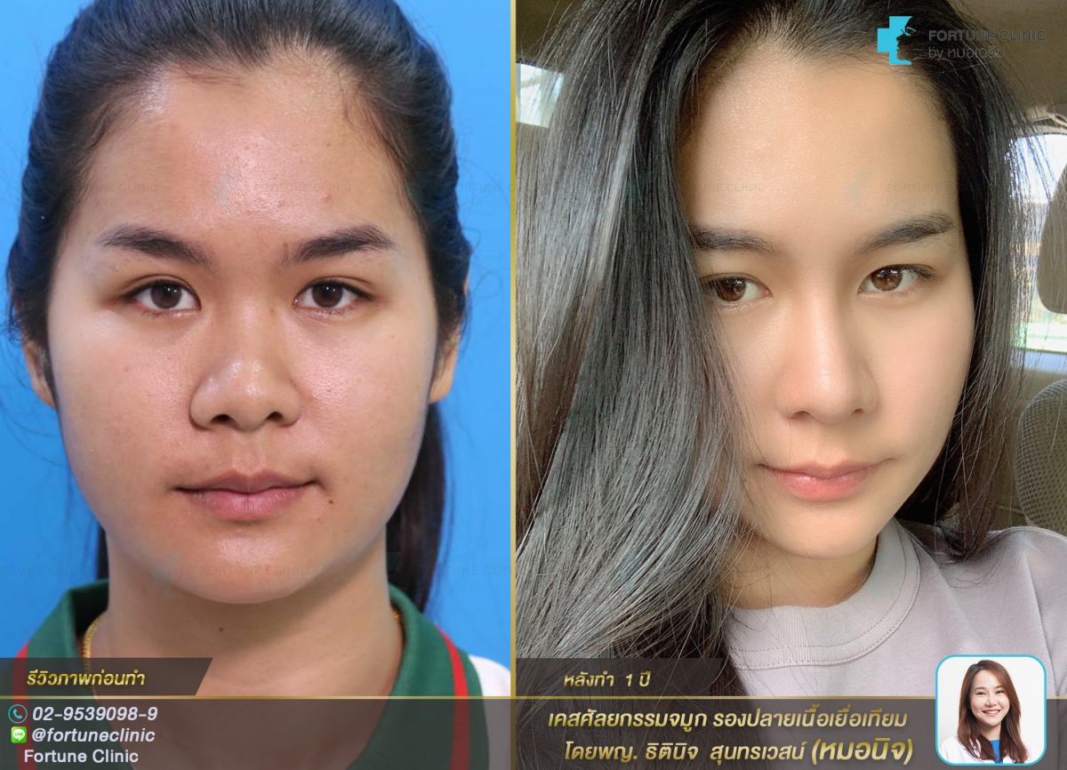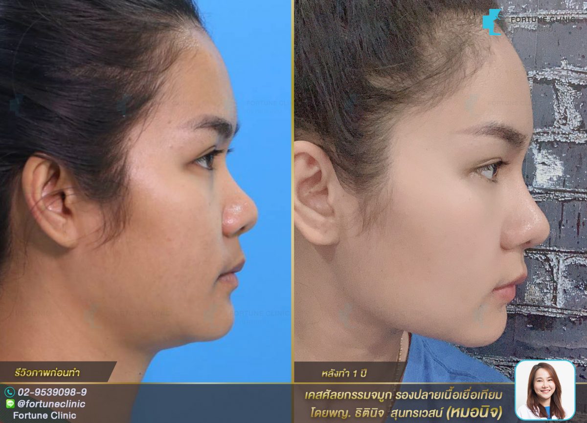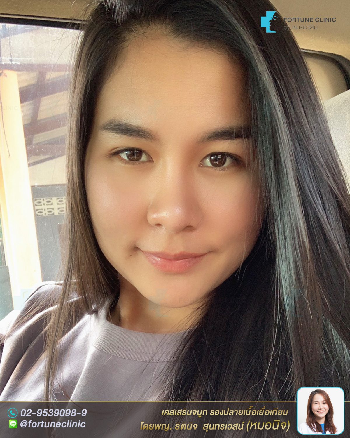 ตอนนี้ครบ 1 ปีแล้ว จมูกสวยเนียนเป็นธรรมชาติมาก หน้าเปลี่ยนสวยมีมิติ สันหัวตาสวยเนียน ปลายจมูกเรียวเล็กลง พุ่งสวยดูเป็นธรรมชาติ ปีกจมูกเรียวเล็กลงทั้งที่ไม่ได้ตัดปีก หน้าตรงเห็นรูจมูกน้อยลง ดูสดใสขึ้นเยอะเลยค่า