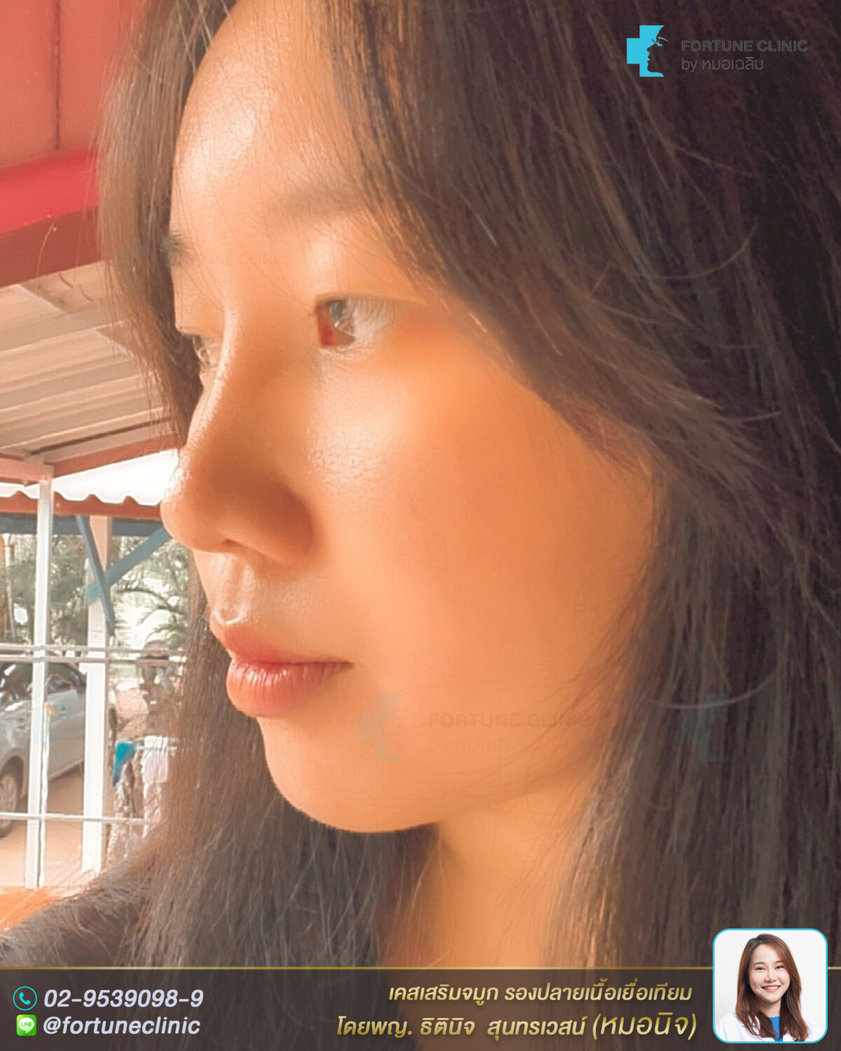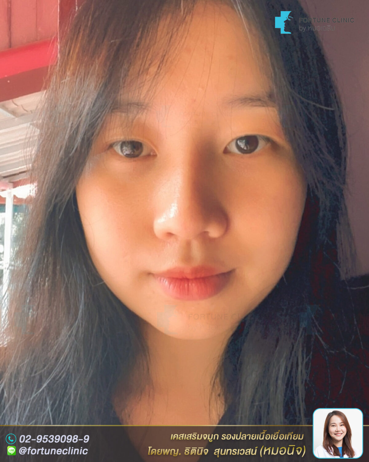 หลังเสริม จมูกสวยโด่งเนียนรับกับรูปหน้า เป็นทรงสวยขึ้นชัดเจน รูปหน้าสวยหวานมีมิติขึ้น สันสโลปหัวตาโด่งสวยอย่างเป็นธรรมชาติ มิติปลายจมูกพุ่งละมุนทำให้ใบหน้าสวยคมมีมิติ จมูกดูเรียวยาวขึ้น มีหยดน้ำมากขึ้น ปีกจมูกยกกระชับขึ้น ดูเรียวสวยขึ้นโดยไม่ต้องตัดปีก หน้าหวานสวยขึ้นมากค่า