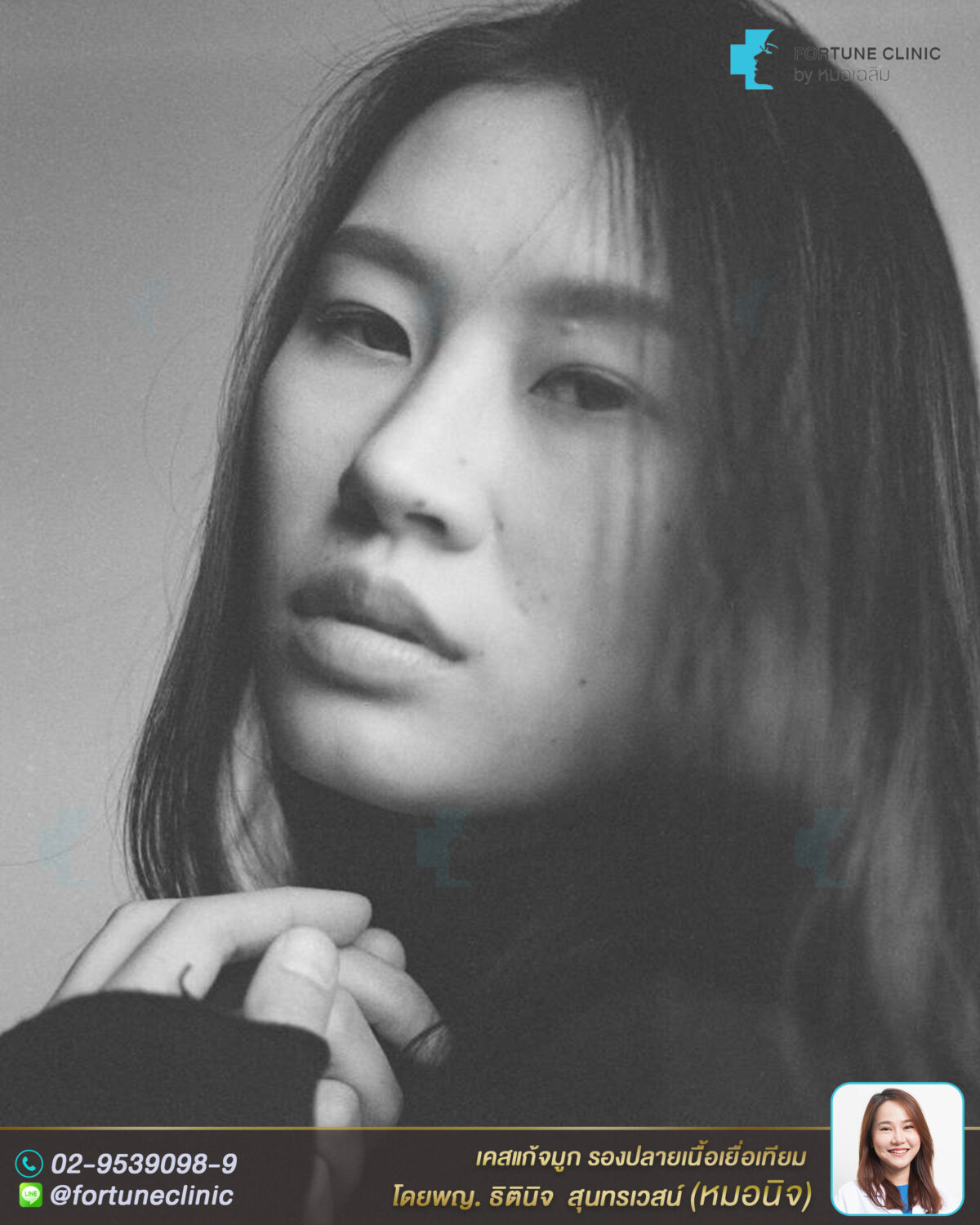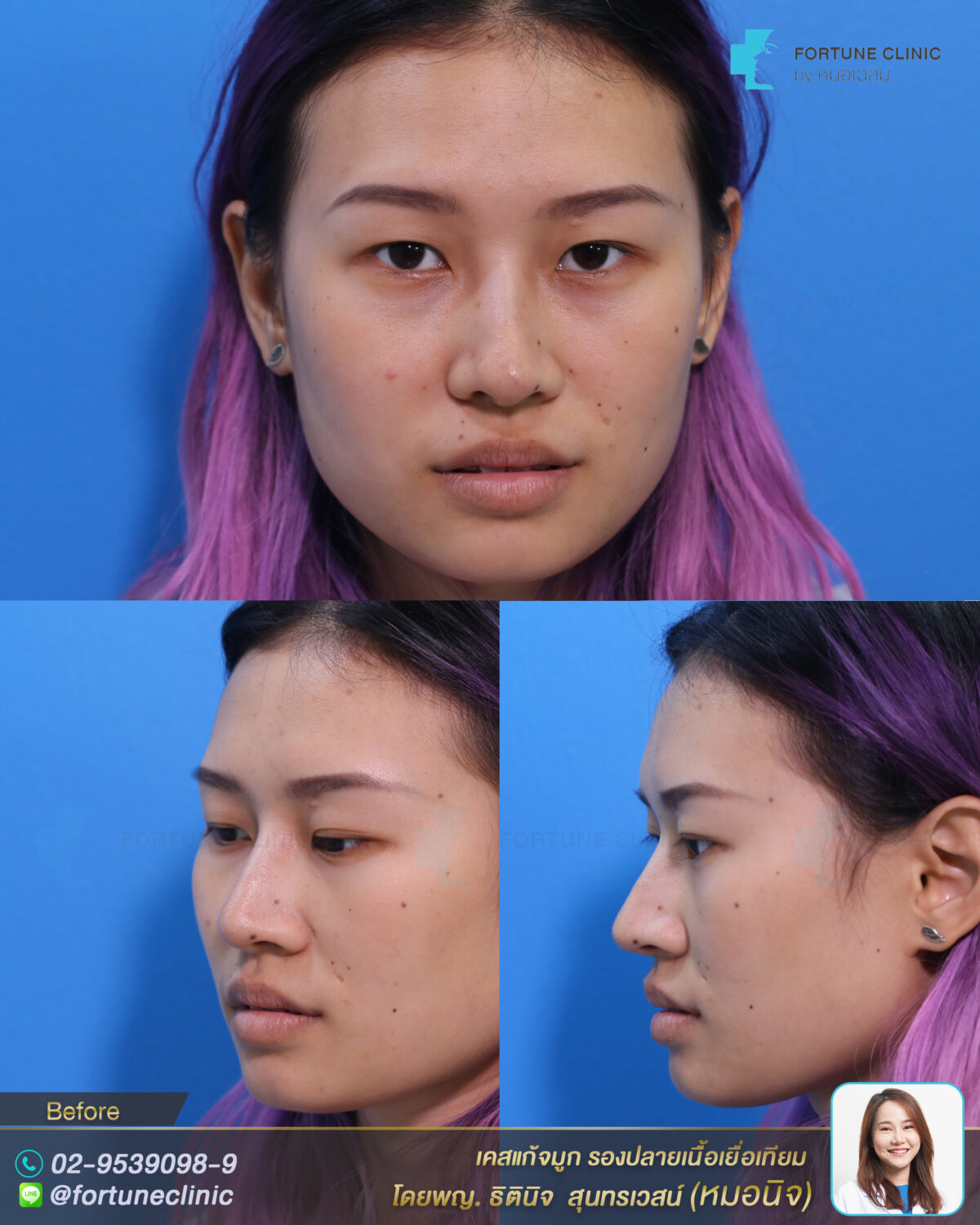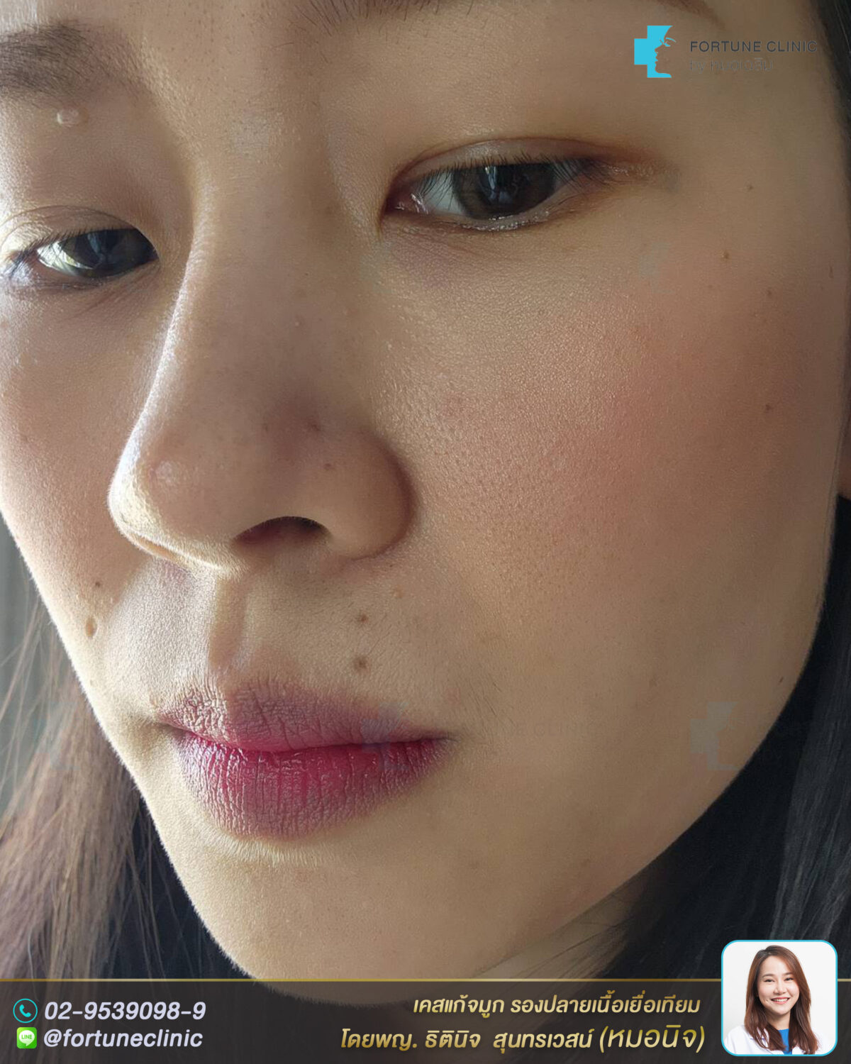 เดิมเคยเสริมจมูกมาก่อน แต่มีปัญหาเรื่องผิวจมูกบาง ทรงแข็ง ปลายจมูกแดงและบางมาก แกนซิลิโคนลอยโยกได้