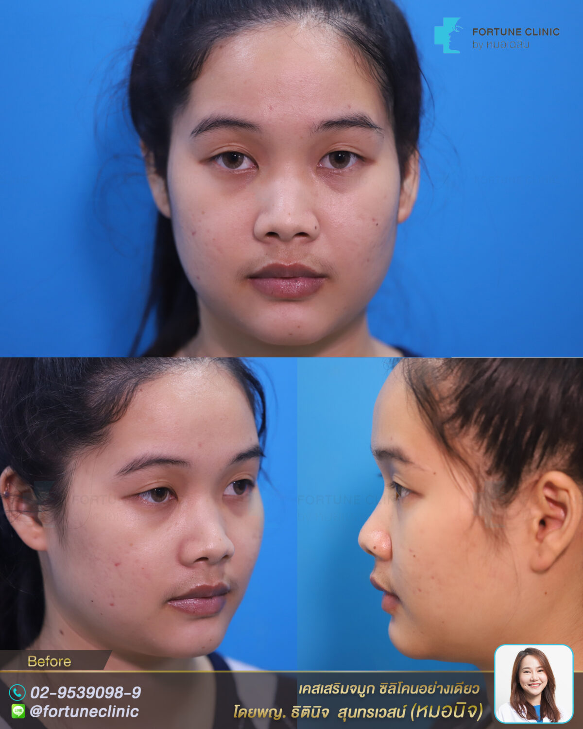 ก่อนเสริมเดิมเนื้อจมูกน้อย ผิวหนังบาง สันจมูกช่วงหัวตาเว้าหักเข้าไป ไม่รับกับหน้าผาก ปลายจมูกสั้น ปีกจมูกกว้าง