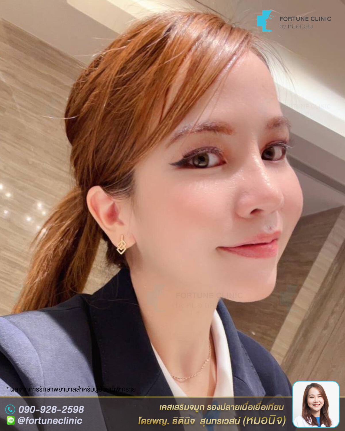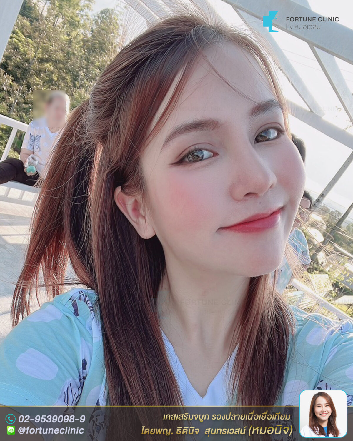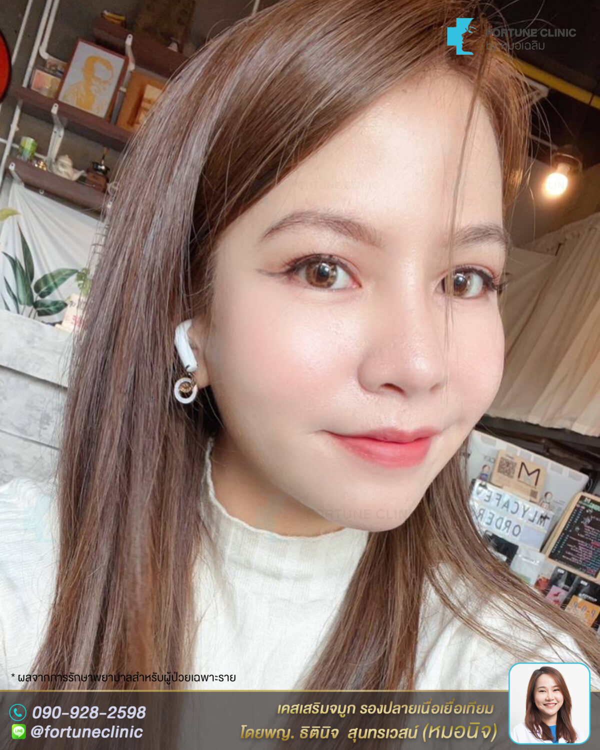 หลังเสริม หน้าดูสวยสดใสขึ้นมากค่า จมูกสวย ดูเรียวยาวขึ้น สันหัวตาโด่งคมขึ้นอย่างเป็นธรรมชาติ สันเรียวเล็ก ปลายจมูกพุ่งเนียนสวย ปีกจมูกเรียวกระชับสวยขึ้น หน้าสวยหวานขึ้นมาก ดูเด็กลงมากๆค่า