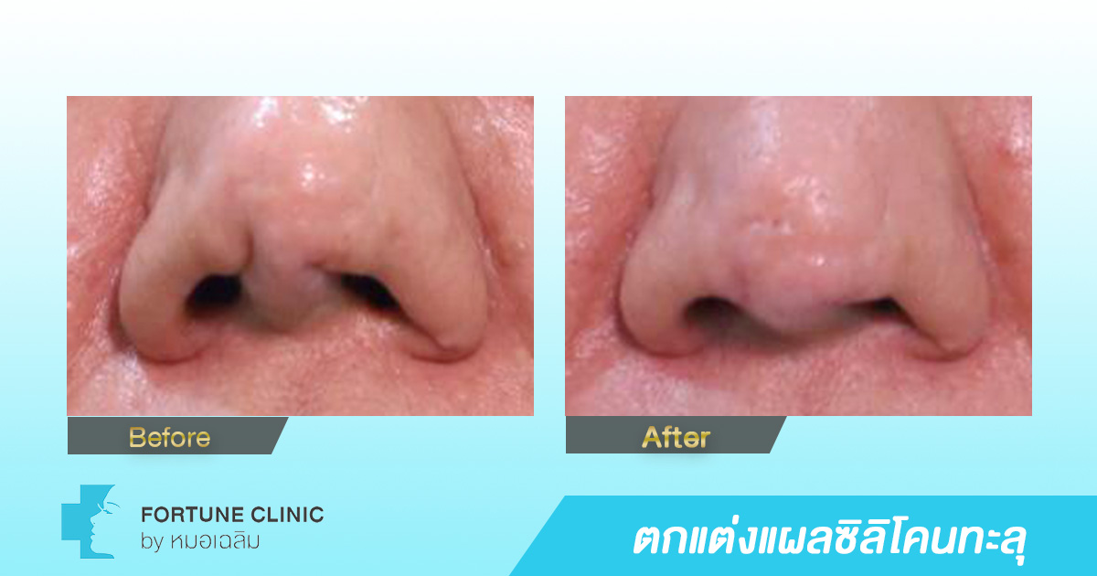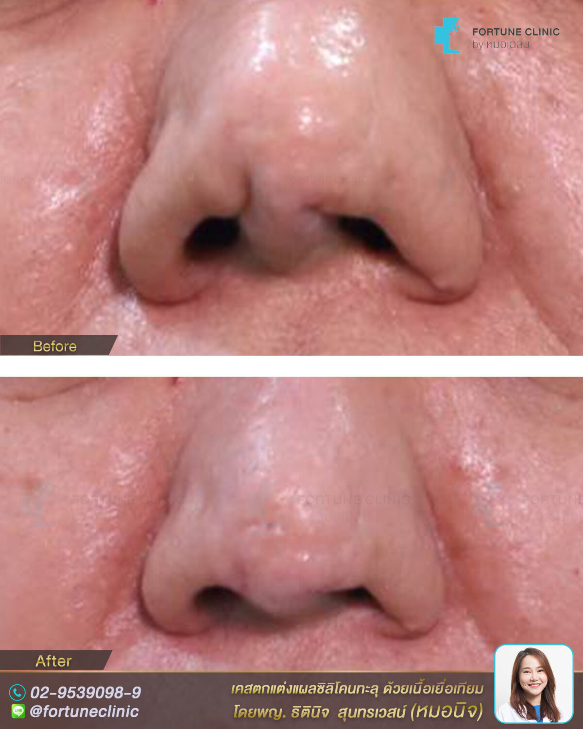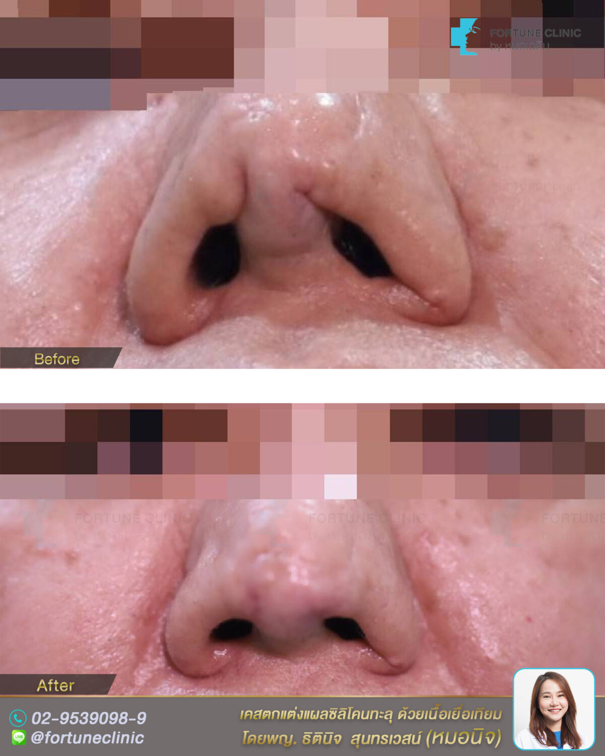 คนไข้มีปัญหารอยบุ๋มที่ปลายจมูก เป็นร่องแผลเป็นลึกที่ปลายและรูจมูก2 ข้าง ทรงรูจมูก2ข้างผิดรูป บิดเบี้ยวและไม่เท่ากัน เกิดขึันหลังจากถอดซิลิโคน เนื้อเยื่อปลายเสียหาย รั้นเชิดขึ้น ทำให้เสียความมั่นใจ