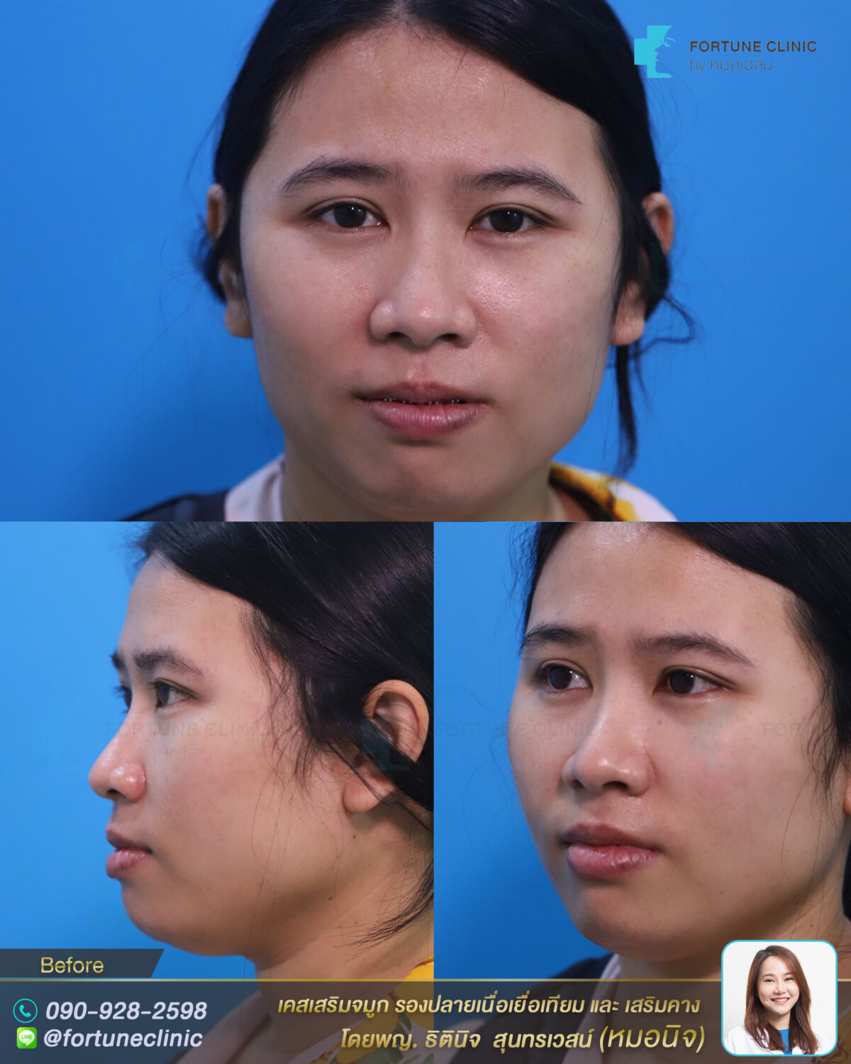 เป็นเคสเนื้อจมูกน้อย ผิวหนังบาง ฐานกระดูกเอียง สันจมูกไม่โด่งทำให้หน้าไม่มีมิติ ช่วงปลายจมูกใหญ่และทรงงุ้มตก