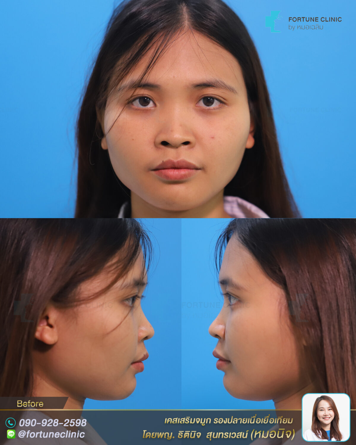 เดิมคนไข้เนื้อจมูกน้อยมาก ผิวบางมาก ช่วงสันจมูกเว้าลึก หัวตาหัก ไม่รับกับหน้าผาก ทำให้หน้าไม่มีมิติ ช่วงปลายจมูกตัดสั้น ปลายขาดหยดน้ำ ช่วงปีกดูบาน