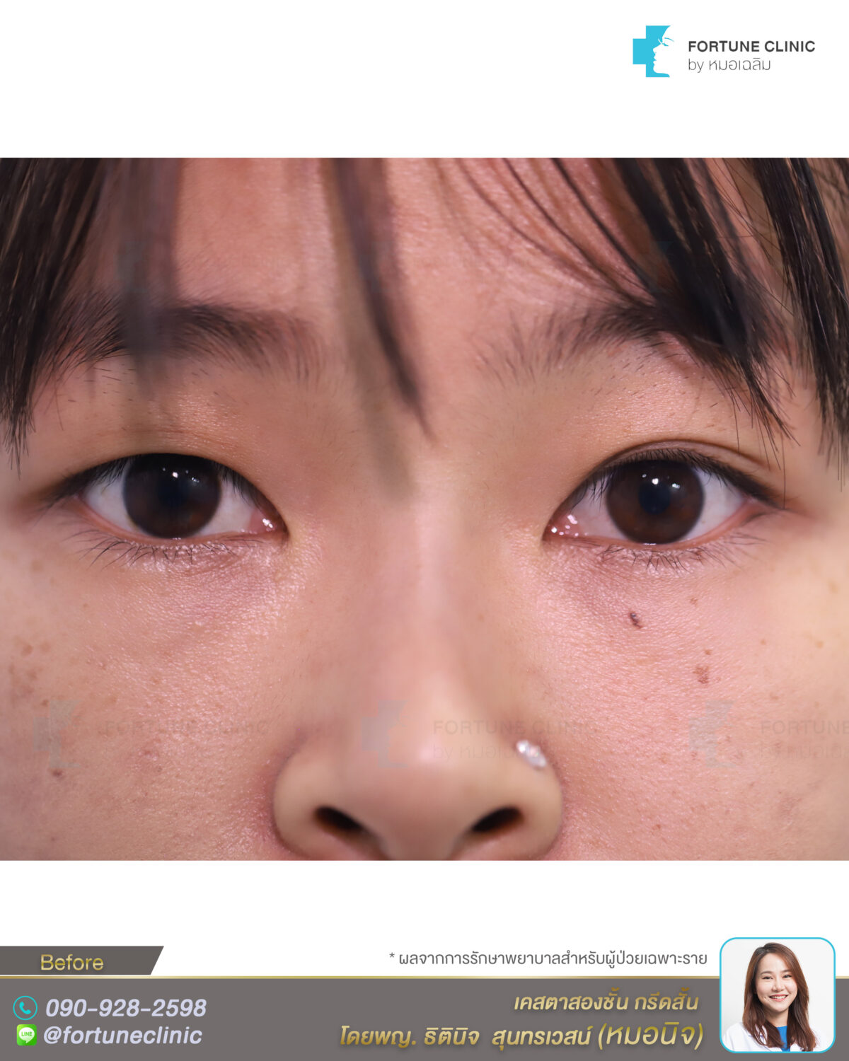 เดิมตา 2 ข้าง มีชั้นตาไม่เท่ากัน ข้างนึงมีชั้นตาเล็กๆ อีกข้างไม่มีชั้นตา ทำให้ตาดูไม่เท่ากัน ดูตาตี่ข้างหนึ่ง ต้องการให้ชั้นตาชัดขึ้นและดูเท่ากันทั้ง2ข้าง ให้ตาดูหวาน ให้ใบหน้าดูสวยสดใสขึ้น