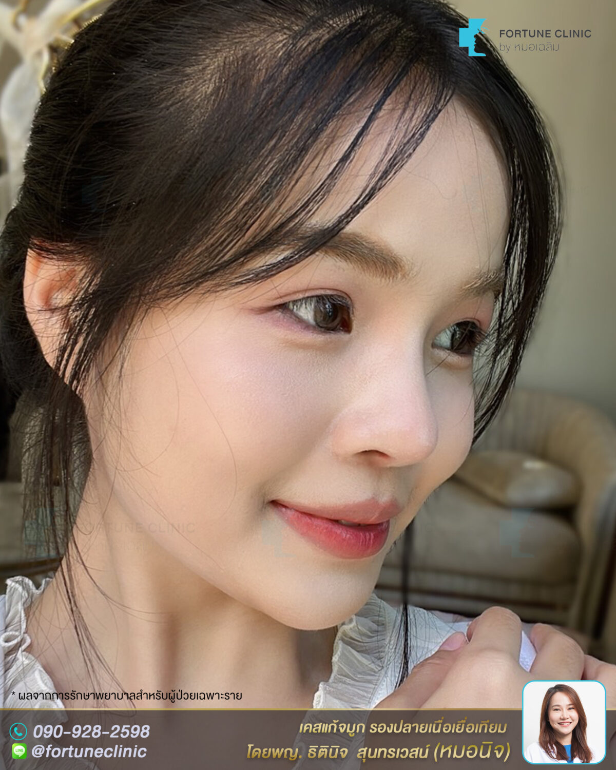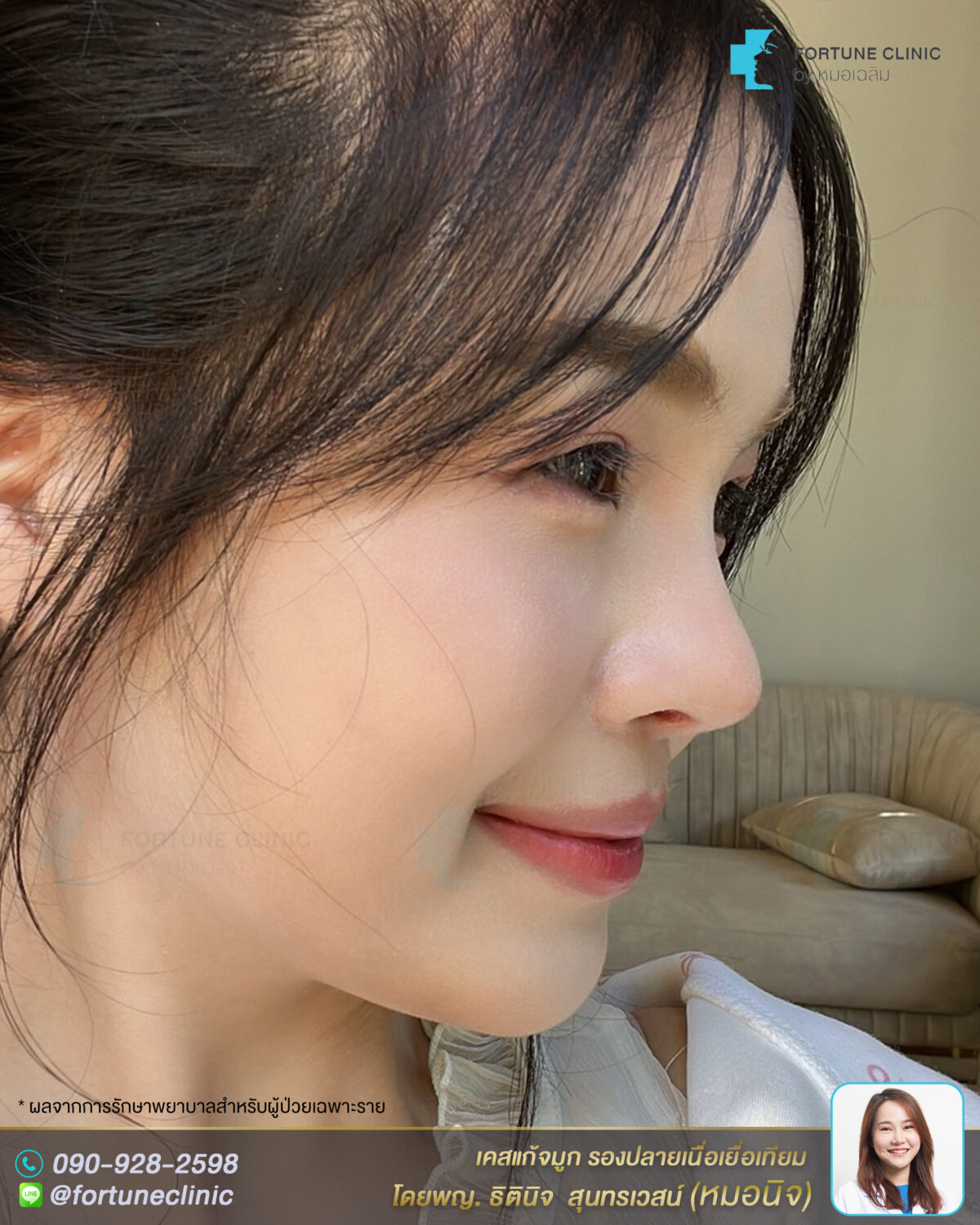 หลังแก้จมูก จมูกดูเรียวเล็กลงและดูเรียวยาวสวยขึ้น ทรงสโลปปลายพุ่งสวยเนียนเป็นธรรมชาติ ปลายจมูกที่เคยงุ้มตก บางใส มิติยกพุ่งและเรียวเล็กลง เนื้อปลายเต็มมนสวย มิติใบหน้าดูสวยหวาน หน้าเปลี่ยน ดูเด็กลงมากๆค่า