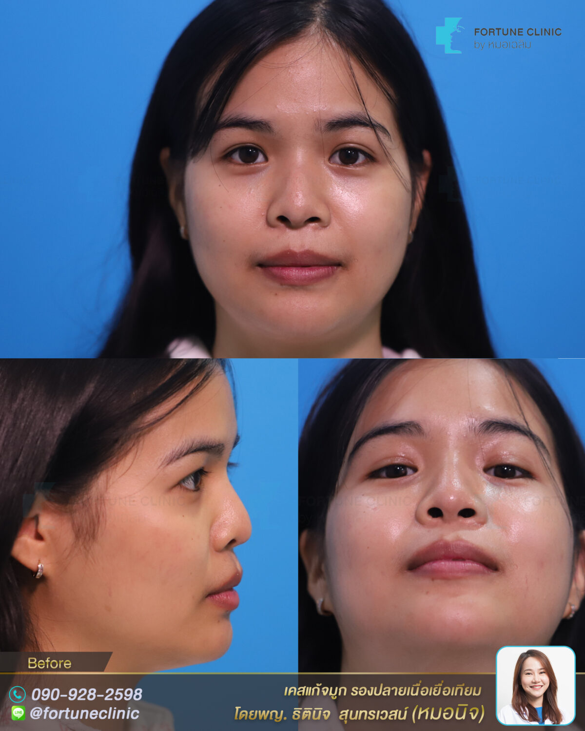 เดิมเคยเสริมซิลิโคนมาก่อน แต่ใช้เทคนิคไม่ตรงกับปัญหา ทำให้ซิลิโคนลอยโยกได้ และซิลิโคนไหลลง ทำให้ทรงงุ้มปลายจมูกตก และดันให้ปลายบางใสจนปลายจะทะลุ