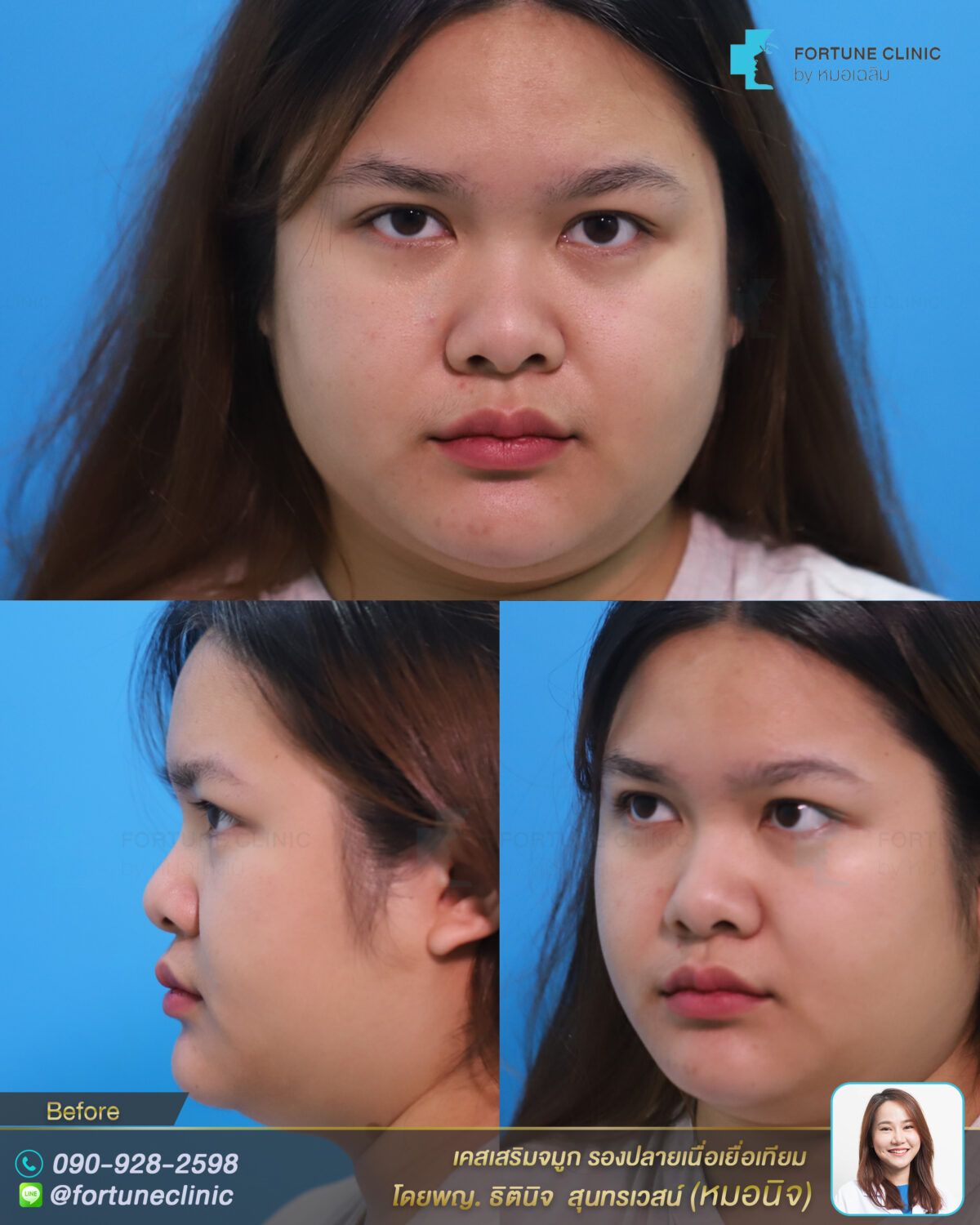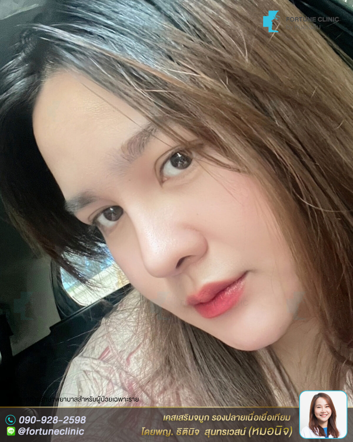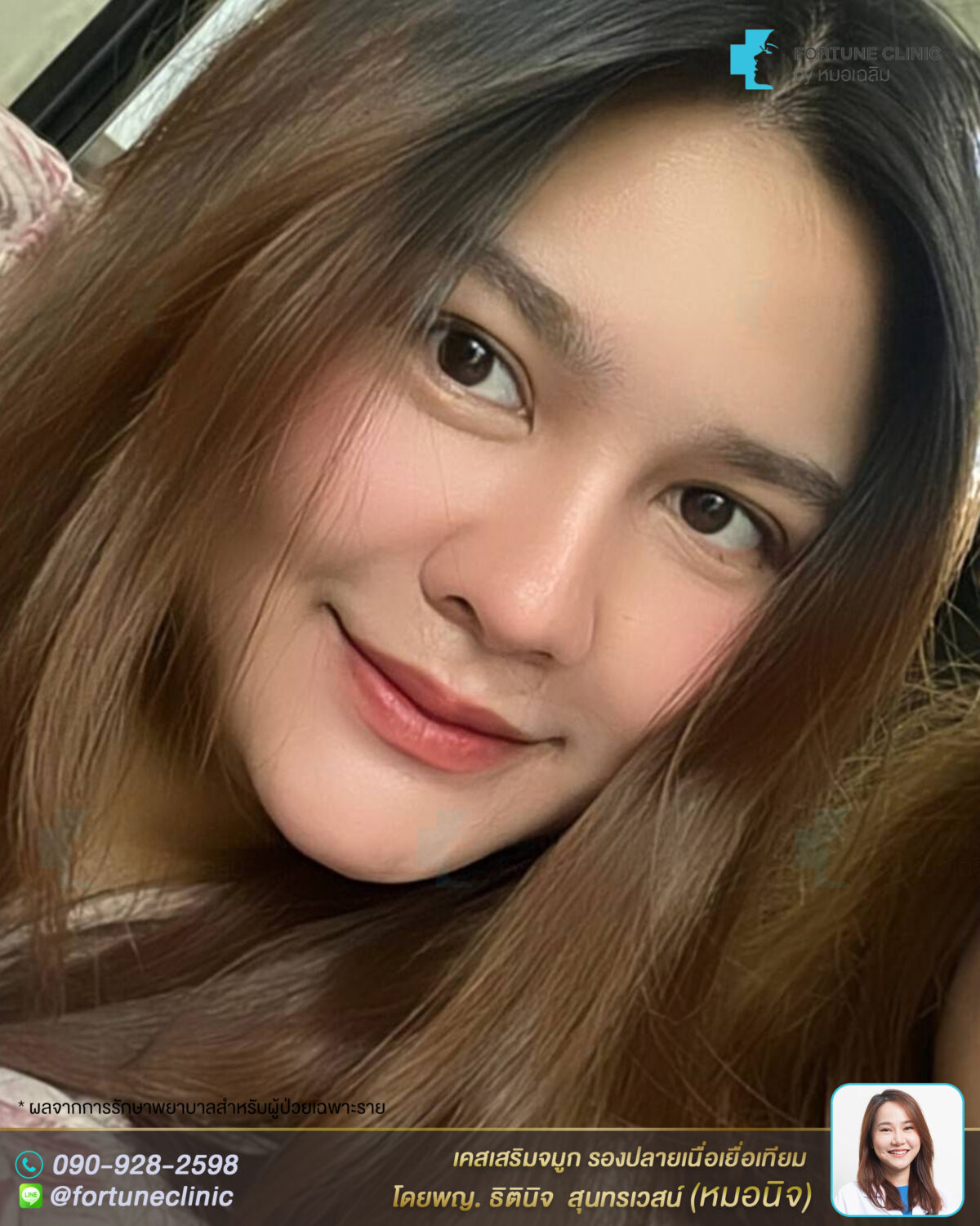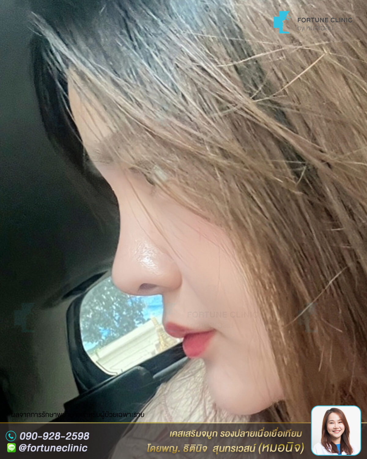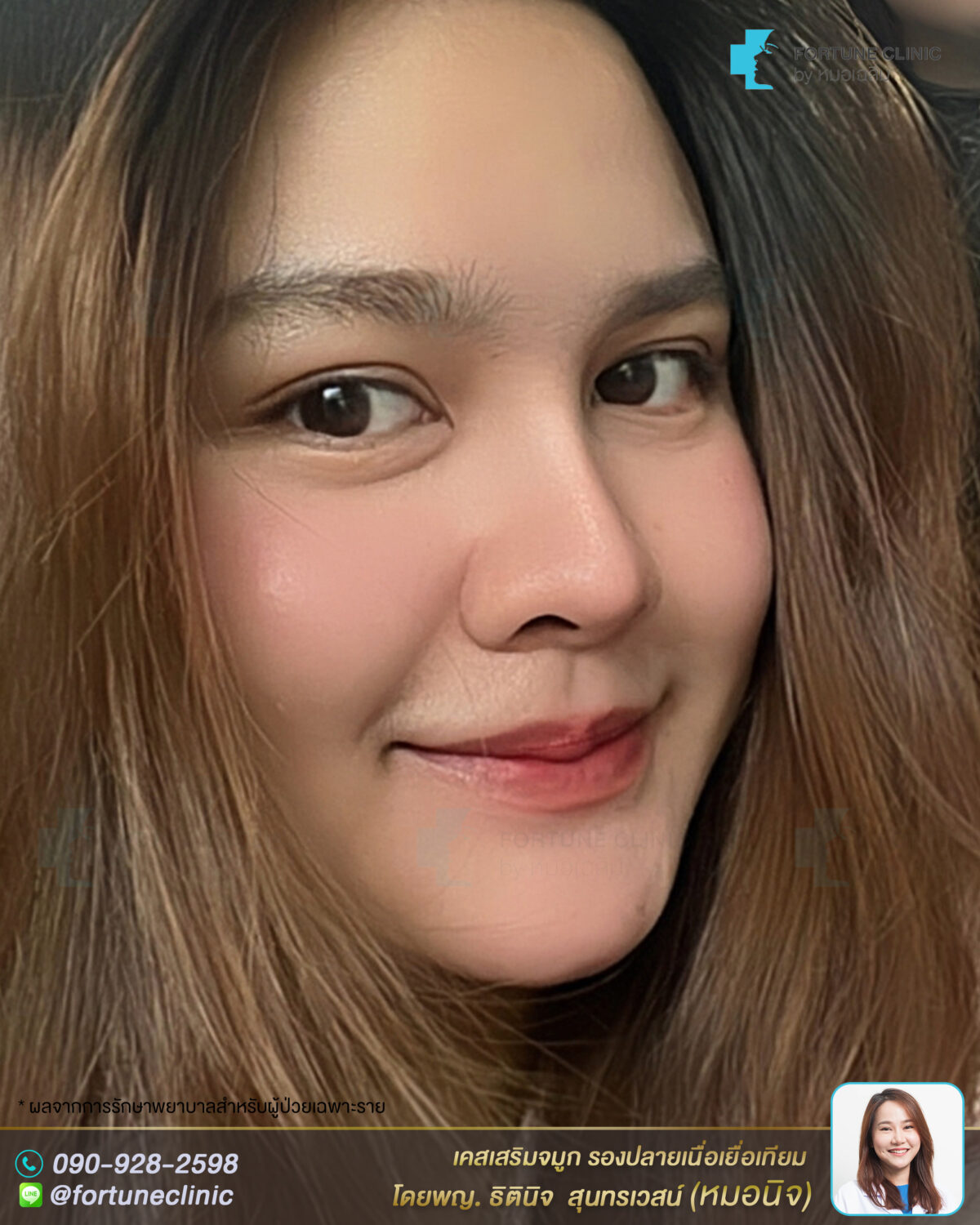 หลังเสริม ใบหน้าดูหวาน มีมิติขึ้นมากค่า สันจมูกเรียวยาวสมส่วนมากขึ้น สวยคมขึ้นอย่างเป็นธรรมชาติ จมูกดูเรียวสวยขึ้น ปลายจมูกเรียวเล็กลง มิติพุ่งสวย ดูหวานละมุนขึ้นมากค่า