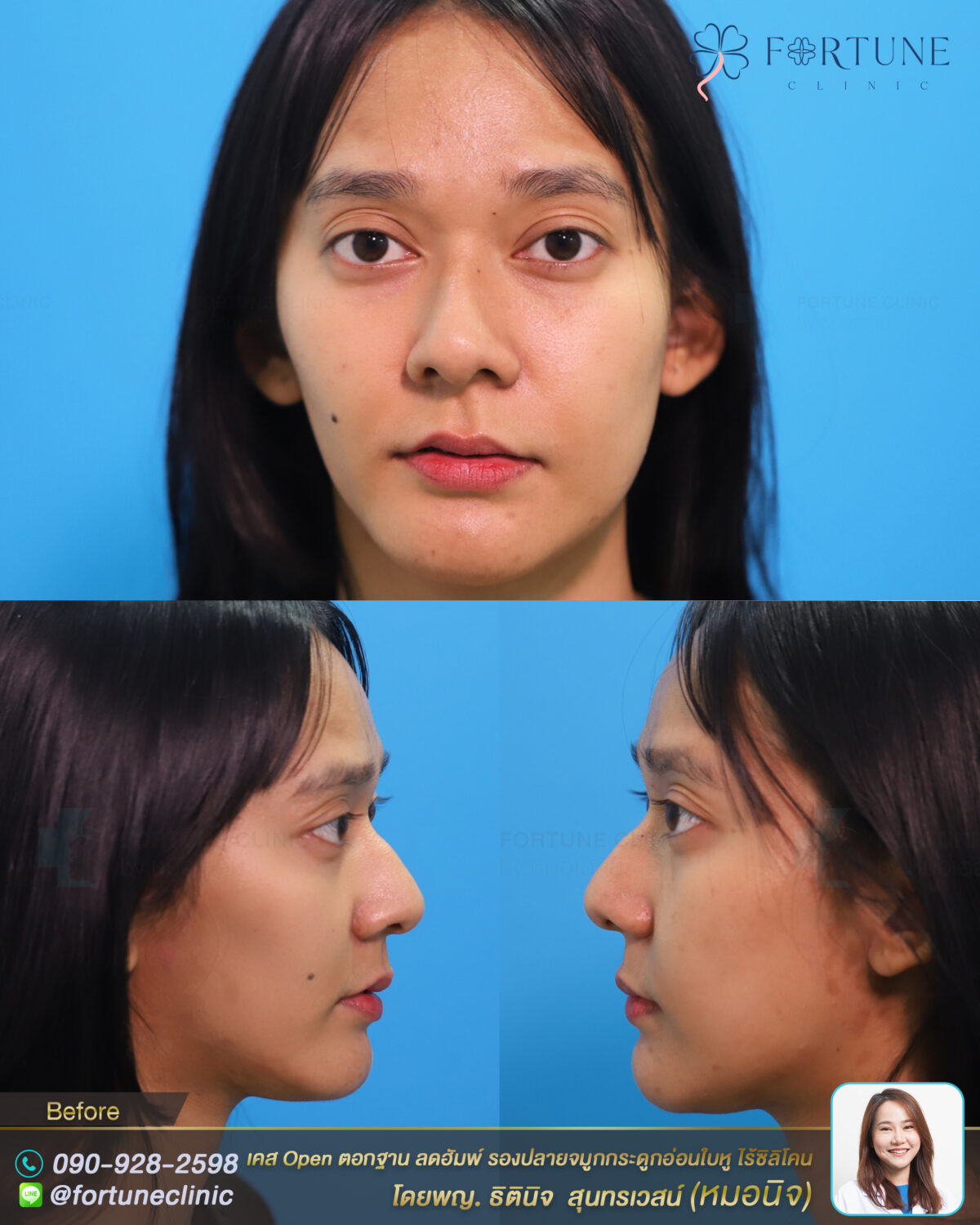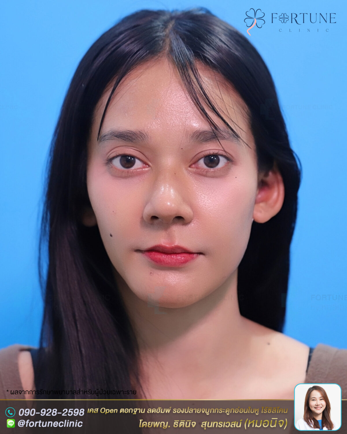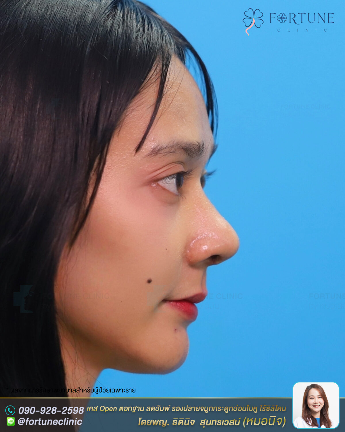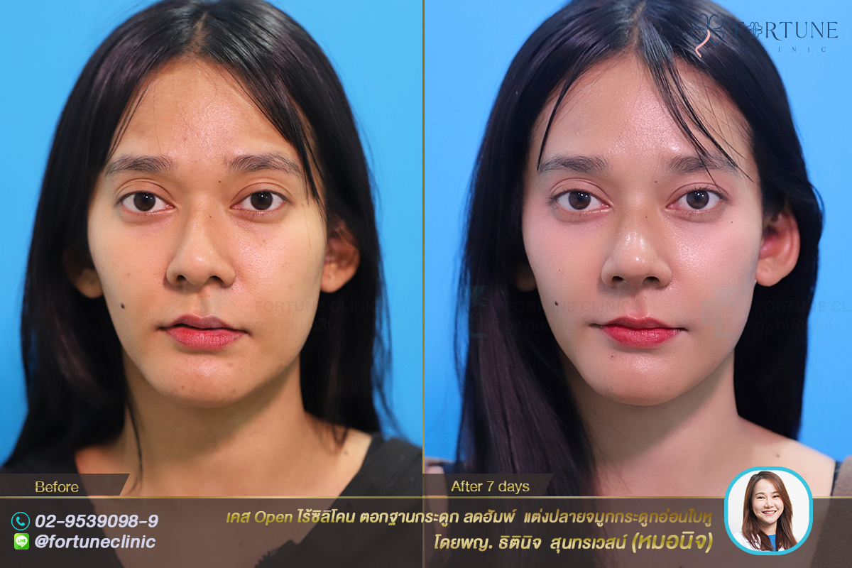 หลัง Open ปรับโครงสร้าง จมูกดูตรงขึ้น เปลี่ยนทรงโก่งงุ้มฮัมพ์สูง เป็นทรงสโลปปลายพุ่ง หน้าคมสวยหวานขึ้น สันจมูกเรียบขึ้น จากการลดฮัมพ์ ใบหน้าดูมีมิติขึ้น จมูกดูโด่งคม ปลายยกพุ่งขึ้น ดูเด็กลงมากค่า