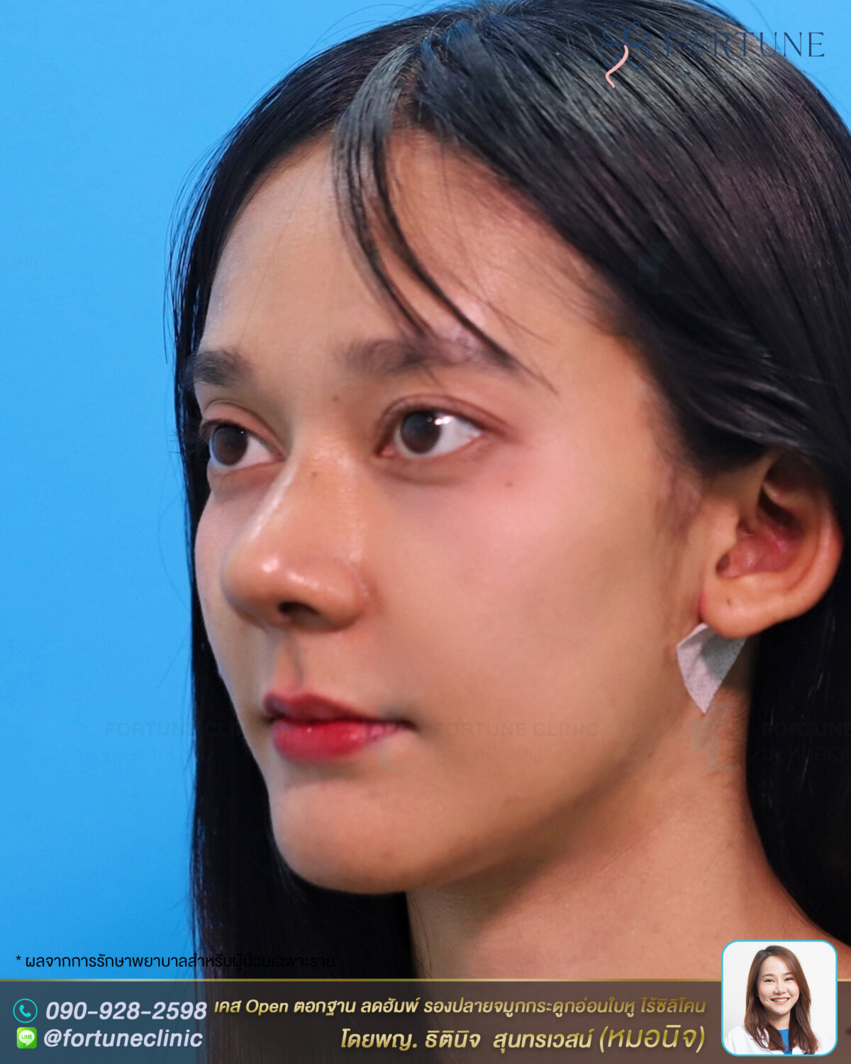 – แต่งปลายจมูกด้วยกระดูกอ่อนหลังใบหู แต่งปลายงุ้มเป็นปลายพุ่ง สร้างมิติโด่งคม