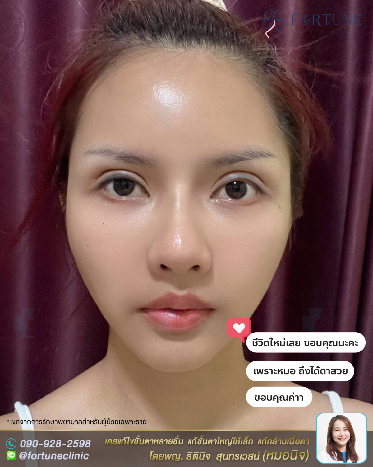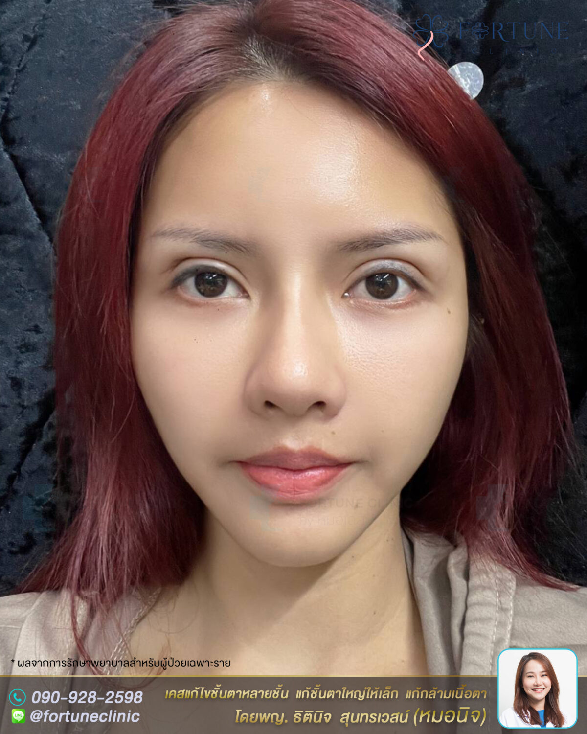 หลังแก้ไข ชั้นตาดูเรียวเล็กลง รับกับทรงกระบอกตามากขึ้น ชั้นตาเป็นชั้นสวย และไม่เป็นรอยทับซ้อนหลายๆชั้นแล้วค่า หมอนิจแก้ไขรอยแผลผ่าตัดครั้งก่อนให้เนียนสวย ดูดีขึ้น จนแทบมองไม่ออกเลยค่า จากการแก้ไขกล้ามเนื้อตาอ่อนแรง ทำให้ตาเปิดสวยขึ้นอย่างเป็นธรรมชาติ สดใสขึ้น เห็นตาดำชัดขึ้น ไม่ดูปรือ ดูอ่อนเยาว์ลงอย่างเห็นได้ชัดเลยค่า