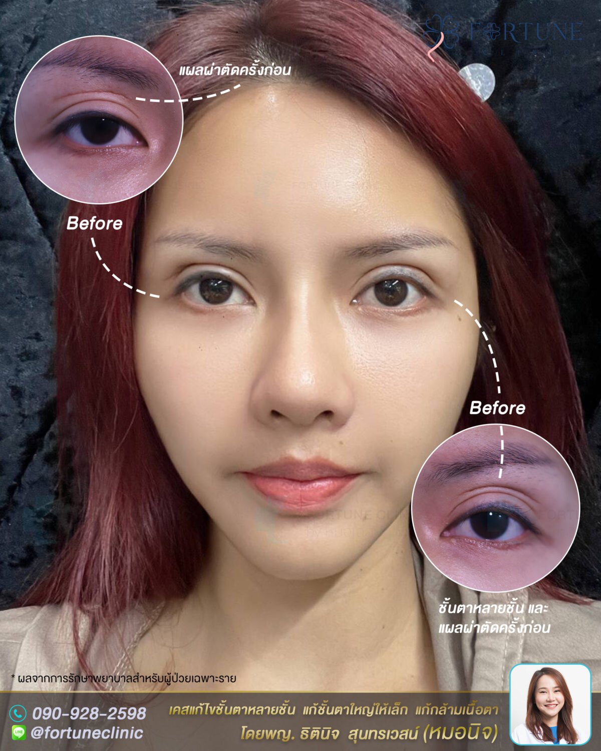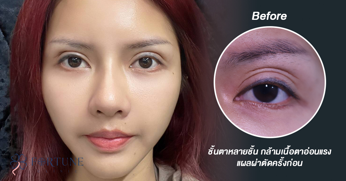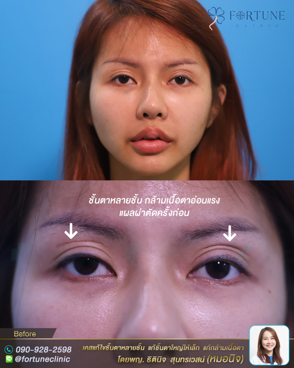 เคสนี้เคยผ่านการทำตามาแล้ว 3 ครั้ง และเคยฉีดไขมันที่เปลือกตามาก่อน แต่ยังมีปัญหาเวลาลืมตา ชั้นตาซ้อนพับกันหลายชั้น เห็นรอยแผลผ่าตัดชัด ชั้นตาใหญ่และหนาเกินไป ดูไม่สวยและดูมีอายุ ตาดูปรือ ตาดำไม่ชัด ไม่สดใส
