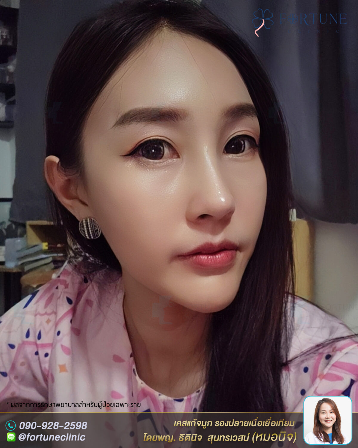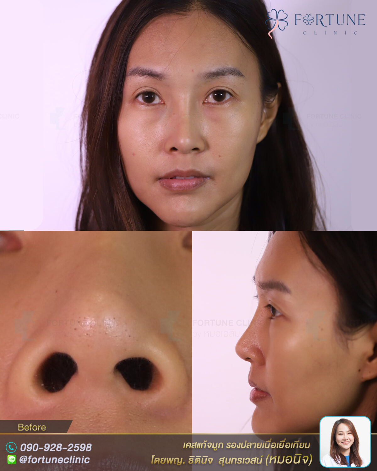 เดิมเสริมซิลิโคนมานาน 10 ปี มีปัญหาแกนซิลิโคนเอียงมาทางซ้าย และ ซิลิโคนลอยโยกได้ ทำให้เห็นเป็นขอบแกนชัด ทรงแข็ง ดูไม่เป็นธรรมชาติ รูปหน้าดูแบนไม่มีมิติ ปลายจมูกบาง เนื้อจมูกน้อย ผิวหนังบาง