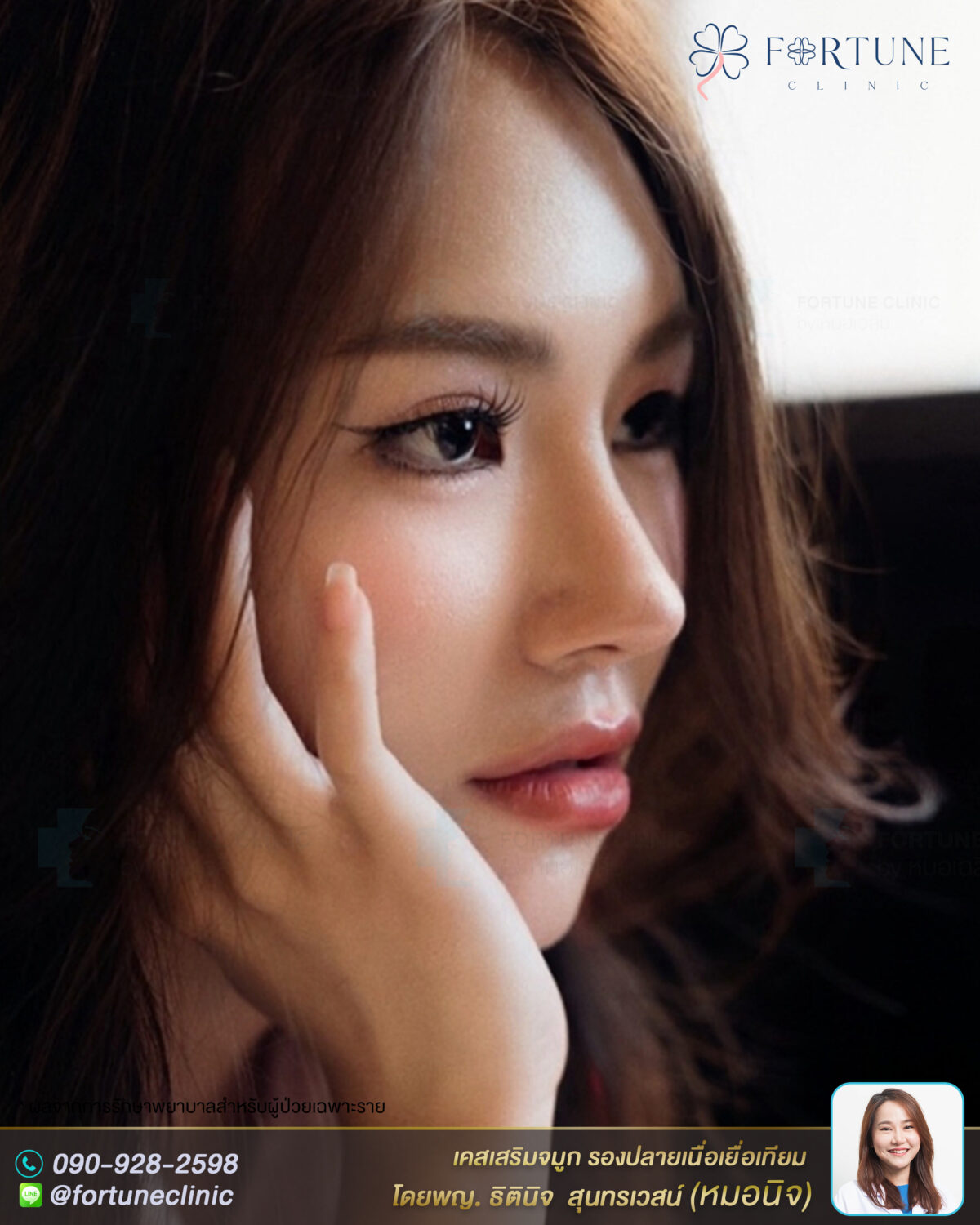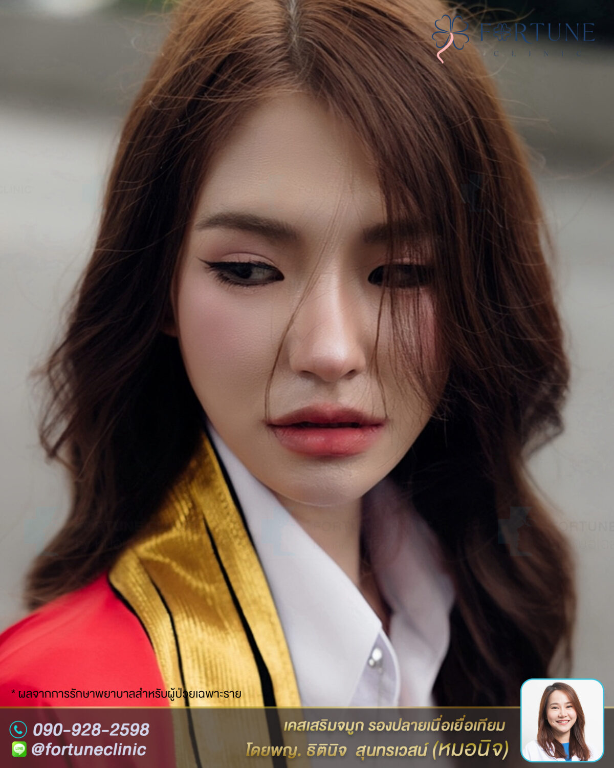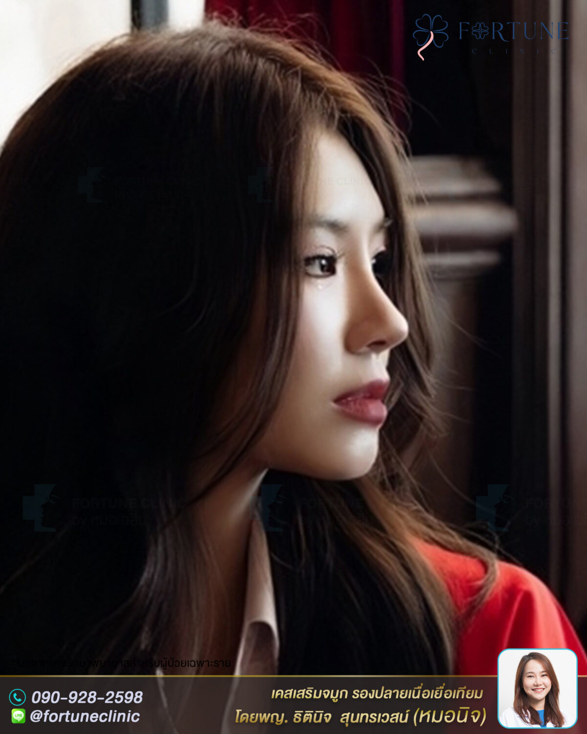 – รองปลายจมูกด้วยเนื้อเยื่อเทียม ตกแต่งปลายให้ดูเป็นธรรมชาติ ปลายเรียวสวย มิติพุ่งขึ้น