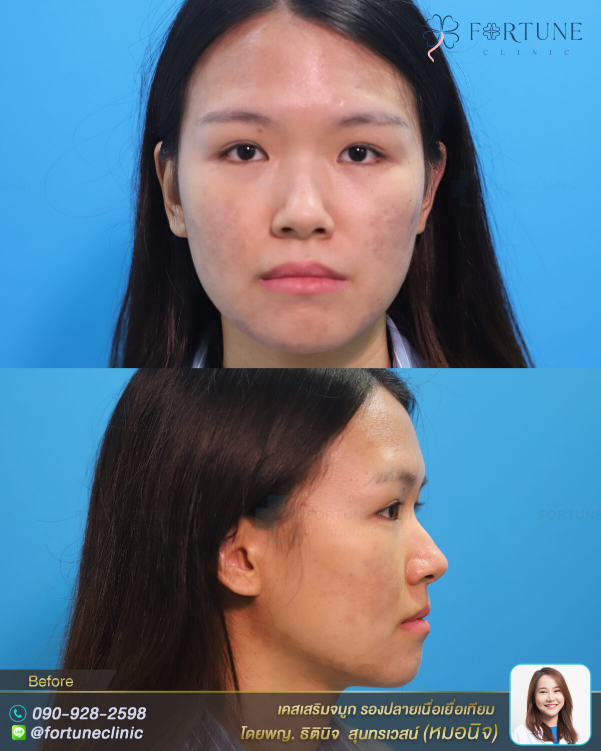 เดิมเป็นเคสที่ฐานกระดูกเอียง มีฮัมพ์สูง ทำให้สันจมูกดูเป็นคลื่นไม่เรียบ ช่วงสันหัวตาหักเว้าเข้าไป ปลายจมูกสั้น ปลายจมูกใหญ่ ผิวหนังบาง เนื้อจมูกน้อย