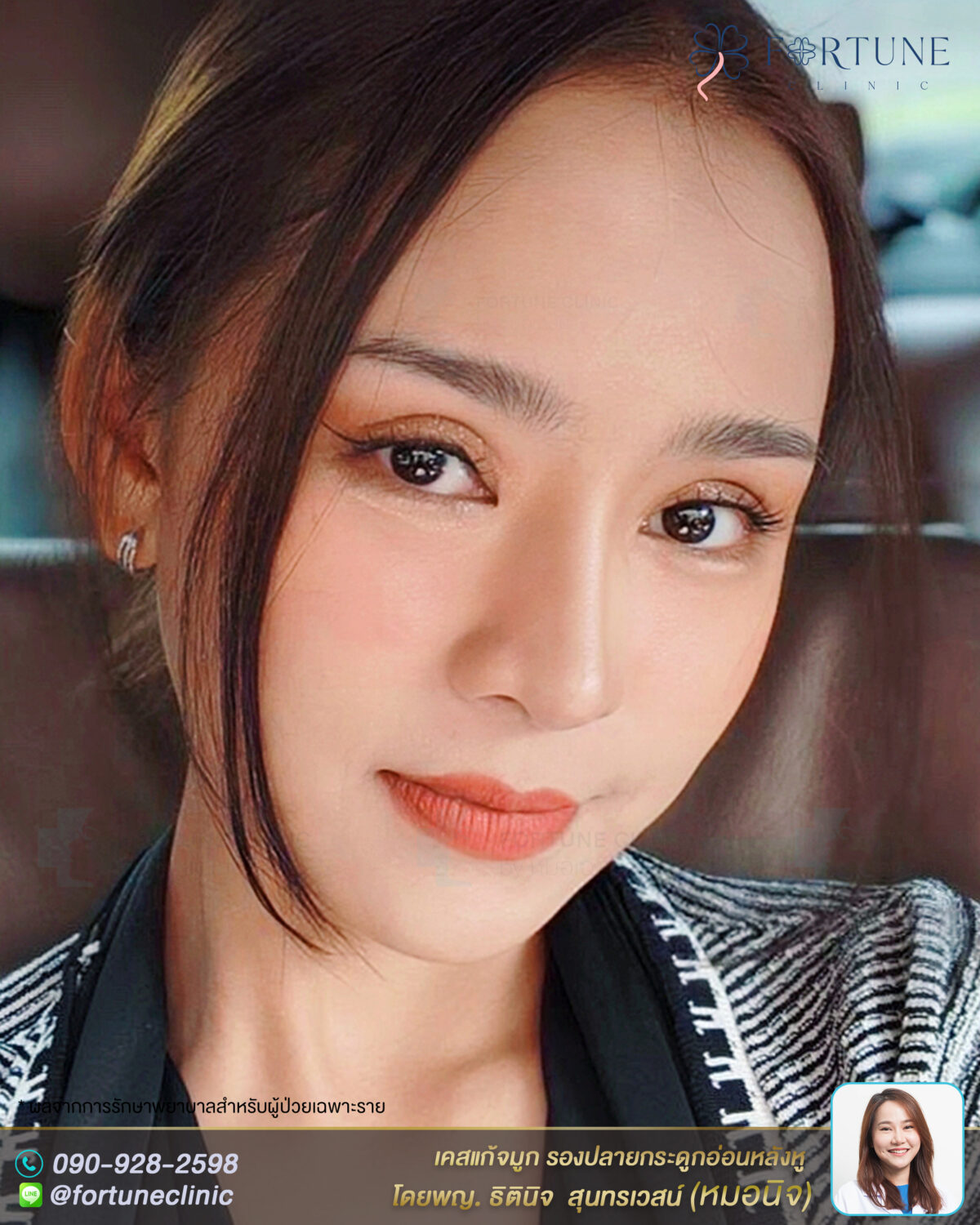 หลังแก้จมูกดูสวยหวาน หน้าเปลี่ยนมาก สันจมูกเรียวยาว ดูคมขึ้นมาก จมูกดูเรียวเล็กลง สันหัวตาเป็นสโลปเนียนเรียวสวย ปลายจมูกเรียวเล็กลง มิติพุ่งสวย ปีกเรียวกระชับขึ้นโดยไม่ต้องตัดปีก หน้าสวยหวานขึ้นมาก ดูสดใสขึ้นและดูเด็กลงมากค่า