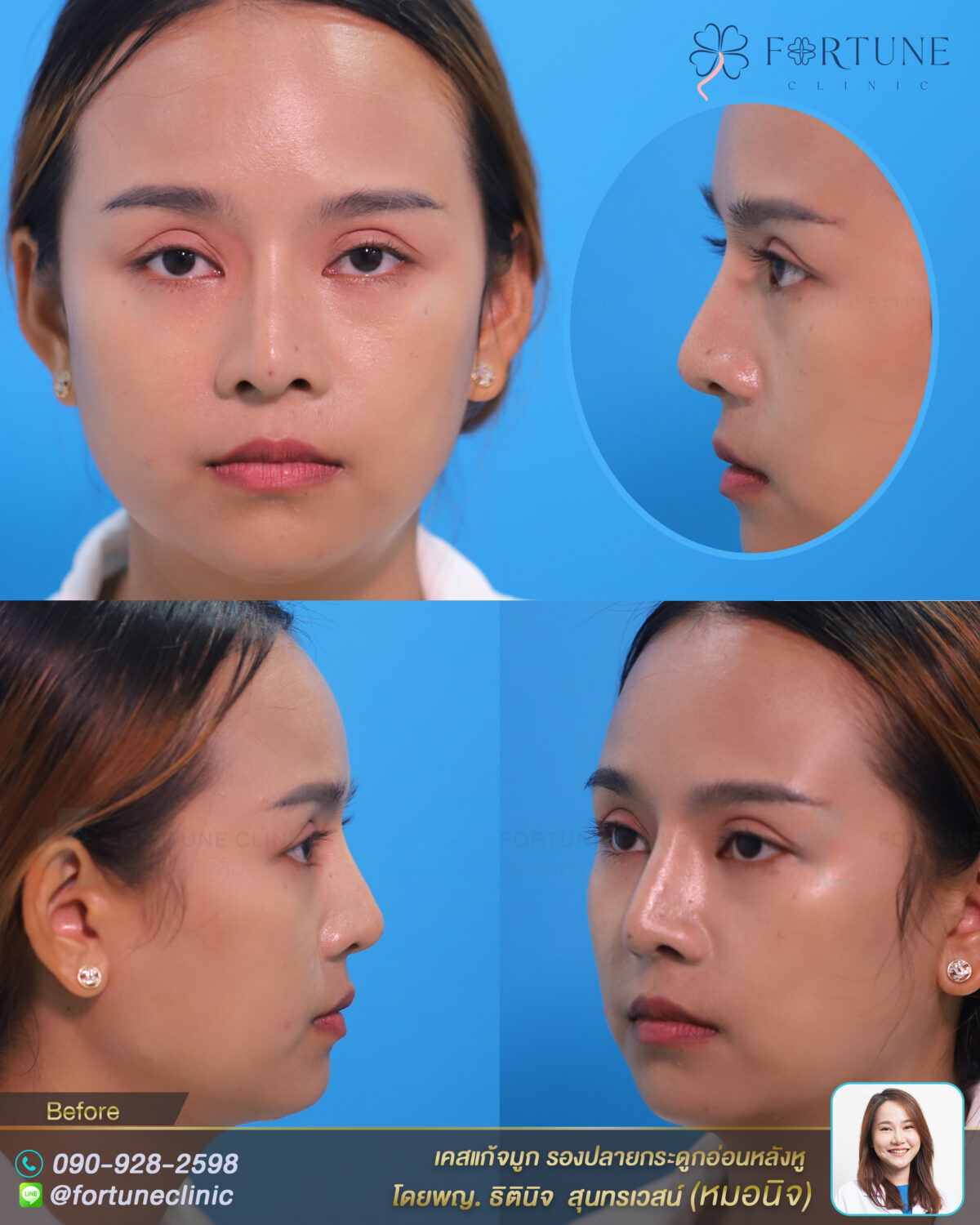 เดิมเคยเสริมซิลิโคนมาแล้ว แต่แกนซิลิโคนเอียง เห็นขอบแกนชัด ผิวหนังบาง สันจมูกโด่งเกินไปดูไม่ธรรมชาติ สันบาง สันหัวตาดูแข็งทื่อ หน้าดูดุ ปลายบางและงุ้มตกลง ทำให้หน้าดูมีอายุ
