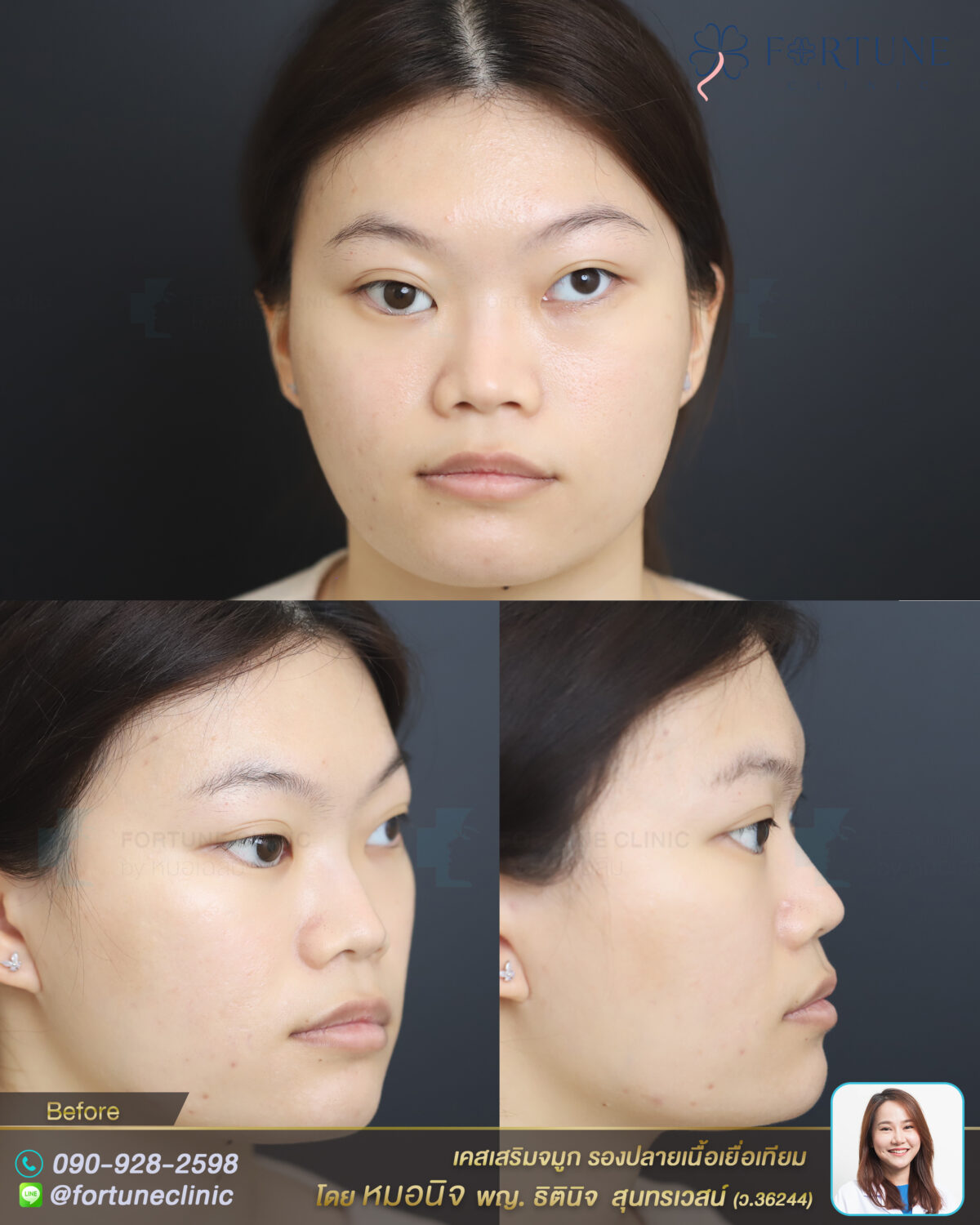 – เสริมด้วยซิลิโคน ออกแบบให้ทรงเรียวให้จมูกดูเรียวยาวขึ้น เพิ่มความโด่งของหัวตาเป็นสโลปหวานๆธรรมชาติ ไล่ความโด่งไปหาปลายจมูกและยกปลายพุ่ง เป็นทรงสโลปปลายพุ่ง แล้ววางซิลิโคนชั้นใต้เยื่อหุ้มกระดูกเพื่อความสวยเนียน