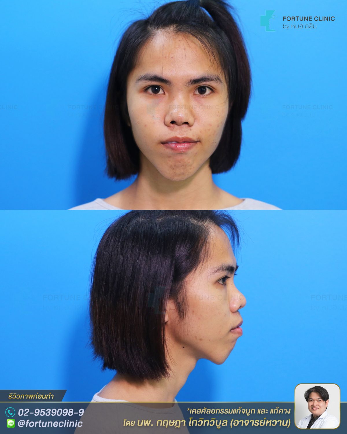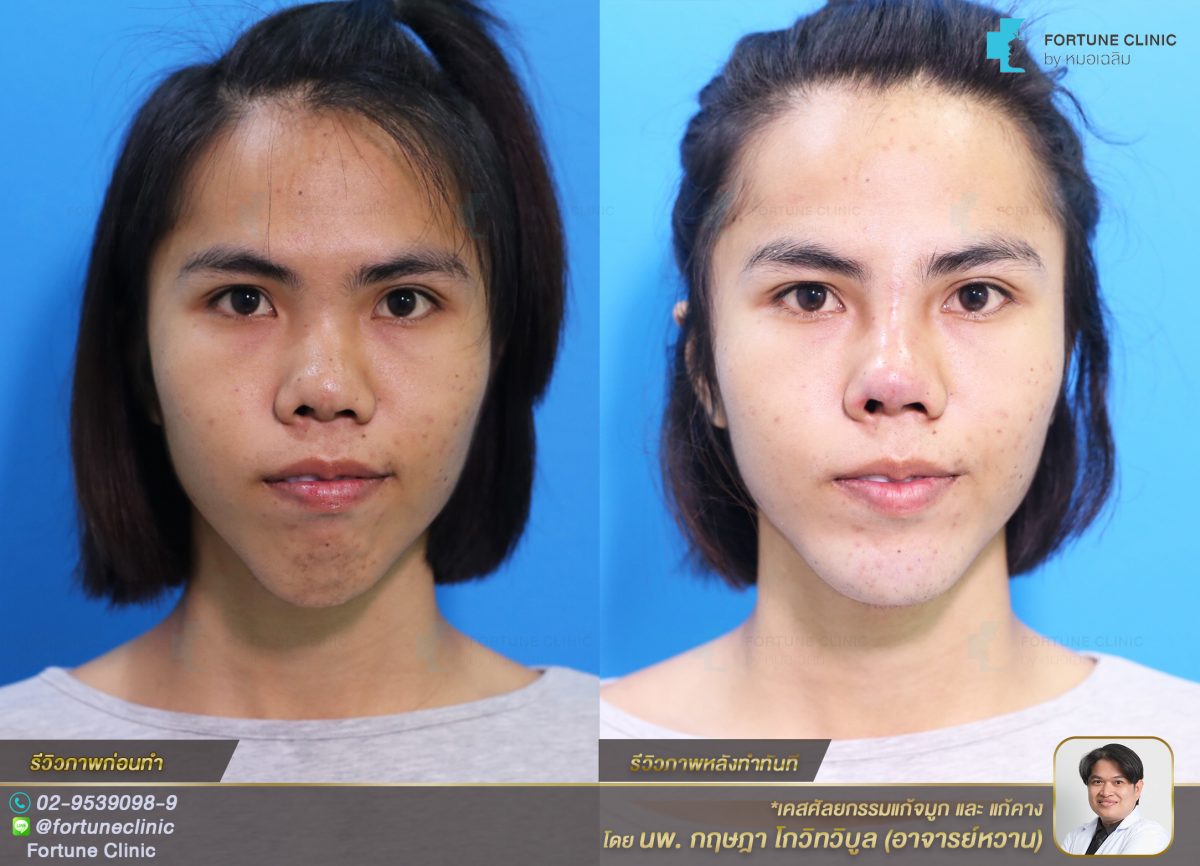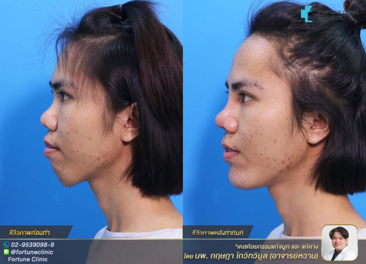 เคสยาก แก้คางเลื่อนอยู่ผิดตำแหน่ง และแก้จมูกปลายเอียง รูจมูกไม่เท่ากัน
