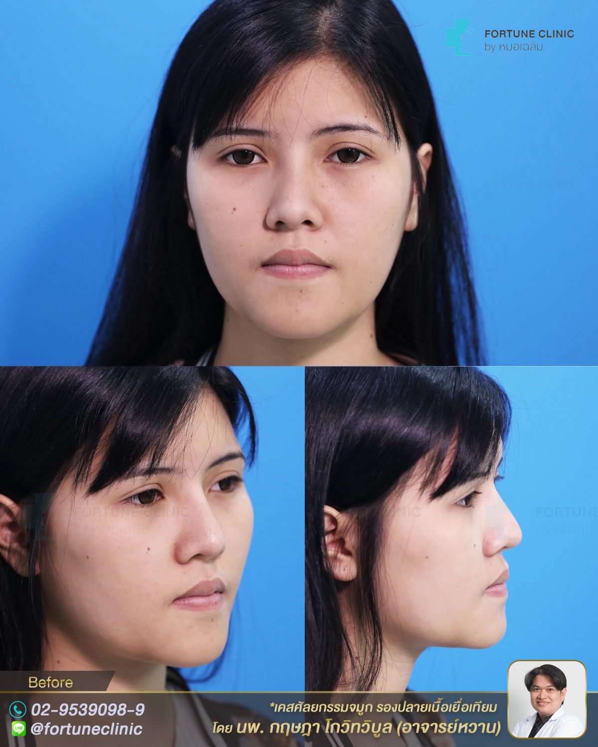 เดิมคนไข้มีสันจมูกอยู่แล้ว แต่ทรงแข็ง ดูจมูกสั้น ปลายใหญ่สั้น ต้องการให้หน้าดูหวานสวยขึ้น