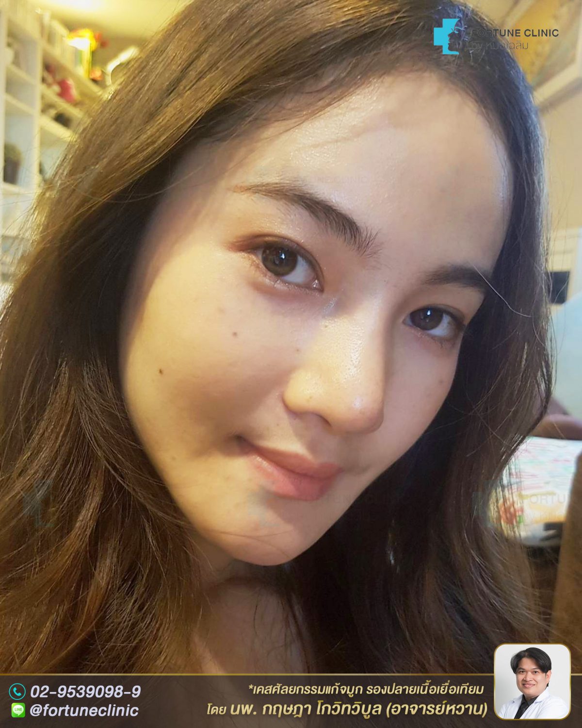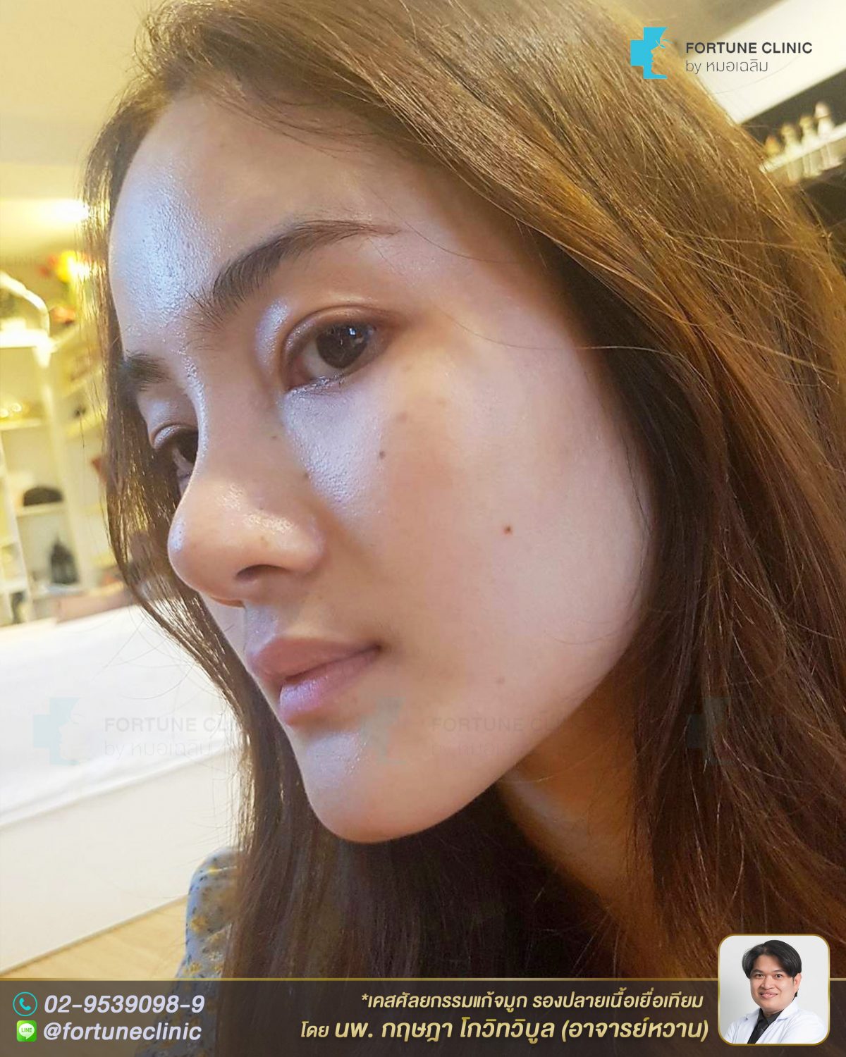 หลังเสริมคนไข้หน้าหวานดูละมุนขึ้น รูปจมูกดูเรียวเล็กลง เรียวสวยเป็นธรรมชาติ หน้าดูเด็กลง ปลายจมูกเรียวเล็กลงพุ่งสวย ทรงปีกสวยขึ้นจากการเสริมยกปลาย ใบหน้าสวยหวานดูเป็นธรรมชาติขึ้นมากค่า