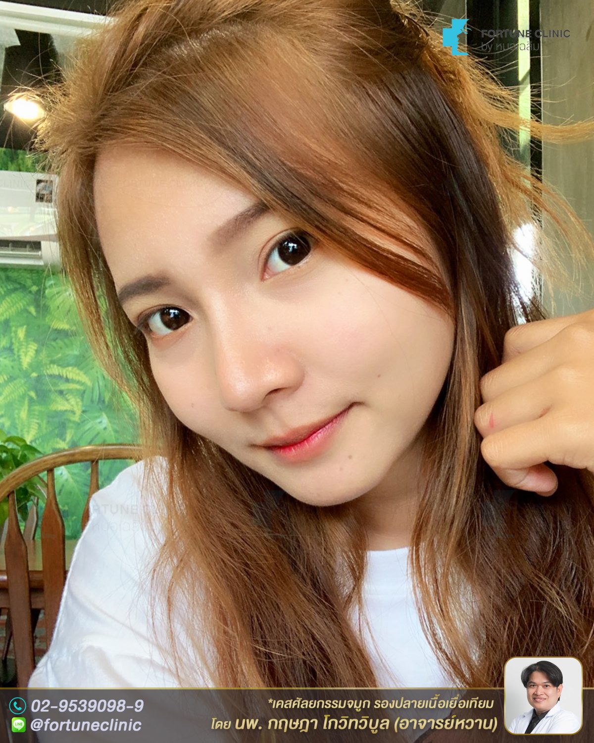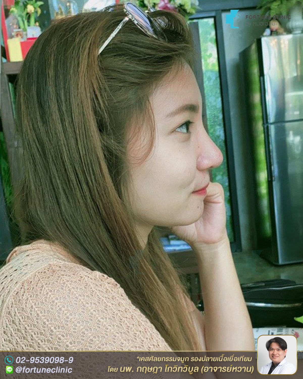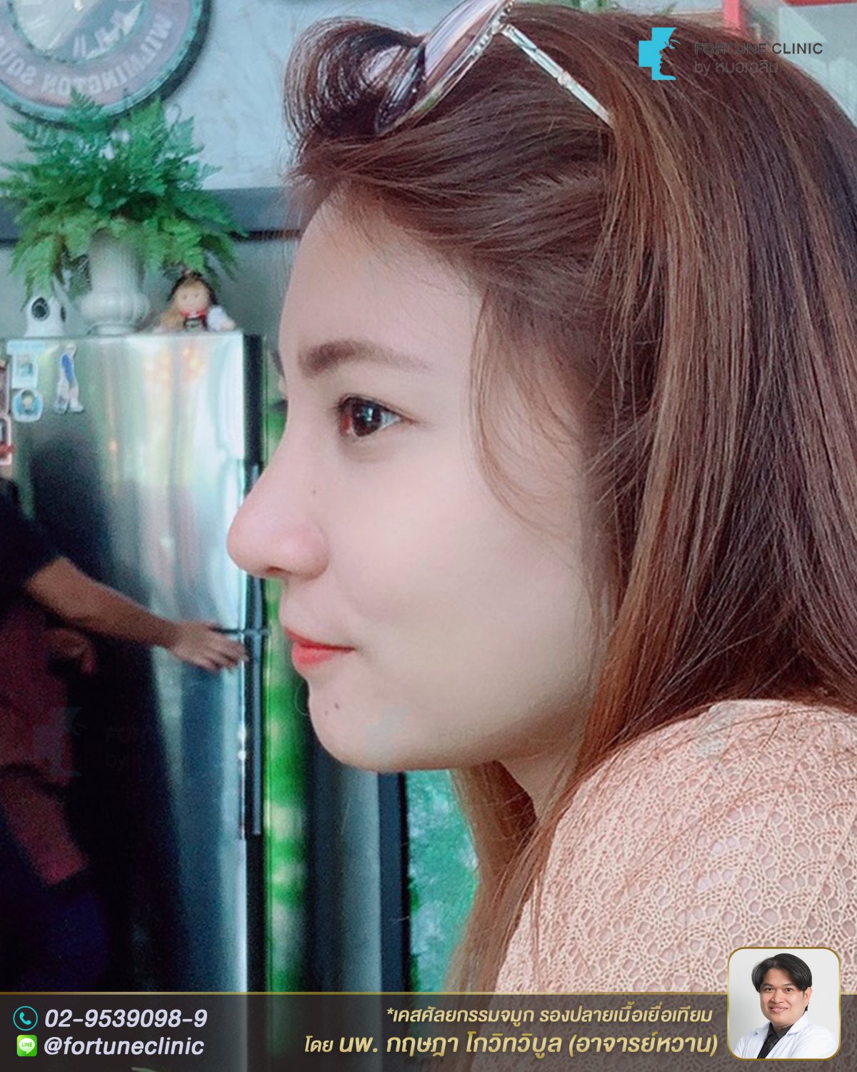 หลังเสริมจมูก รูปหน้าเรียวสวยมีมิติมากขึ้น โด่งสวยและเนียนเป็นธรรมชาติ ทรงจมูกดูยาวขึ้น เรียวเล็กลง ปลายจมูกสวยเนียน มิติพุ่งขึ้นไม่ดูงุ้มแล้วค่า ปีกจมูกดูเรียวเล็กลงโดยไม่ต้องตัดปีกเลยค่า