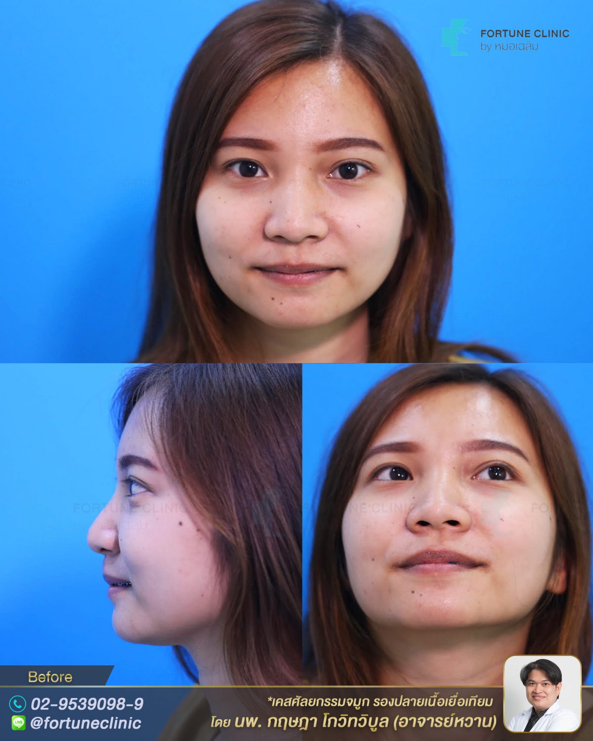 – รองปลายจมูกด้วยเนื้อเยื่อเทียม แต่งปลายยาวพุ่งขึ้น และป้องกันปลายบางใสในระยะยาว